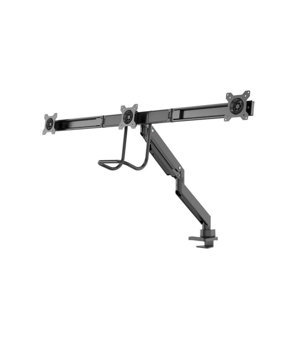 The Neomounts Select NM-D775DX3BLACK is a tilt-, swivel and rotatable desk mount with crossbar and handle for three flat screens up to 24". This mount is a great choice for space saving placement on desks using a desk clamp or grommet mount. Neomounts Selects unique tilt (20°), rotate (360°) and swivel (180°) technology allows the mount to change to any viewing angle to fully benefit from the capabilities of the flat screen. The mount is easily individually height adjustable to 60 centimetres using a gas spring. Depth adjustable from 0 to 63 centimetres. A unique cable management conceals and routes cables from mount to flat screen. Hide your cables to keep the workplace nice and tidy. The mount is equipped with a 180° stop mechanism. Neomounts Select NM-D775DX3BLACK with handle has three pivot points and is suitable for most screens up to 24" (61 cm). The weight capacity of this product is 2 to 18 kg (max. 6 kg each screen). The desk mount is suitable for screens that meet VESA hole pattern 75x75 or 100x100mm. Different hole patterns can be covered using Neomounts Select VESA adapter plates. By using an ergonomic mount neck- and back complaints can be avoided. Ideal for use in offices and on counters or in a reception area. All installation material is included with the product.