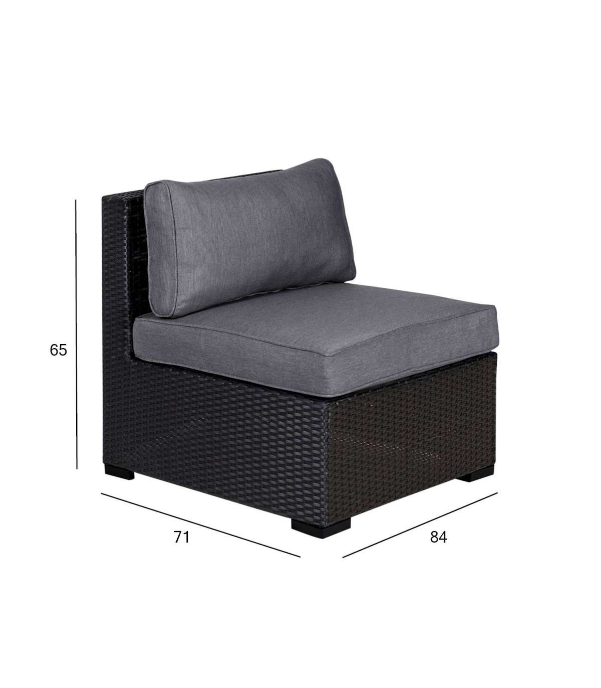 Diivani vahemoodul SEVILLA NEW 71x84xH65cm, must. Mooduldiivan on suurepärane võimalus luua sobiva kuju ja suurusega istumiskoht, mida on lihtne muuta ja ümber paigutada. Diivani raam on valmistatud alumiiniumist ja kaetud plastikpunutisega. Padjad kuuluvad komplekti. Padjakatted on valmistatud hallist polüesterkangast. Istmepadja mõõdud on 72x72xH12cm, seljatoepadja mõõdud 72x36x13cm. Istme kõrgus raami ääreni 30cm, koos padjaga 42cm. Toode on muutlikes ilmastikutingimustes hästi vastupidav ja lihtsalt hooldatav. Kaitset ilmastikuolude eest vajavad ainult padjad. Välitingimustes kasutatava mööbli eluea pikendamiseks soovitame kasutada välimööbli katteid. Moodulite ühendusklambrid ei kuulu komplekti. HOIUSTAMINE: suvehooaja lõppedes soovitame aiamööblit hoiustada siseruumides. Puhastage ja kuivatage mööbel enne hoiule panekut. Kasutage hoiustamiseks kuiva ning hea ventilatsiooniga ruumi.