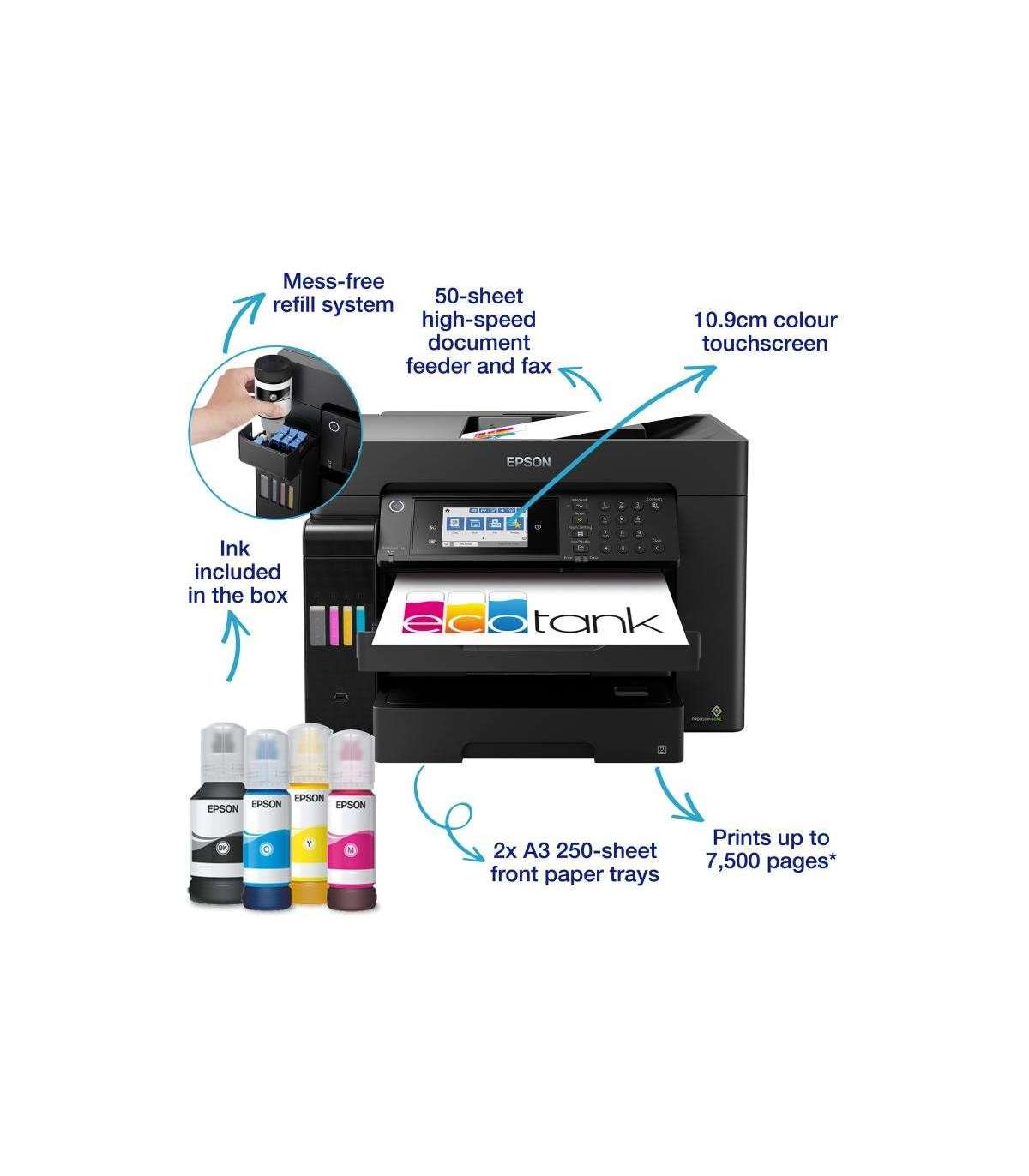 Mit einer Tintenfüllung kann dieser EcoTank-Drucker mehrere Tausend Seiten drucken, und in den beiden vorderen DIN-A3-Papierfächern ist Platz für bis zu 500 Blatt. Sparen Sie Zeit dank des großzügigen hinteren 50-Blatt-Einzugs und A3-ADF.