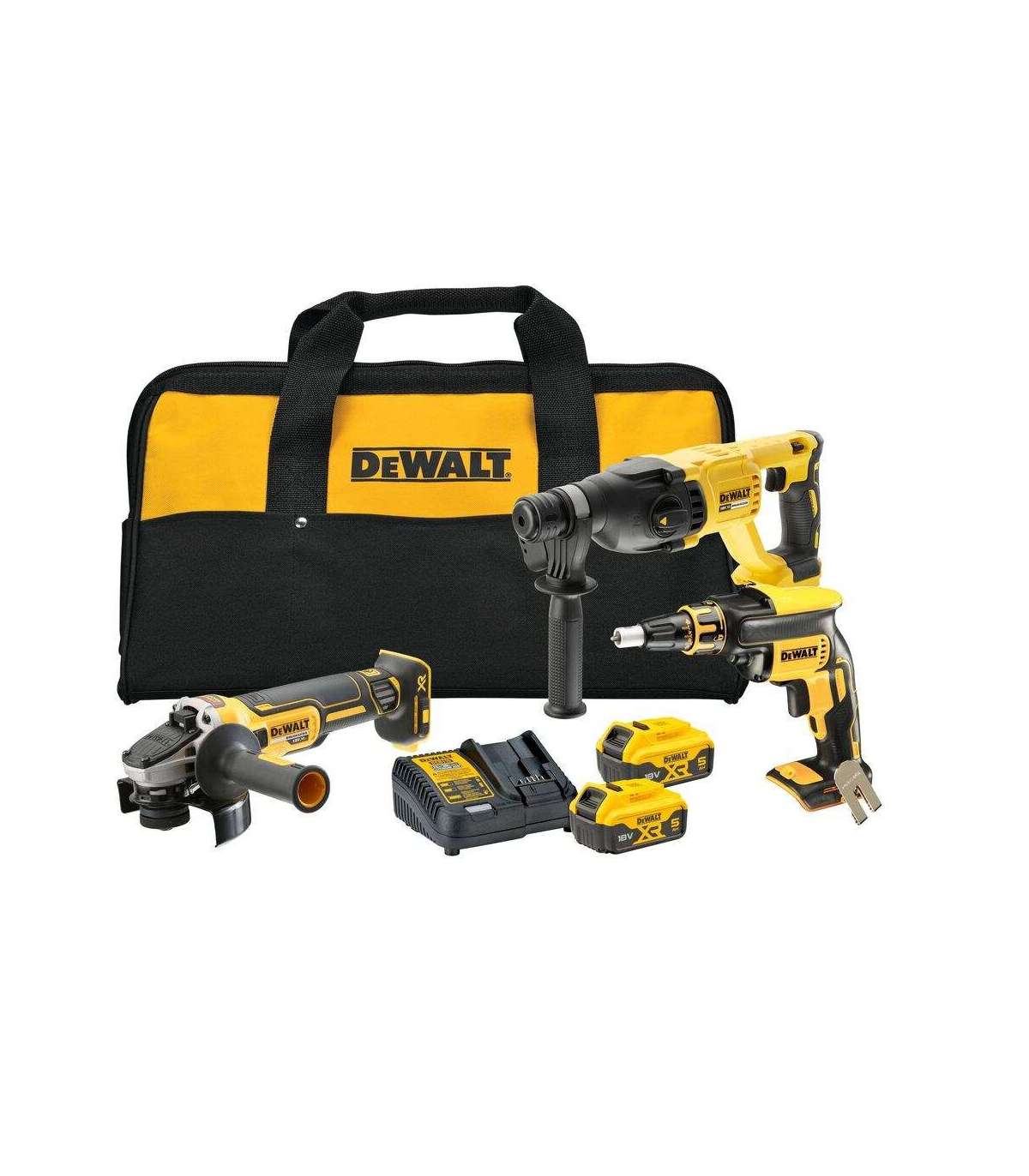 DCF620 screwdriver, DCH133 hammer drill, DCG405 grinder, 2 XR 18V 5 Ah batteries, 4A charger, carry bag