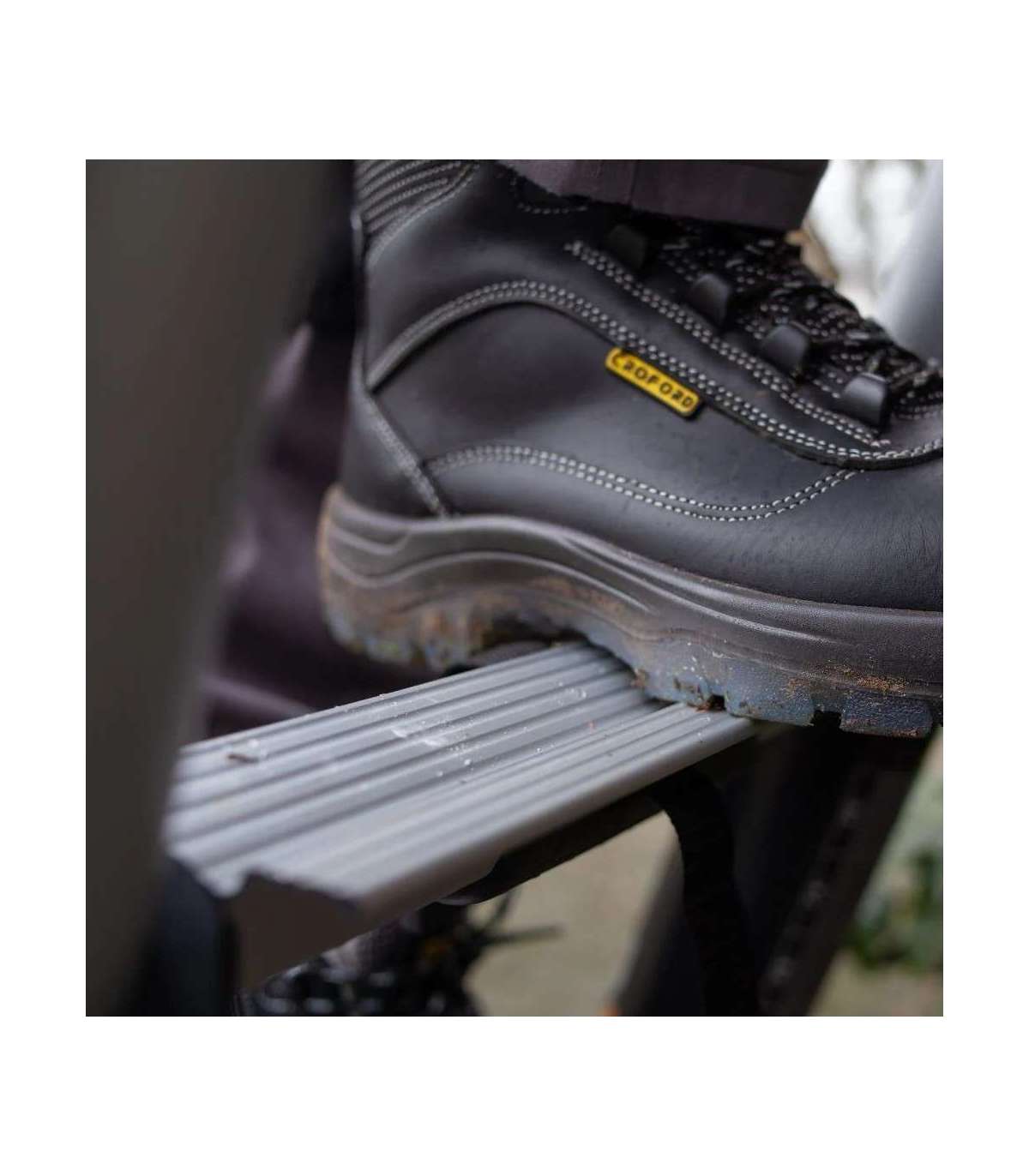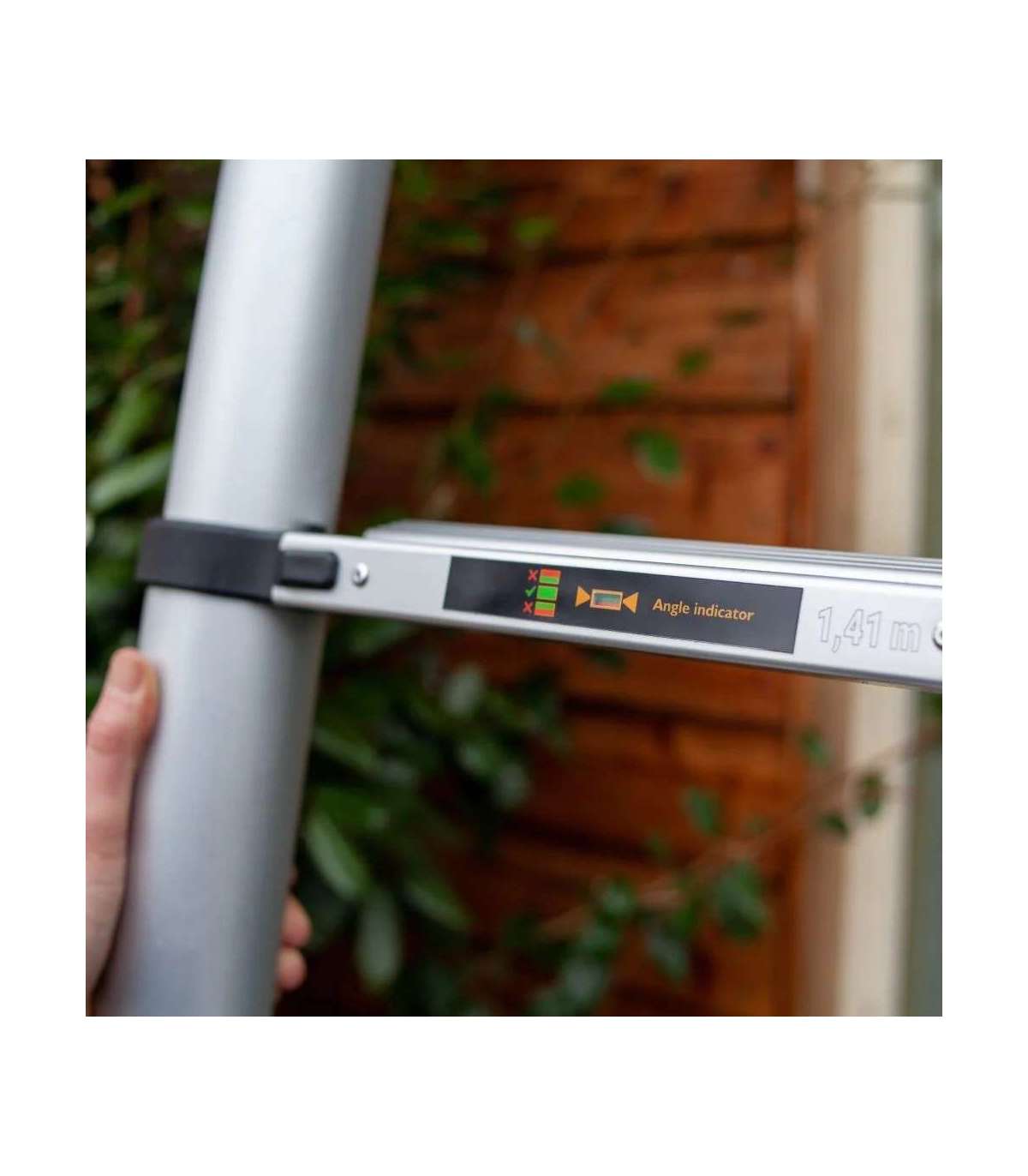 Built-in angle indicator ensures safe ladder positioning; Secure locking system and extra-wide steps for stability; Lightweight, portable design with a carrying sleeve and strap