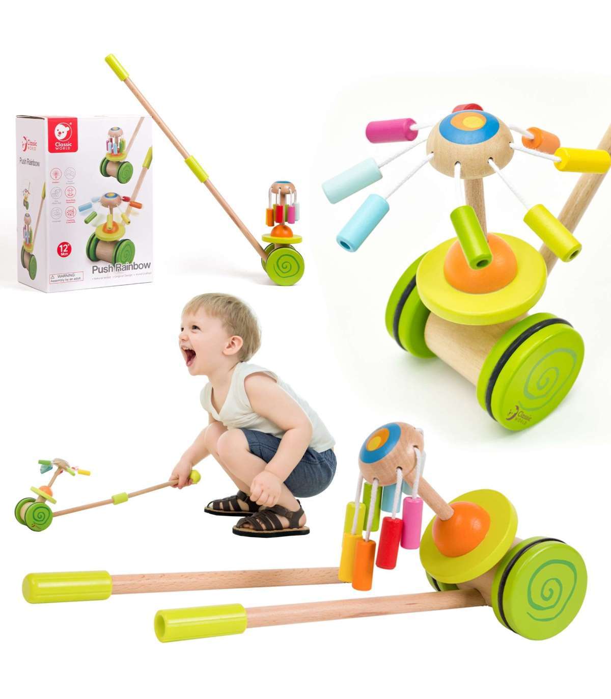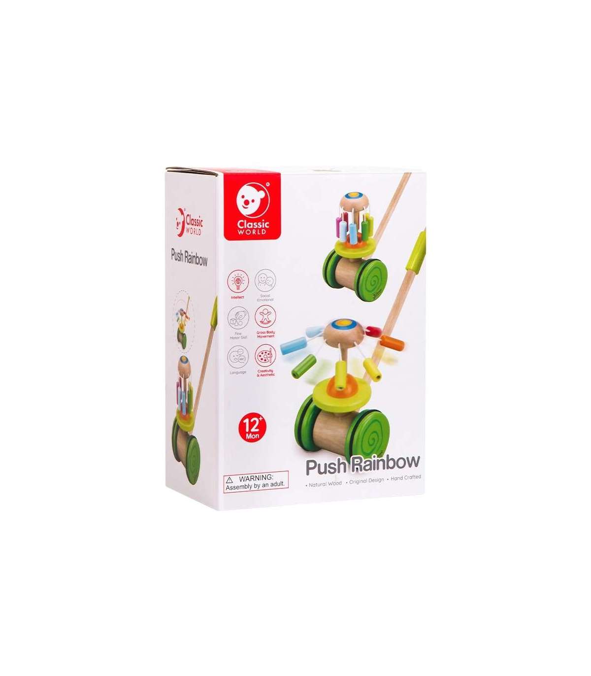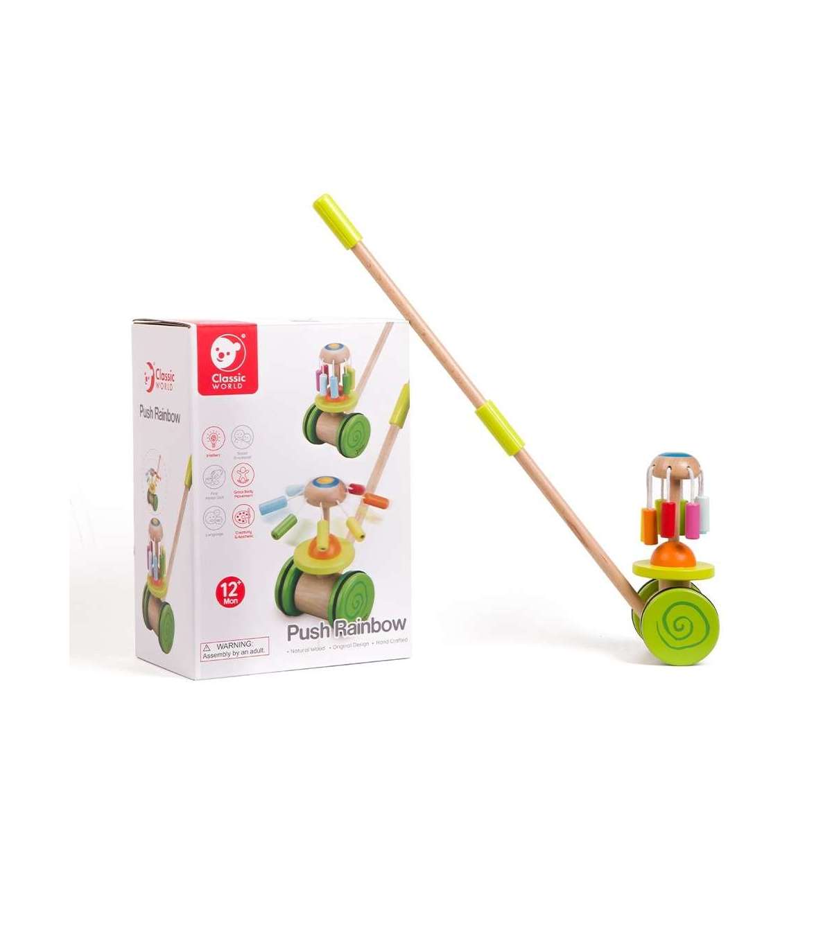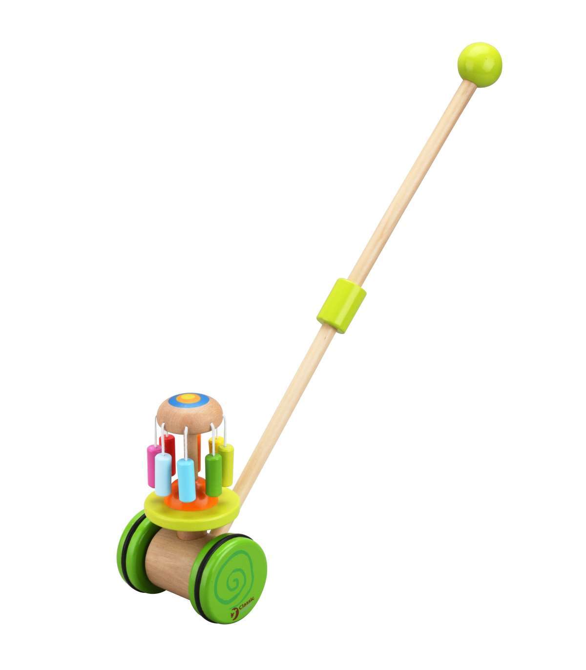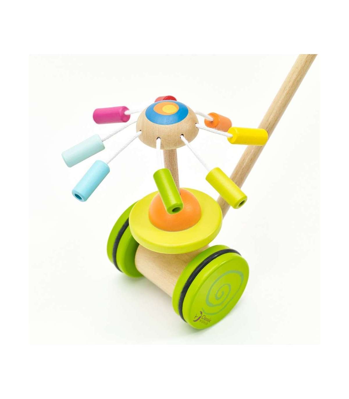 Classic Worldi jalutamiseks mõeldud tõukemängu karussell on ideaalne esimene samm sinu väikese jaoks iseseisva kõndimise maailma. Värviline tõukemäng julgustab last liikuma ja arendab motoorikat meeldival viisil. Sisseehitatud karussell vikerkaare värvides mitte ainult ei püüa tähelepanu, vaid tekitab ka õrna, meloodilist heli. Tänu stabiilsele konstruktsioonile võivad vanemad olla rahuliku südamega oma laste turvalisuse pärast. Lihtsasti tõukatav käepide lubab lapsel iseseisvalt harjutada kõndimist, ja sina võid nautida rahu jalutuse ajal.