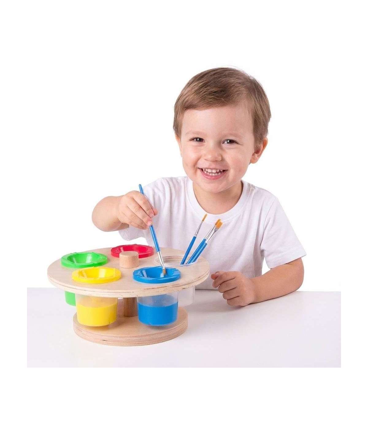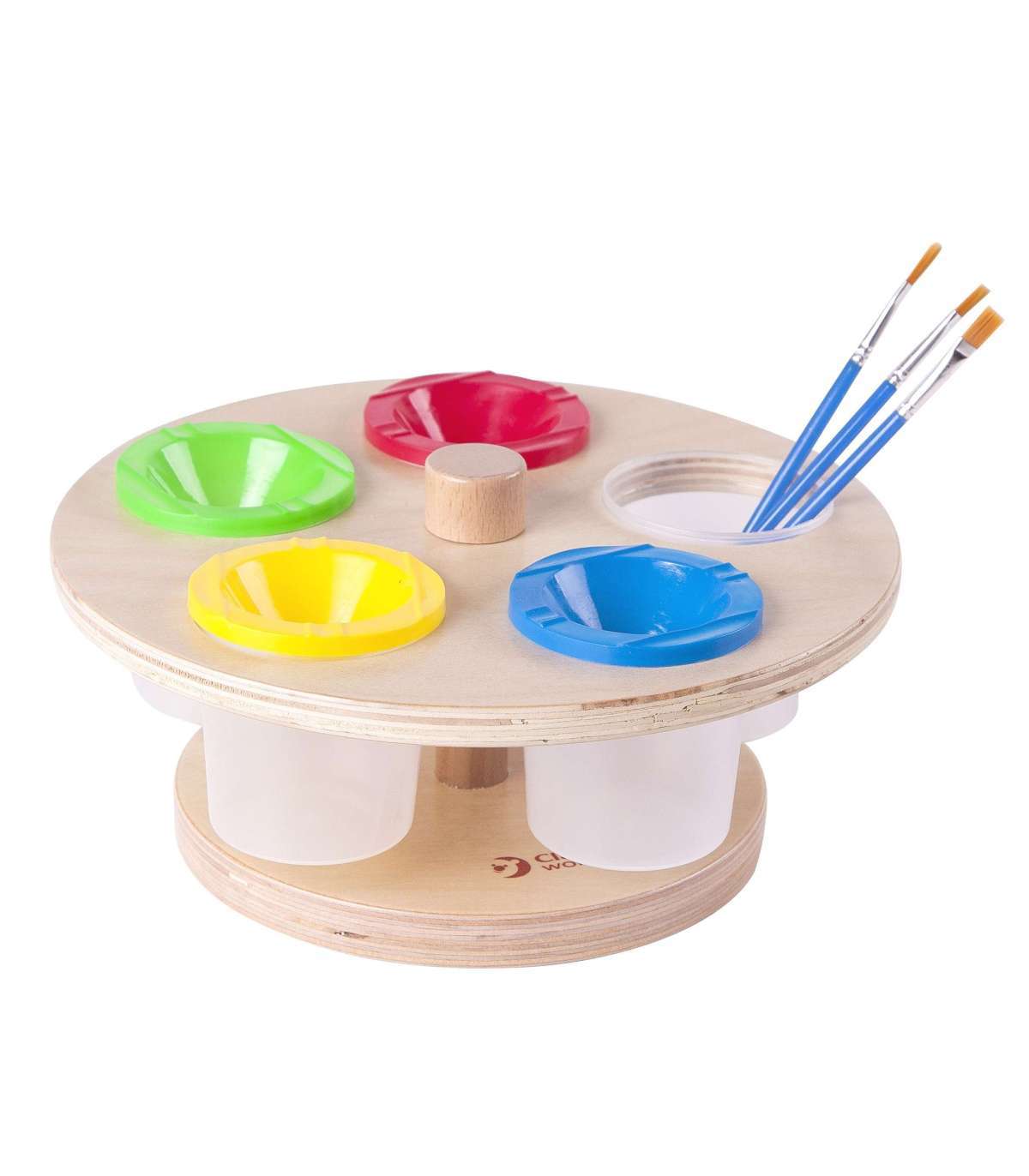Pöörlev värviteline kaubamärgilt Classic World on praktiline ja vastupidav tarvik, mis lihtsustab laste maalimist kodus ja lasteaias. Komplektis on puust teline ja 5 plasttopsi kaantega, mis kaitsevad värve kuivamise eest. Teline on stabiilne ja turvaline – ilma teravate servadeta. See on suurepärane lahendus väikestele kunstnikele, mis aitab hoida korda loomingulise mängu ajal.