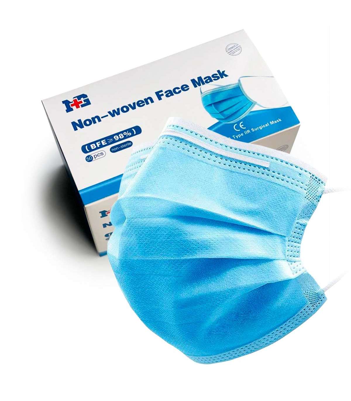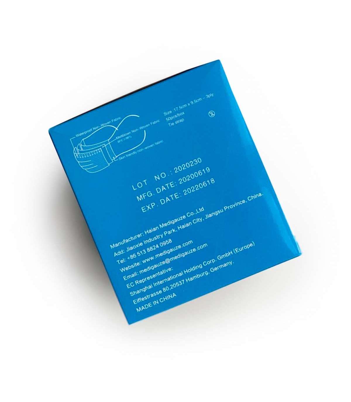 Sertifitseeritud meditsiiniline kolmekihiline ühekordselt kasutatav näomask katab nina ja suu ning aitab vältida vedelate ja materiaalsete osakeste levikut.