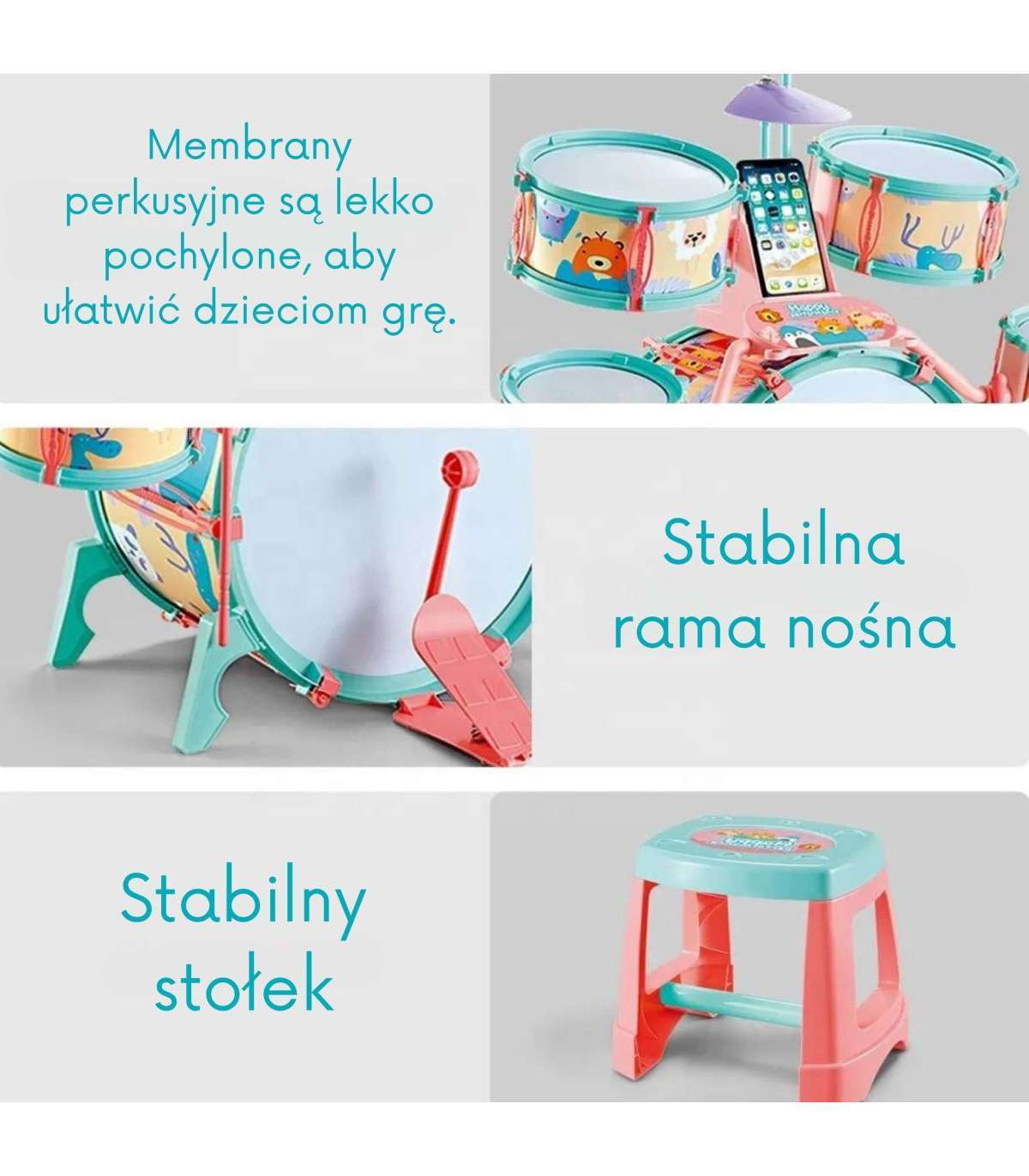WOOPIE Perkusja Edukacyjna dla Dzieci 5 Bębnów 1 Talerz + Taboret z Motywem Zwierzątek