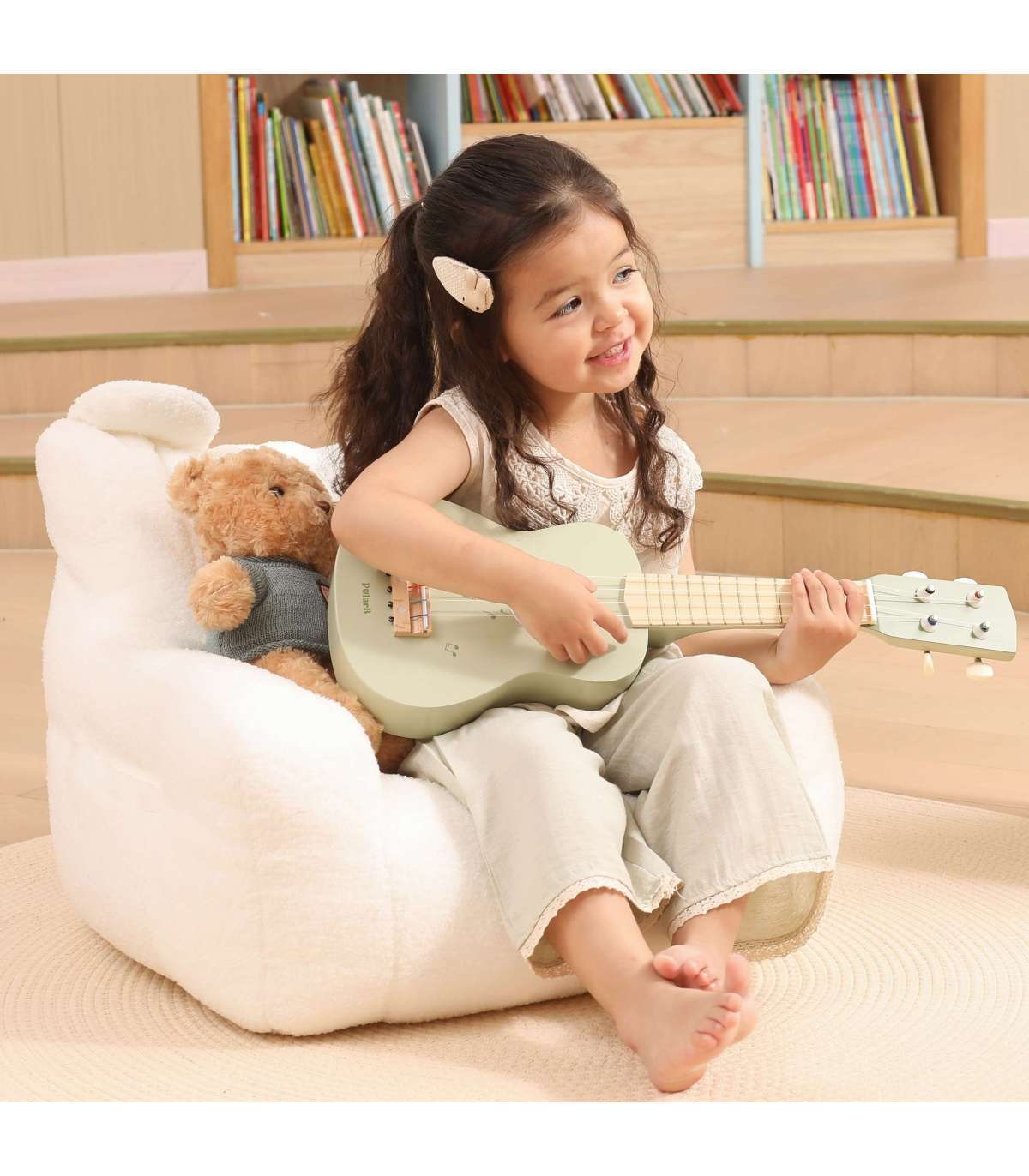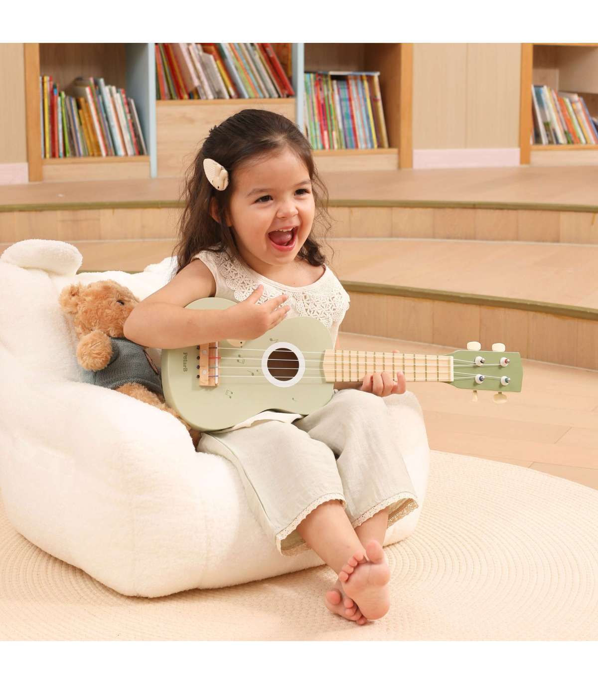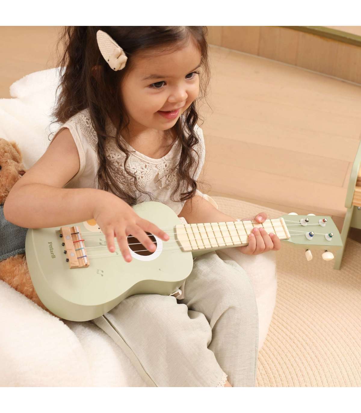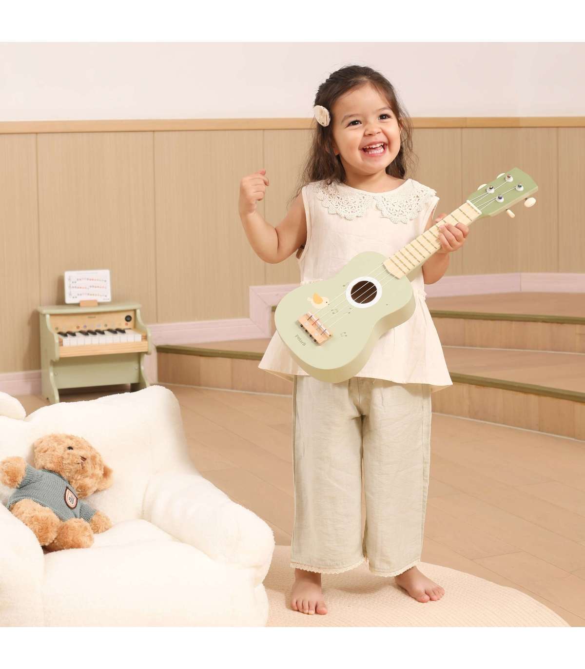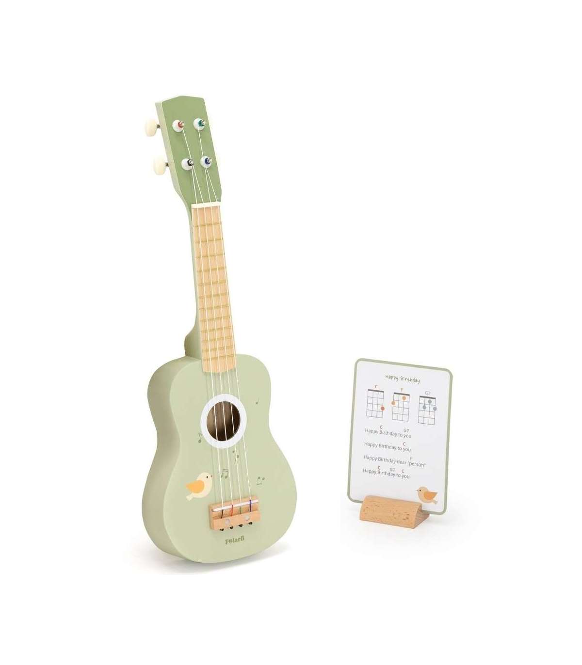 Avastage oma lapse muusikaline talent meie armsa puidust ukulelega! See eriline mänguasi ei paku ainult palju rõõmu, vaid arendab ka kuulmist, rütmitunnet ja koordinatsiooni. Nelja keelega saab laps luua esimesi meloodiaid ning komplekti kuuluvad noodid laulule Happy Birthday võimaldavad tal kohe muusikalise seikluse alustada!