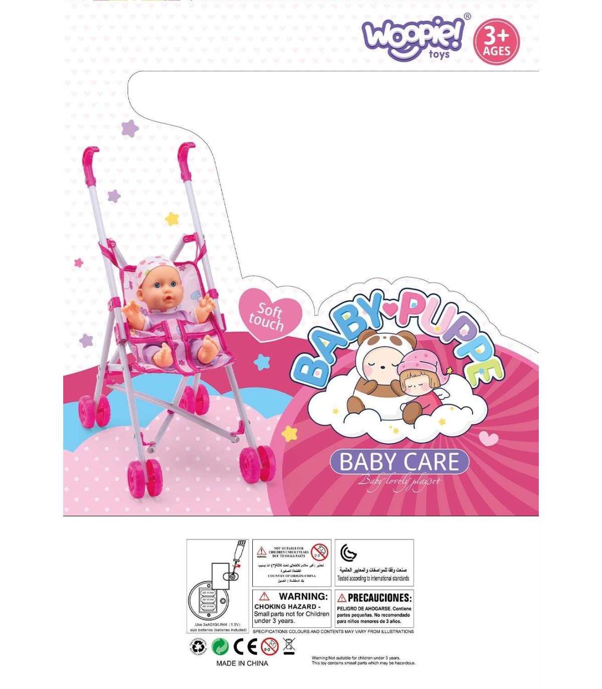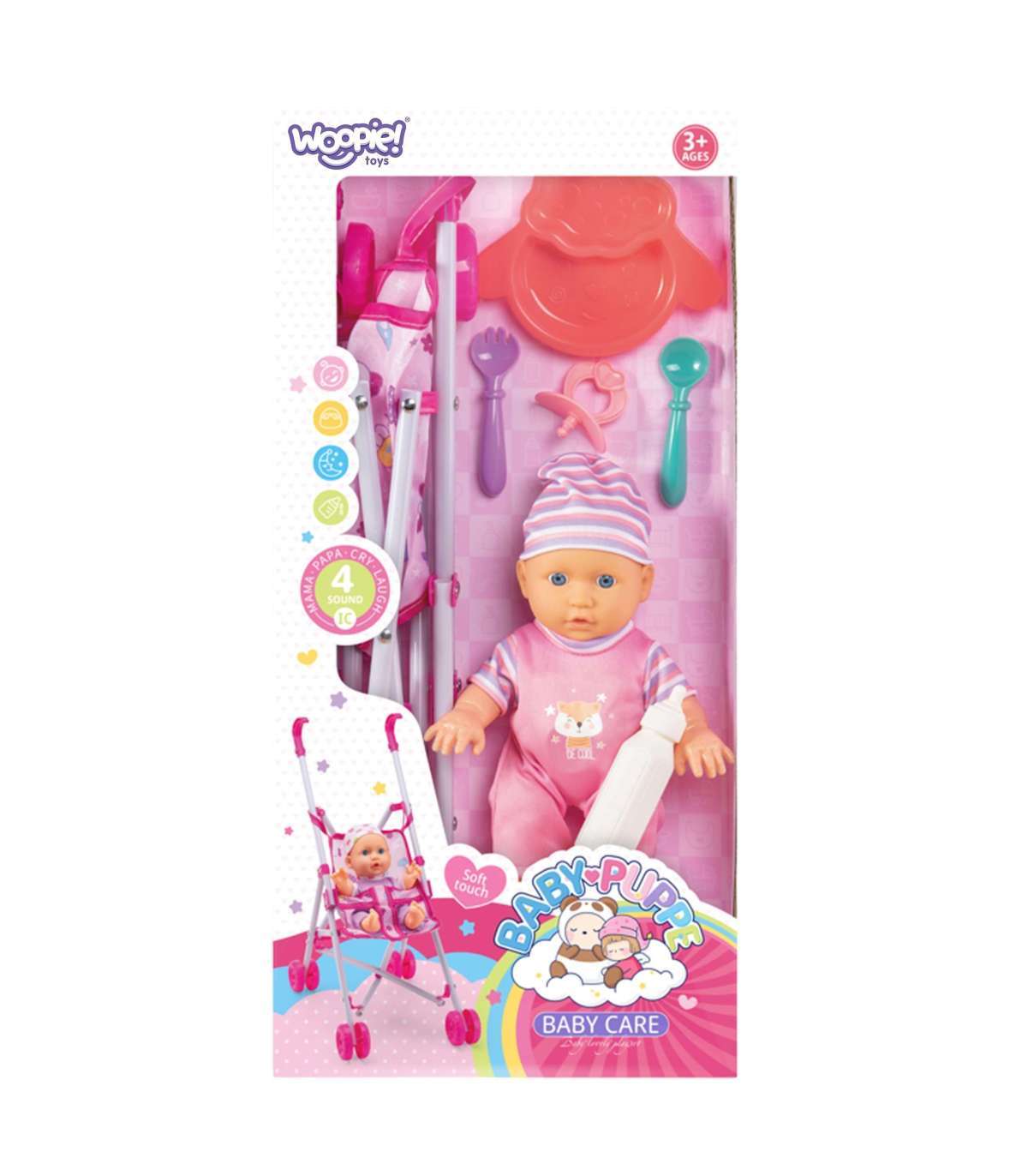 Beebi nukk vankri ja toitmis komplektiga brändilt WOOPIE on ideaalne esimene nukk lapsele, kes soovib jäljendada täiskasvanute käitumist beebidest hoolitsemisel. Nukk teeb helisid nagu ema, isa, nutt või naer, mis lisab mängule veelgi realismi. Laps saab teda toita või viia jalutama tänu komplekti kuuluvale vankrile.