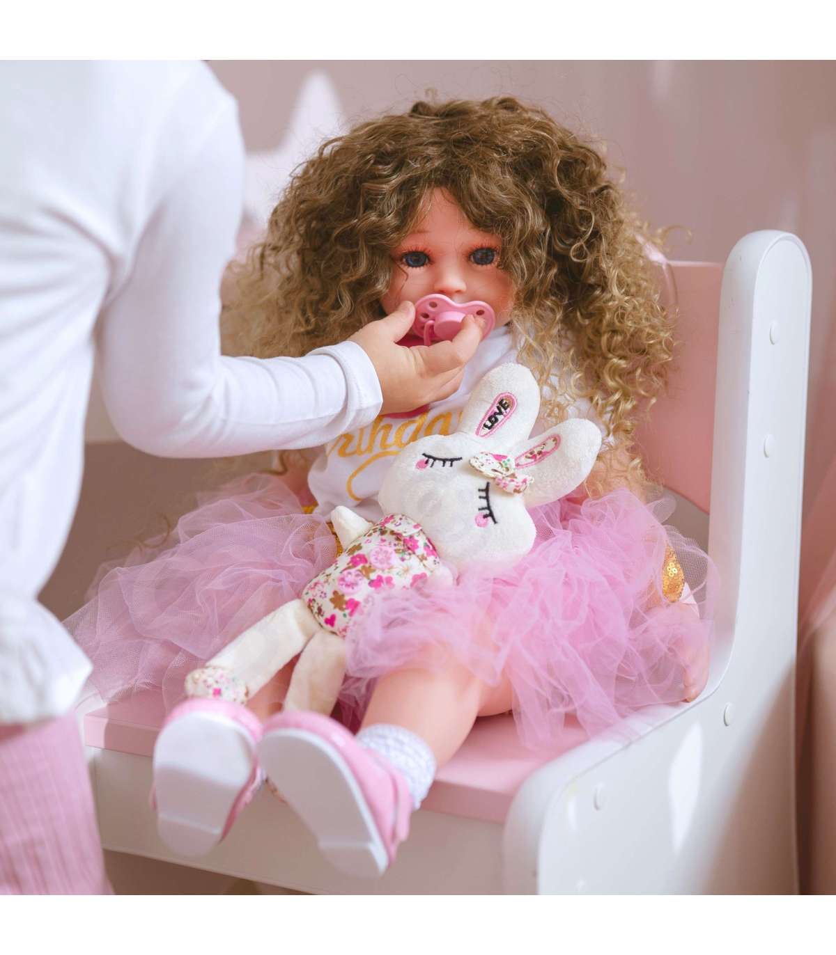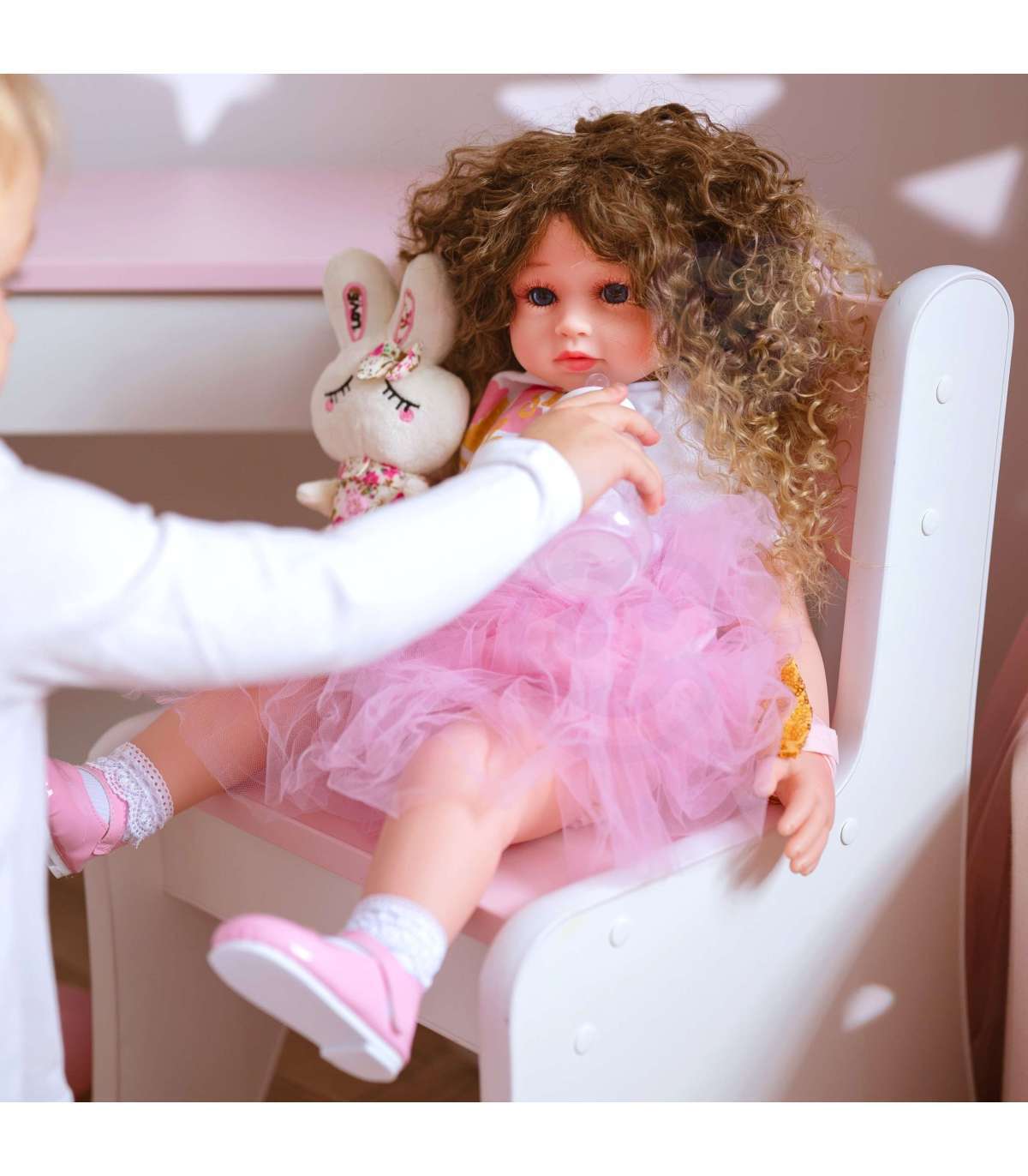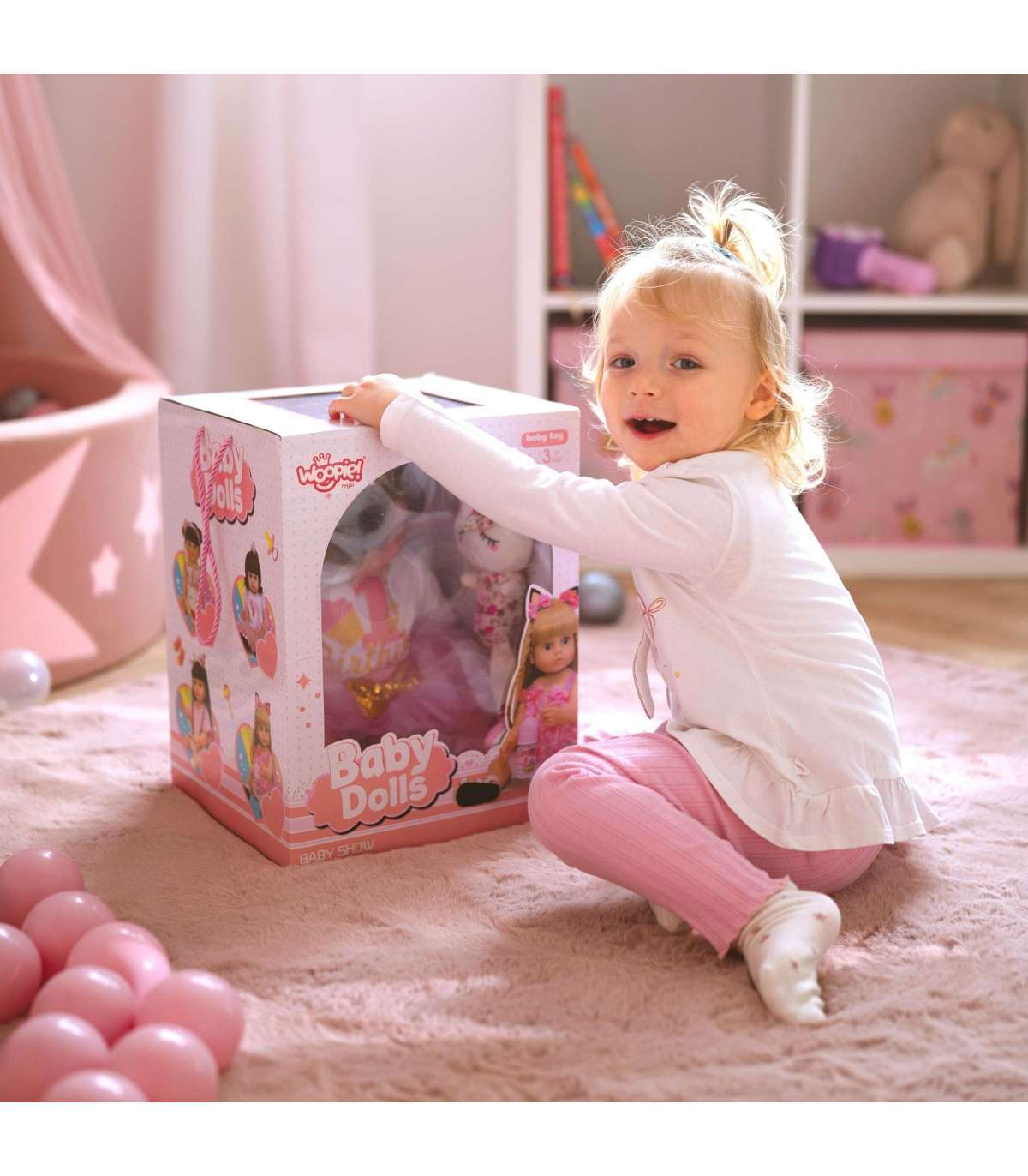 Interaktiivne nukk brändilt WOOPIE sarjast ROYAL on nagu tõeline laps! Mängides nuku puhul arendab laps empaatiat ja vastutustunnet! Nukk on puudutamisel pehme ning tema kaunid silmad köidavad lapse tähelepanu. Suureks eeliseks nuku juuksed on ilusad, pikad ja läikivad, ideaalsed kammimiseks. Tänu juuste suurepärasele kvaliteedile saab teie laps olla loov erinevate soengute kujundamisel. Nuku käed on detailsed, lisades realismi õrnade küünte kaudu, ning kergelt punetavad põsed rõhutavad nuku ilu. Palju elemente komplektis - mäng ei lõppe, väike mängija on rõõmus ja teil on kindel meel, et ta veedab aega väärtuslikul mängul. Meie nukud on valmistatud suurima täpsuse ja hoolikusega detailide suhtes, et välja näha nagu ehtsad. Nukul on seljas roosa-must kleit armsate lipsukestega. Kleit on vöökohast lõigatud ja kaunistatud värvilise trükiga. Komplekti kuuluvad roosad kingad ja sobiv peapael tüdrukule.