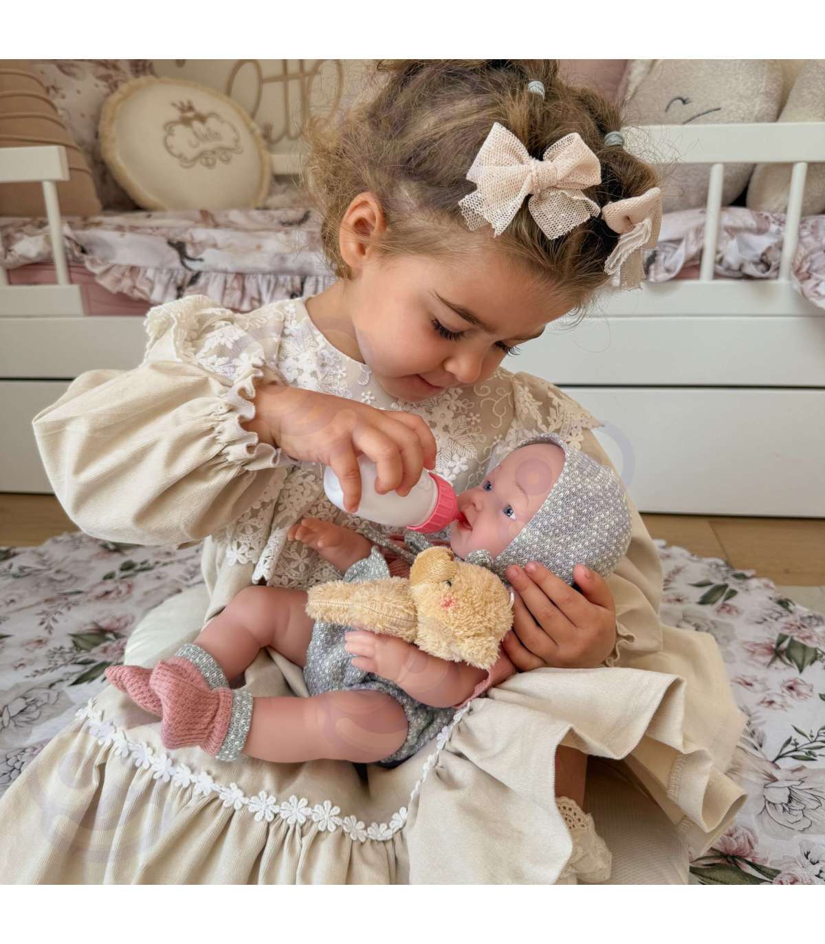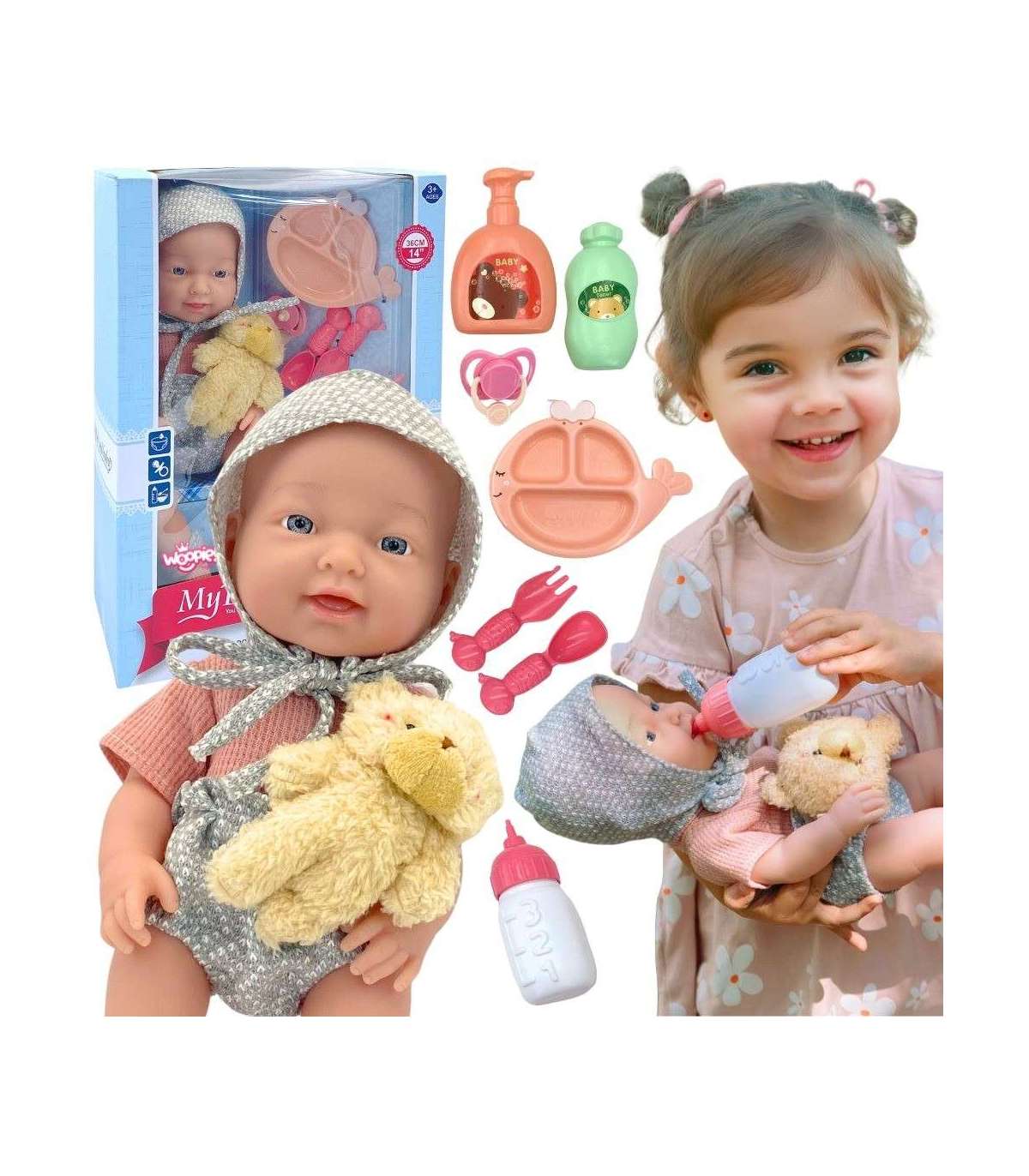 Bobas Minu armastatud nukk brändilt WOOPIE ROYAL on kõrge kvaliteediga, hoolikalt valmistatud toode, mida su laps kindlasti armastab. Nukk on riietatud ilusa rõivakomplekti ning tal on sobivad sokid ja müts. Lisaks sisaldab komplekt armsat karu, mida nukk võib vaheldumisi hoida pudeliga. Nukul on liikuvad jäsemed ja komplektis olev lut saab panna suhu.