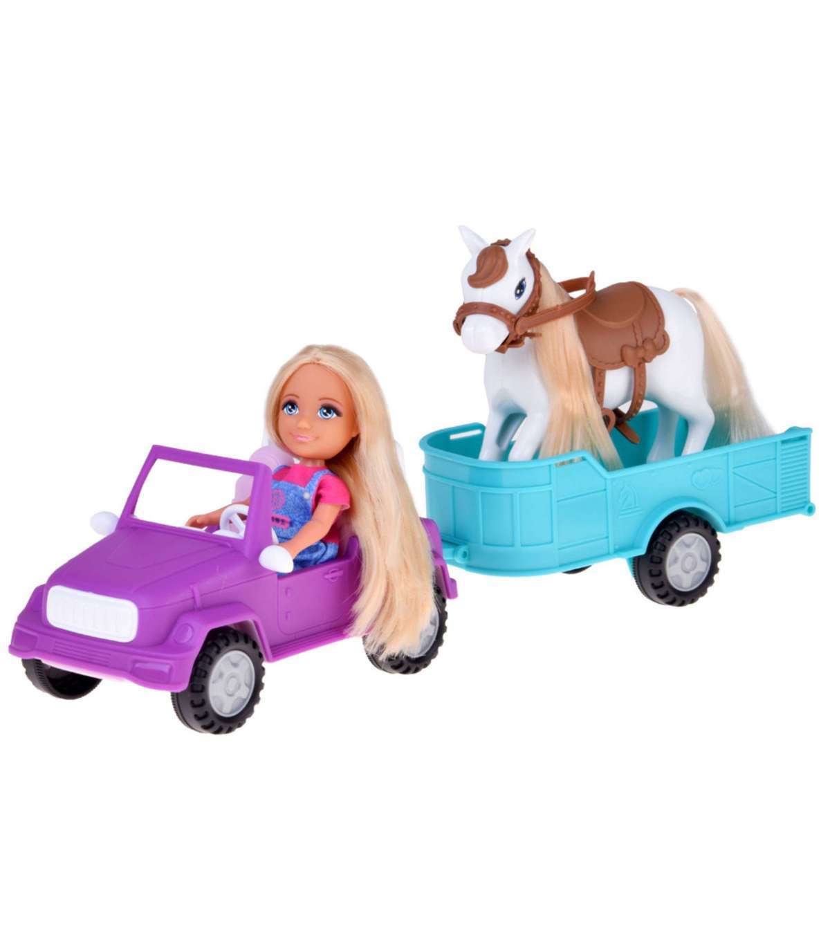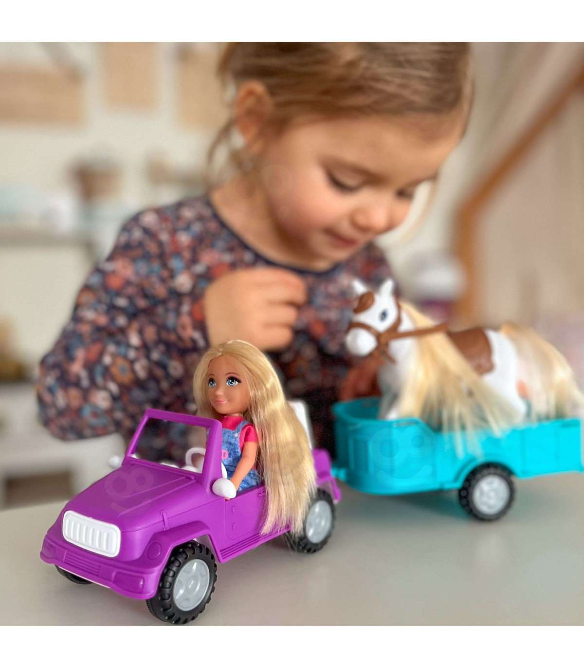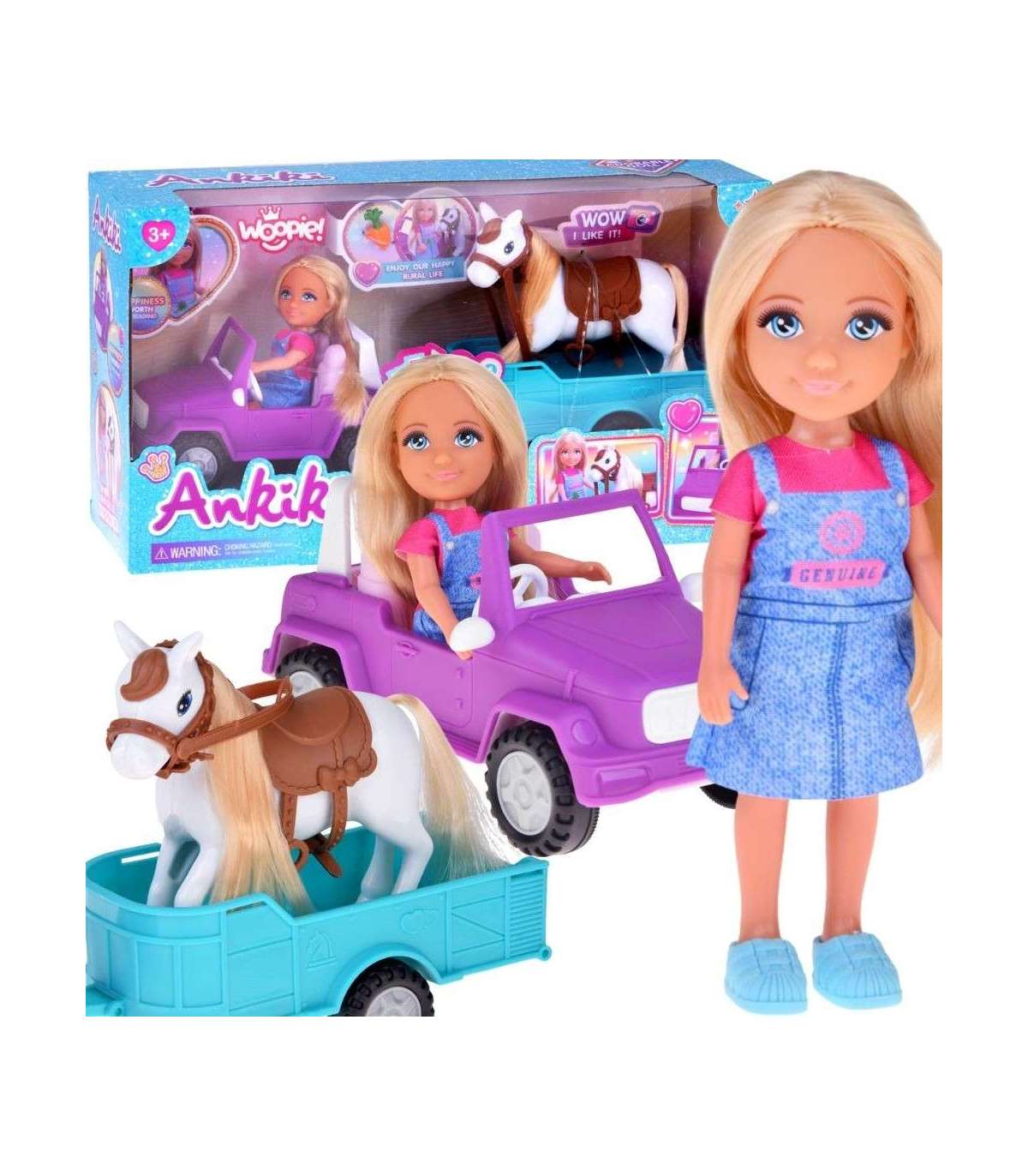 Wyrusz na wiejskie przygody z zestawem Kiki Lalka z Koniem, Samochodem i Przyczepą od marki Woopie! Ten obszerny zestaw do odgrywania ról z motywem ranczo/farmy zawiera mini lalkę, która potrafi usiąść za kierownicą fioletowego pojazdu terenowego. Doczep do niego turkusową przyczepę, aby przewieźć swojego konia! Lalka ma długie, blond włosy, które można czesać, a koń posiada siodło i uzdę. To idealna zabawka, która rozwija wyobraźnię i kreatywność oraz pozwala na tworzenie nieskończonej ilości scenariuszy związanych z życiem na farmie. Zestaw przeznaczony jest dla dzieci od 3 roku życia.