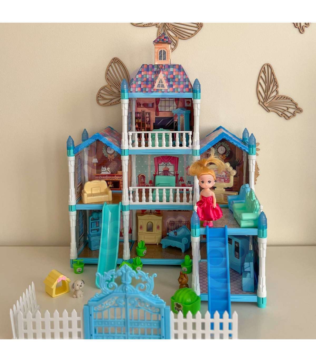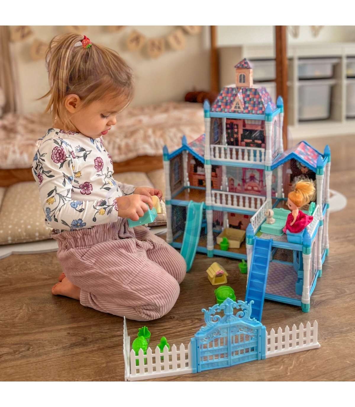 Avasta mängu maagiline maailm nukumaja komplektiga brändilt Woopie! See suur, kolmekorruseline palee pakub lugematuid võimalusi loominguliseks mänguks. Komplekt sisaldab lausa 191 osa, sealhulgas armas nukk, kaks lemmiklooma (koer ja kass), rikkalik sisustus ning kaunid, helendavad dekoratsioonid, mis muudavad mängu lõbusaks ka pimedal ajal. Maja on hoitud armsas sinise- ja roosatoonis värviskeemis, inspireeritud talvisest aiast. Ideaalne kingituseks, julgustab rollimänge, arendades kujutlusvõimet ja sotsiaalseid oskusi.
