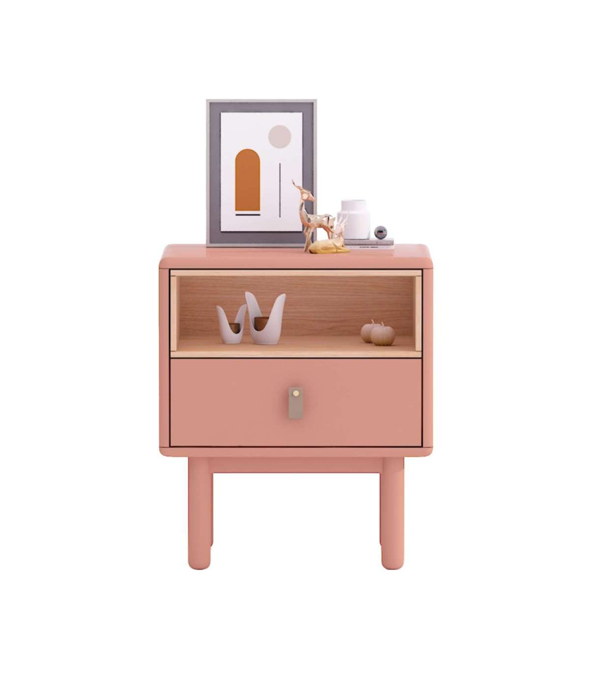 Öökapp IRIS sahtli ja riiuliga 48x40xH55cm, roosa. Öökapp on valmistatud 18mm MDF plaadist. Jalad ja alusraam on valmistatud täispuidust. Kummut on viimistletud vastupidava polüuretaanvärviga. Sahtlil on nahast käepide. Avatud vaheriiul on vooderdatud heleda puiduvärvi plaadiga. Öökapil on ümarad välisservad.
