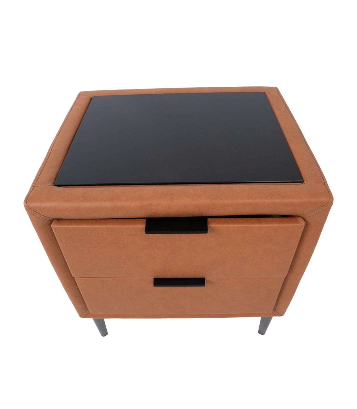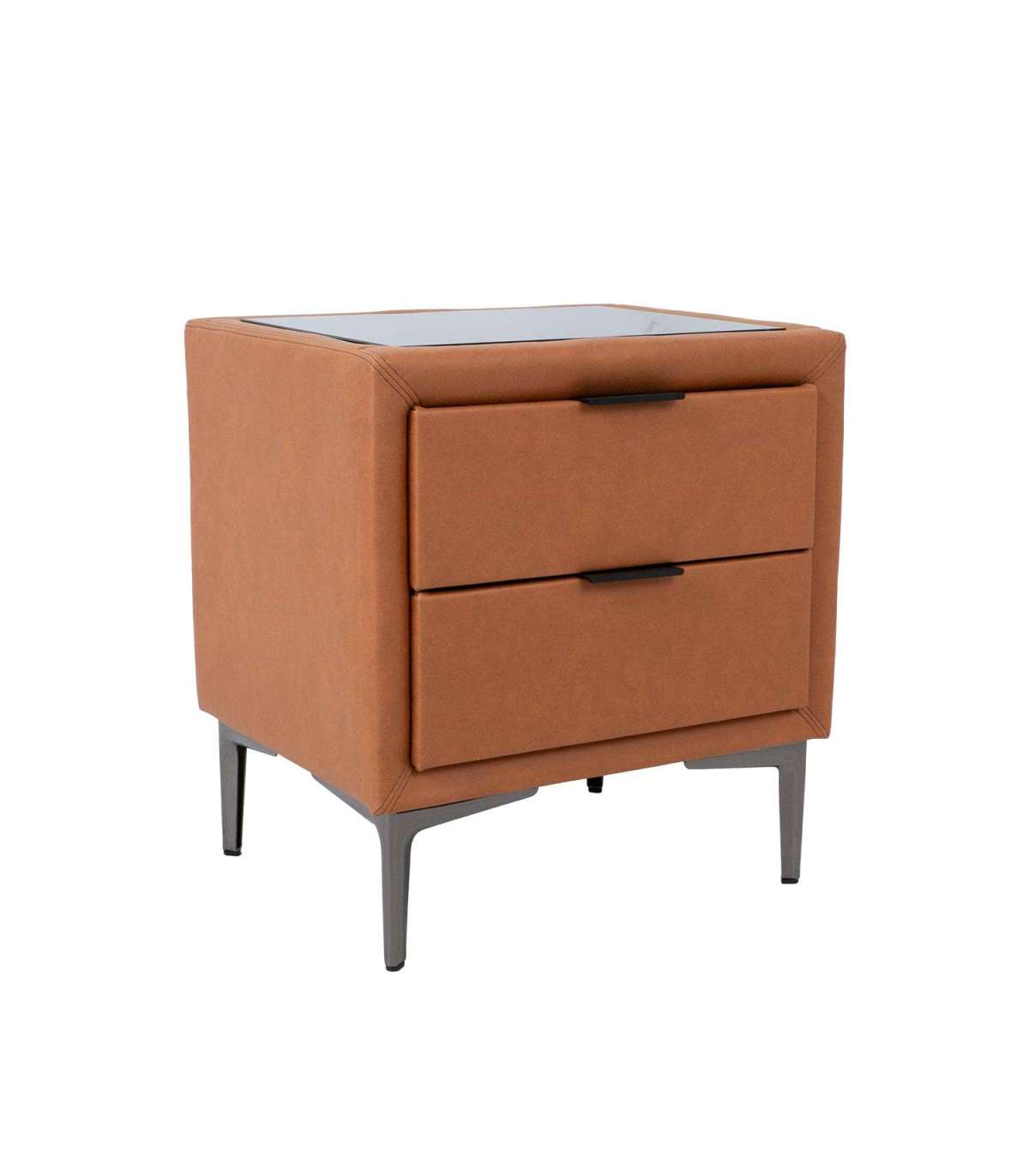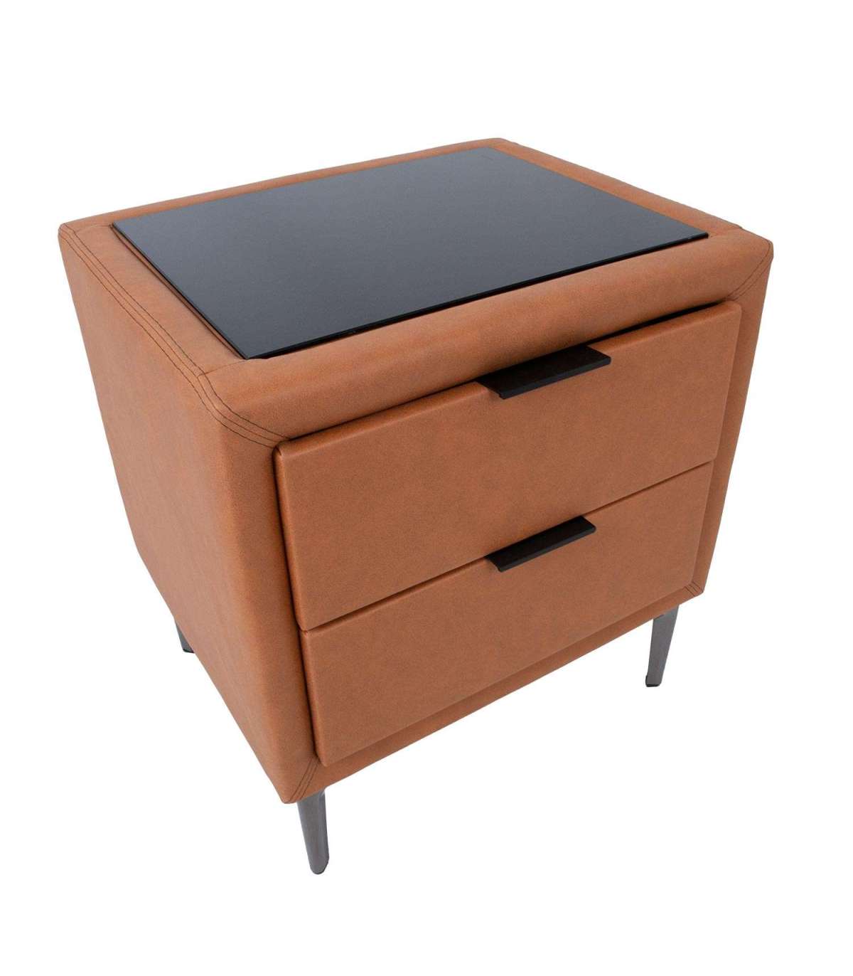 Öökapp LENA 2-sahtliga 50,5x41xH54cm, konjakipruun. Öökapi korpus on valmistatud mööbliplaadist ja kaetud uudse kunstnahka meenutava materjaliga (Leathaire), mis ühendab endas naha kauni tekstuuri ning kanga soojuse. Leathaire on ideaalne mööblikattematerjal, sest on hästi hingav, vett hülgav, kriimustuste kindel ning väga vastupidav. Öökapi peal on tume karastatud klaasist plaat. Öökapil on tumedad metallist jalad ja sahtlite käepidemed.