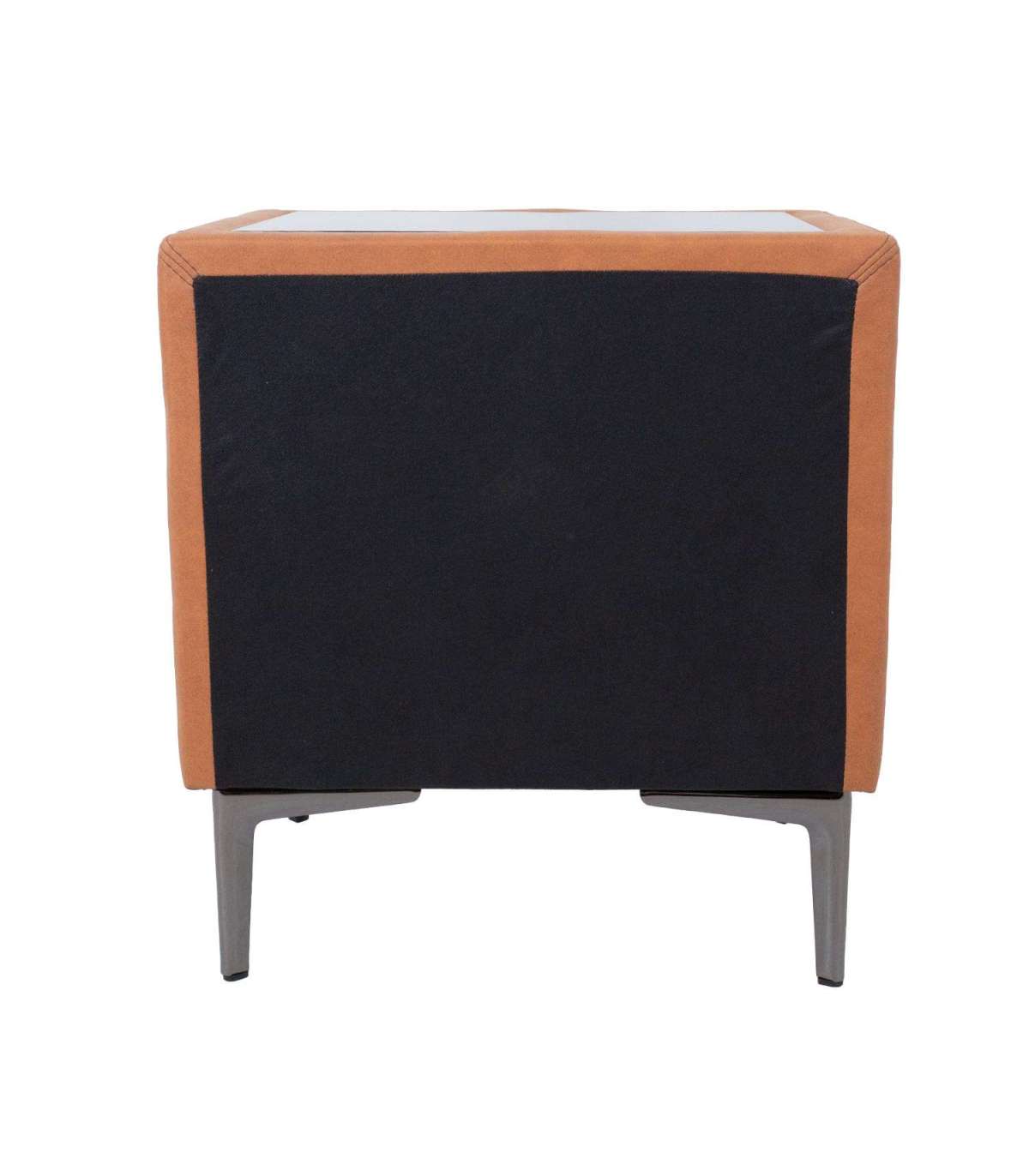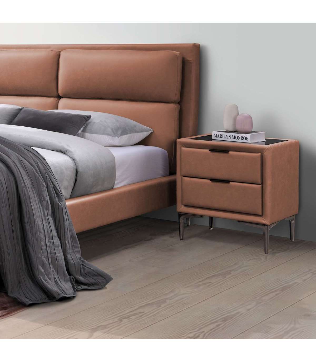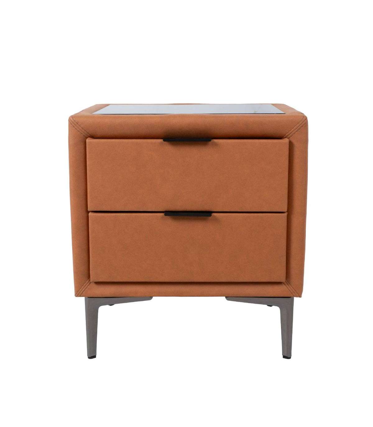 Öökapp LENA 2-sahtliga 50,5x41xH54cm, konjakipruun. Öökapi korpus on valmistatud mööbliplaadist ja kaetud uudse kunstnahka meenutava materjaliga (Leathaire), mis ühendab endas naha kauni tekstuuri ning kanga soojuse. Leathaire on ideaalne mööblikattematerjal, sest on hästi hingav, vett hülgav, kriimustuste kindel ning väga vastupidav. Öökapi peal on tume karastatud klaasist plaat. Öökapil on tumedad metallist jalad ja sahtlite käepidemed.