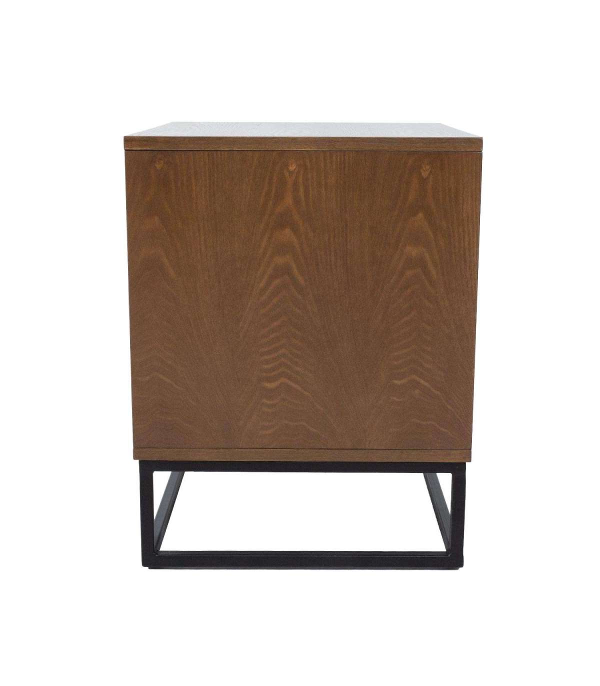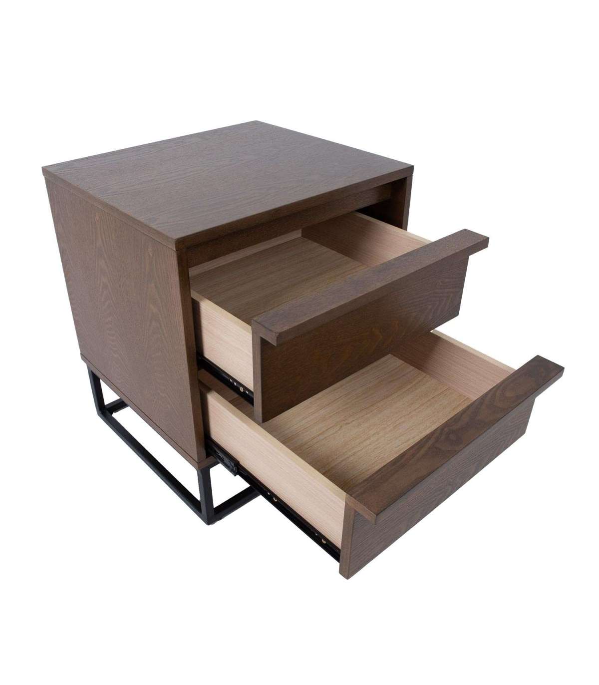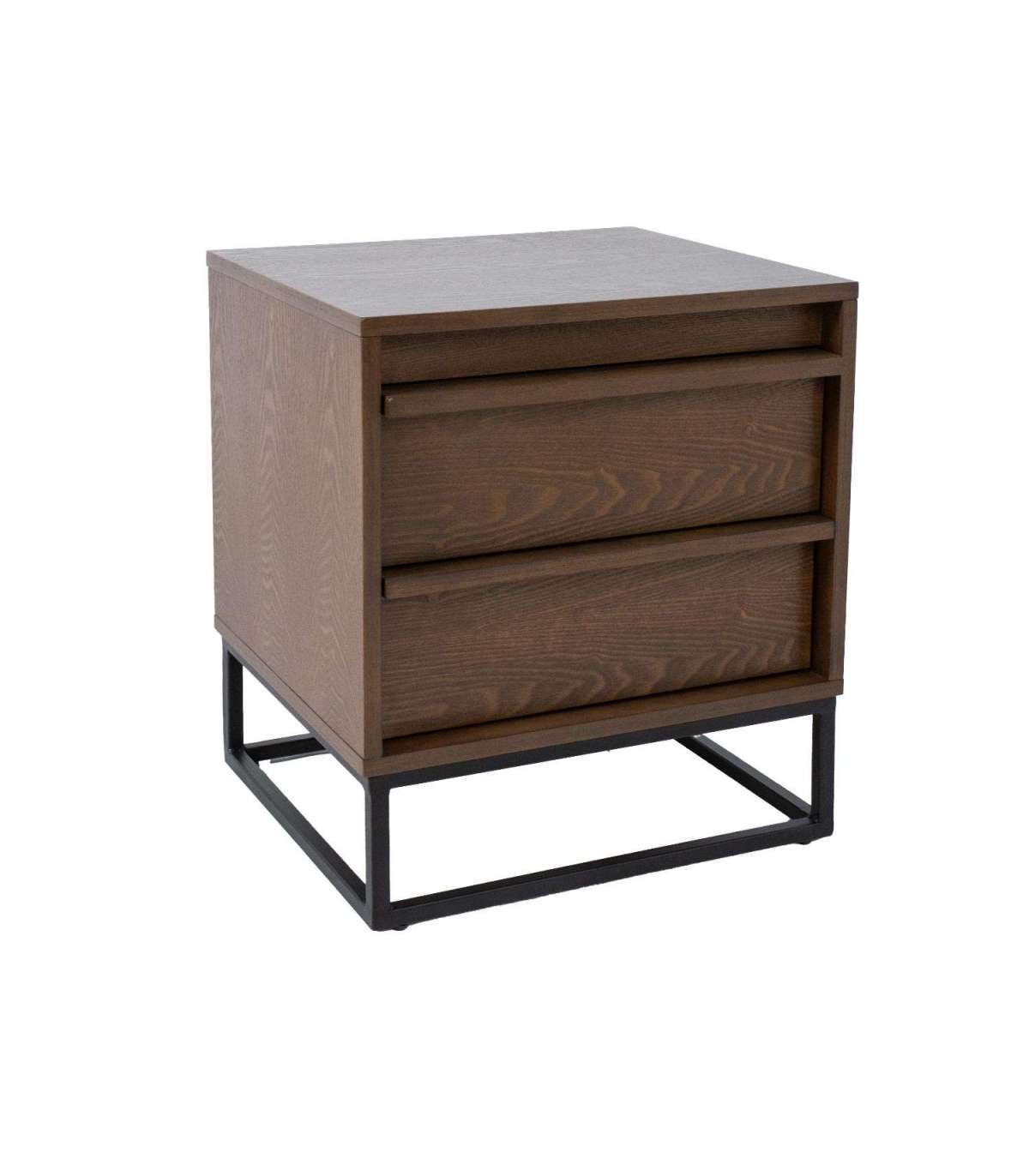 Öökapp VOKSI 2 sahtliga 40x45xH52cm, pähkel. Mööbliplaadist valmistatud öökapp on naturaalse saarespooniga ja viimistletud tumeda pähklitoonis lakiga. Öökapi metallist alusraam on viimistletud musta pulbervärviga.
