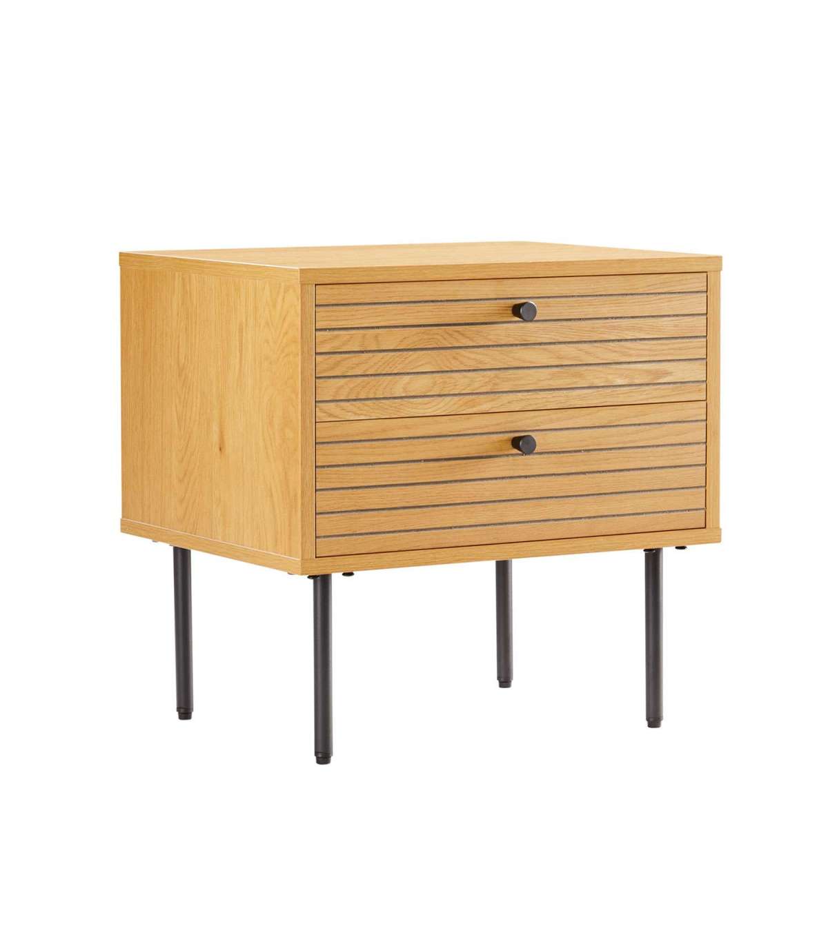 Öökapp LINE 2-sahtliga 50x40xH50cm. Öökapp on valmistatud tammedekooriga melamiinplaadist. Efektsed reljeefse pinnaga triibulised sahtlite esipaneelid on valmistatud mustast MDF plaadist, mida kaunistavad tammevärvi kitsad liistud. Öökapi metallist jalad on viimistletud musta pulbervärviga.
