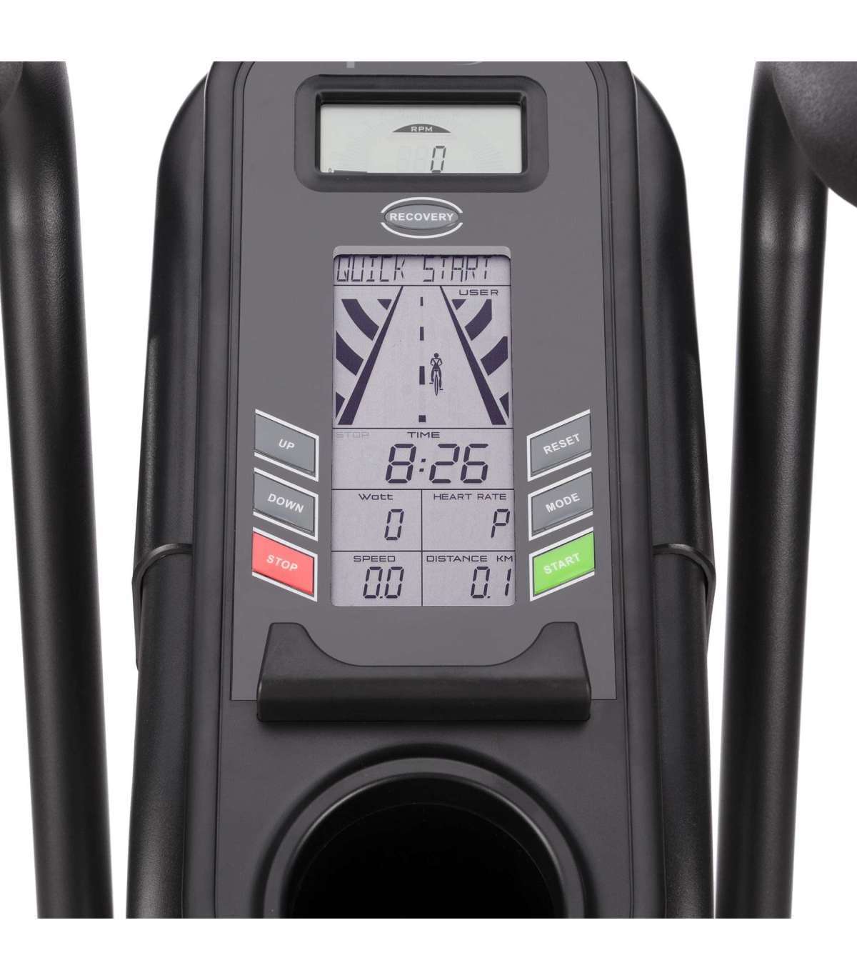 MP5458 õhuratas on varustatud LCD-ekraaniga, kus saate kontrollida olulisi treeningparameetreid, nagu aeg, vahemaa, kiirus, pulss, põletatud kalorid ja pöörete arv minutis. See võimaldab jälgida arengut ja kohandada treeningu intensiivsust vastavalt eesmärkidele ja võimetele. Ekraan on hästi loetav ja lihtne kasutada ning tal on tagantvalgustus, nii et saate treenida ka hämaras.