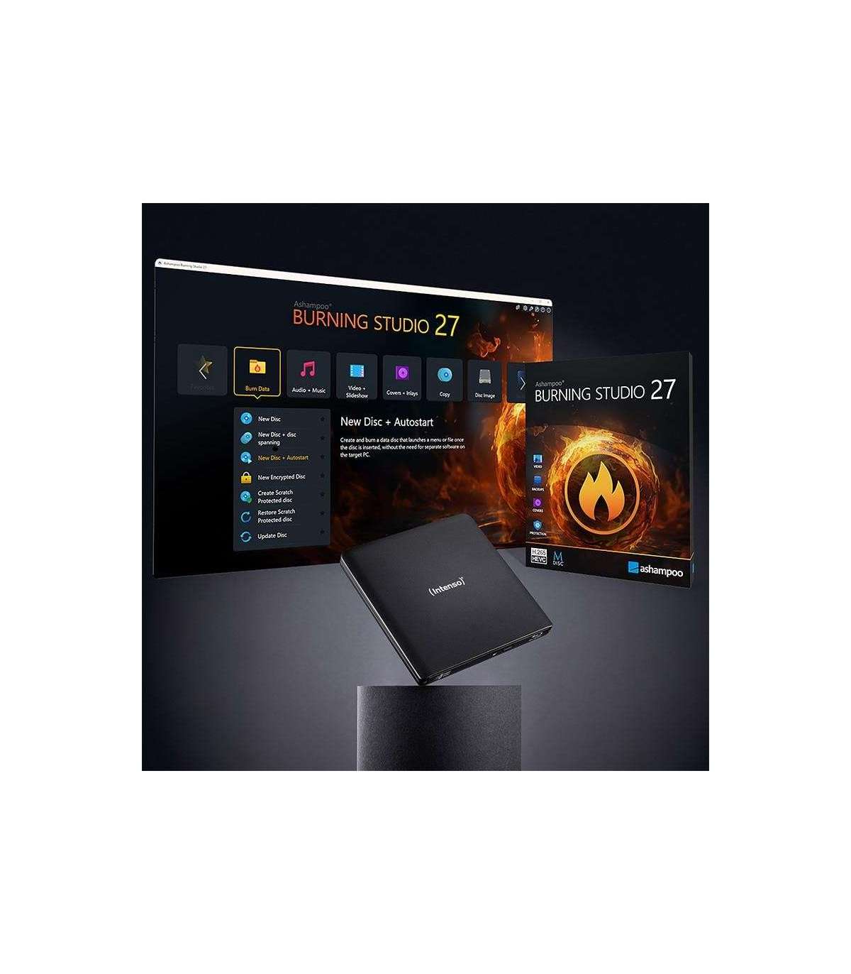 The package includes a Y-cable (Micro-B to USB-C and USB-A) as well as the full version of Ashampoo Burning Studio software for easy data backup, media creation, and archiving. Its slim design (142 × 148 × 16 mm) and lightweight build of only 250 g make the EOD 500BD Slim especially portable. With modern technology and a durable aluminum case, it’s the perfect solution for professional data storage and high-quality media playback.