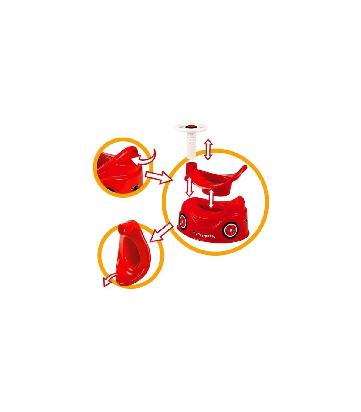 - - ma wysokie oparcie z uchwytem, który ułatwia przenoszenie, wyjmowaną wkładkę, która ułatwia opróżnianie, oraz zdejmowaną kierownicę z klaksonem, która dodaje zabawy,