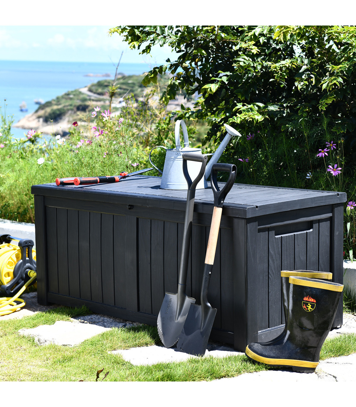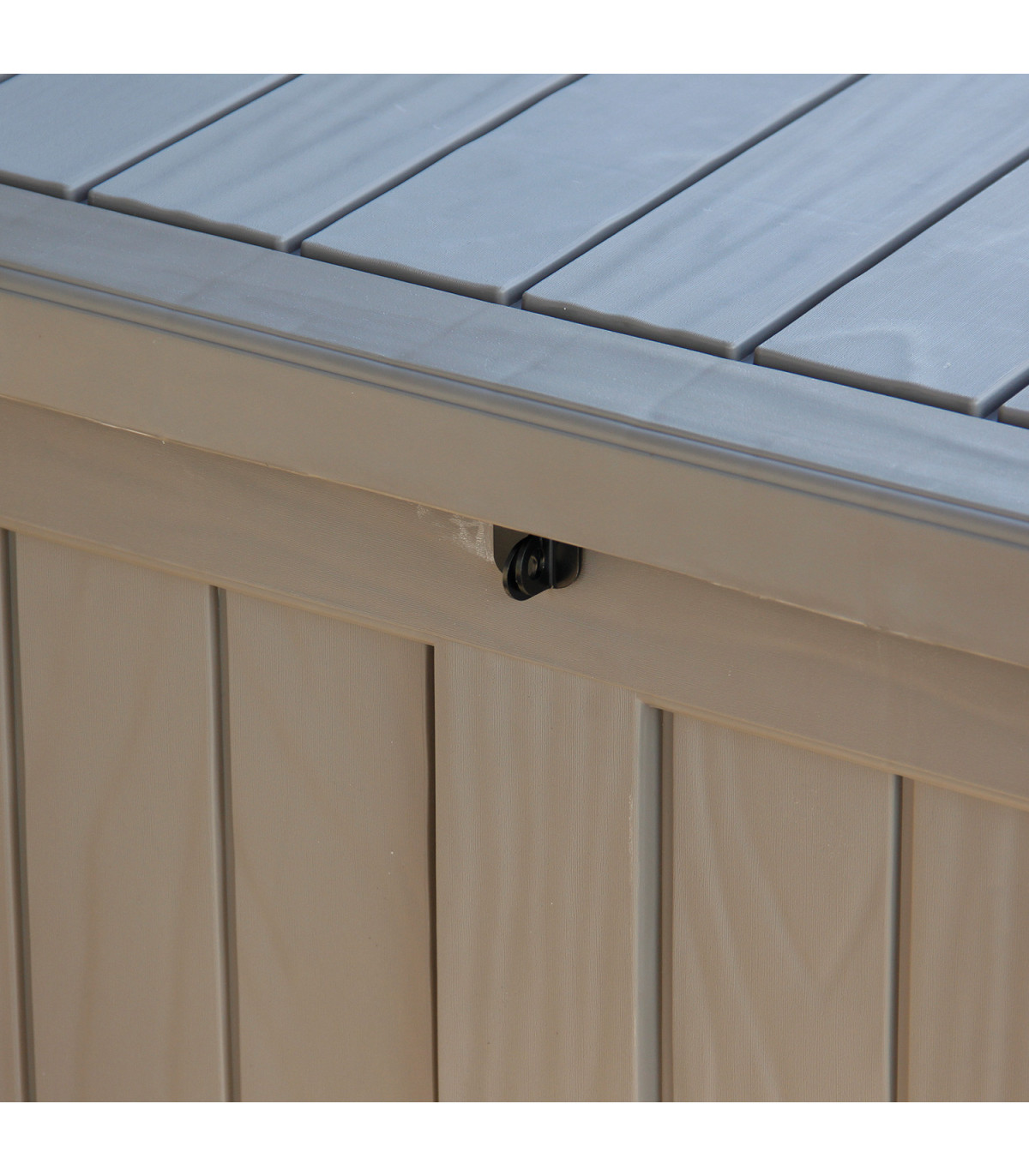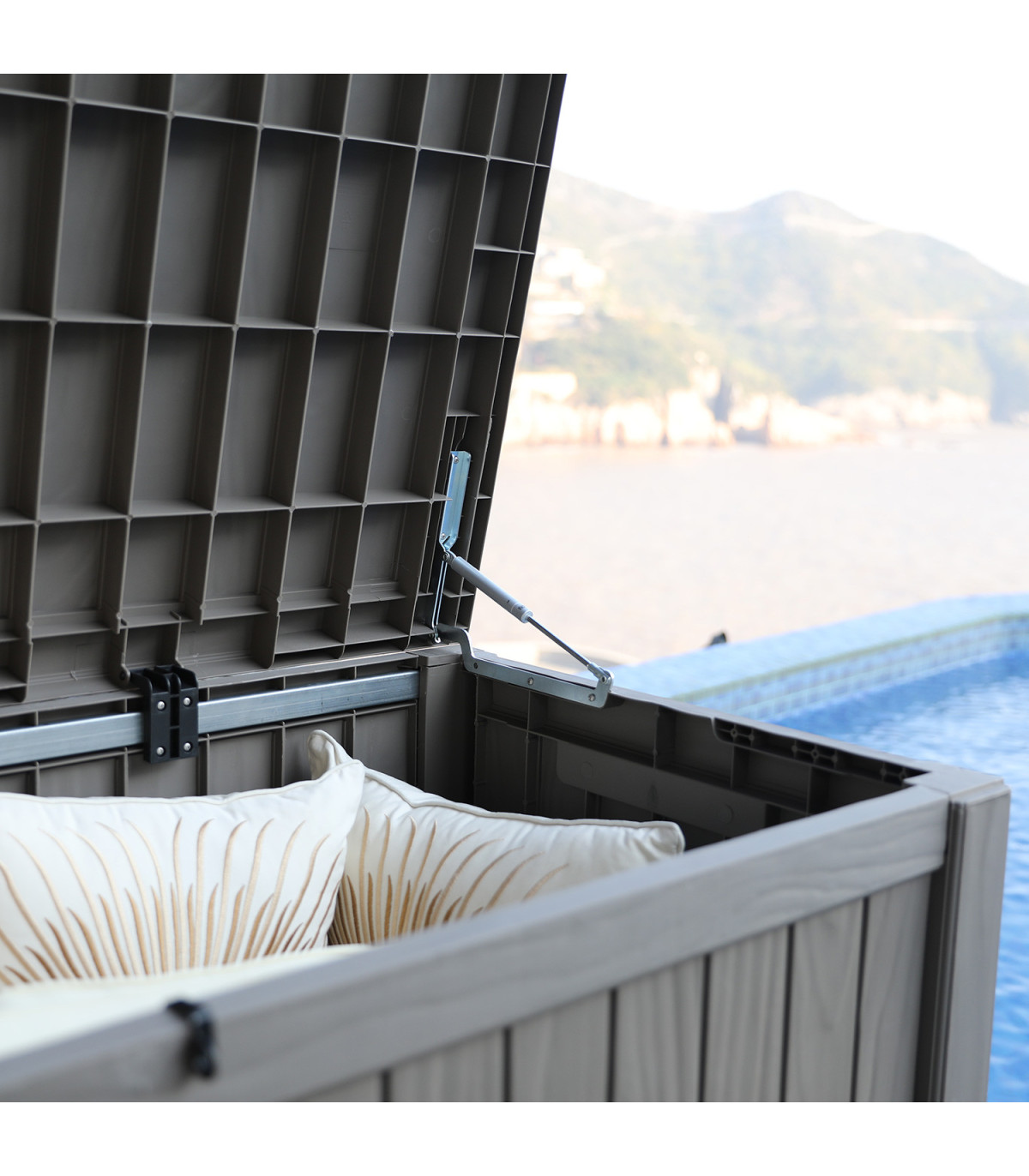 Tugev ja mahukas plastikkast on hea lahendus aiatarvete või suvemööbli patjade hoiustamiseks. Kasti konstruktsioon on tugevdatud terasvarrastega. Vajadusel saab kasti kasutada lisaistekohana kuni 3-le inimesele. Kast on ilmastikukindel ja vastupidav UV-kiirgusele. Säilituskast on lukustatav.