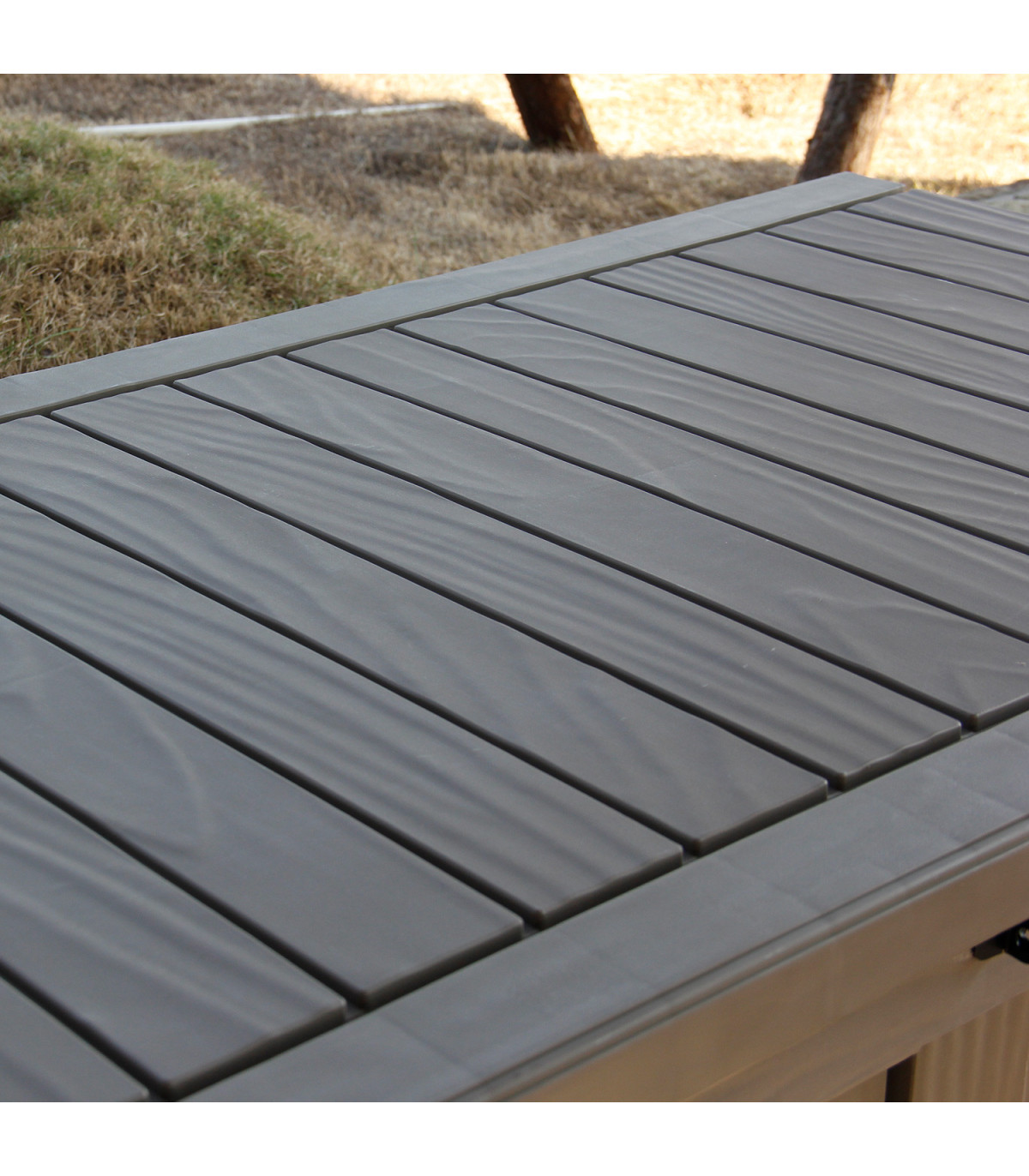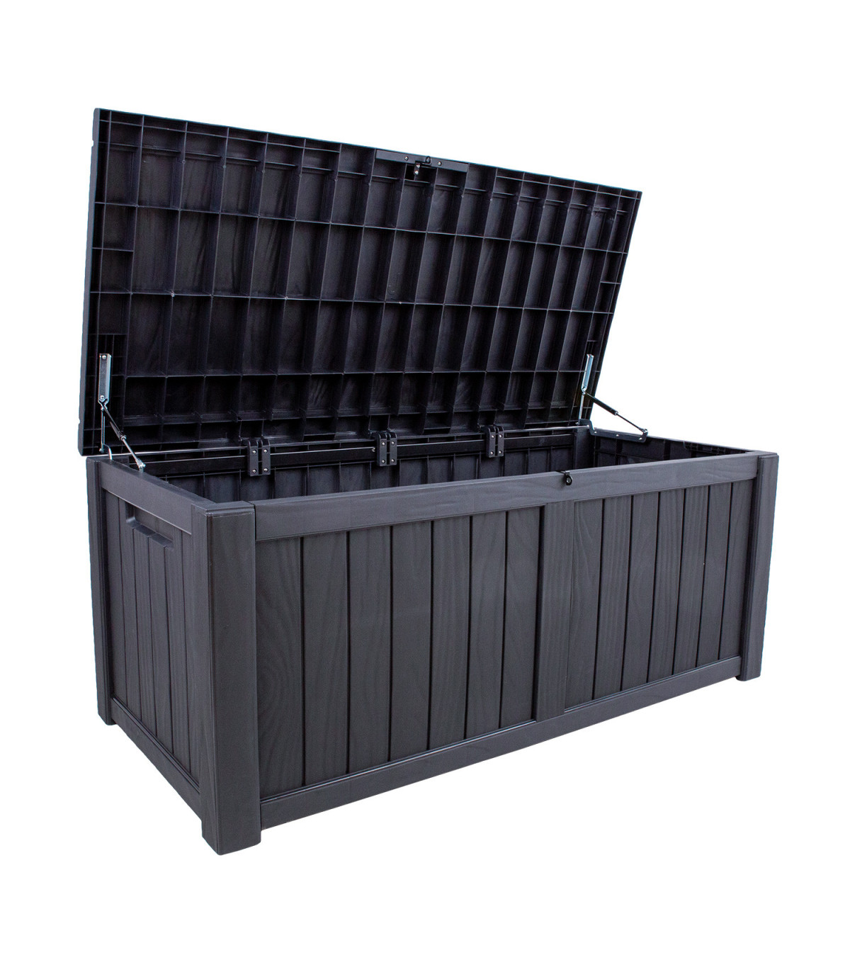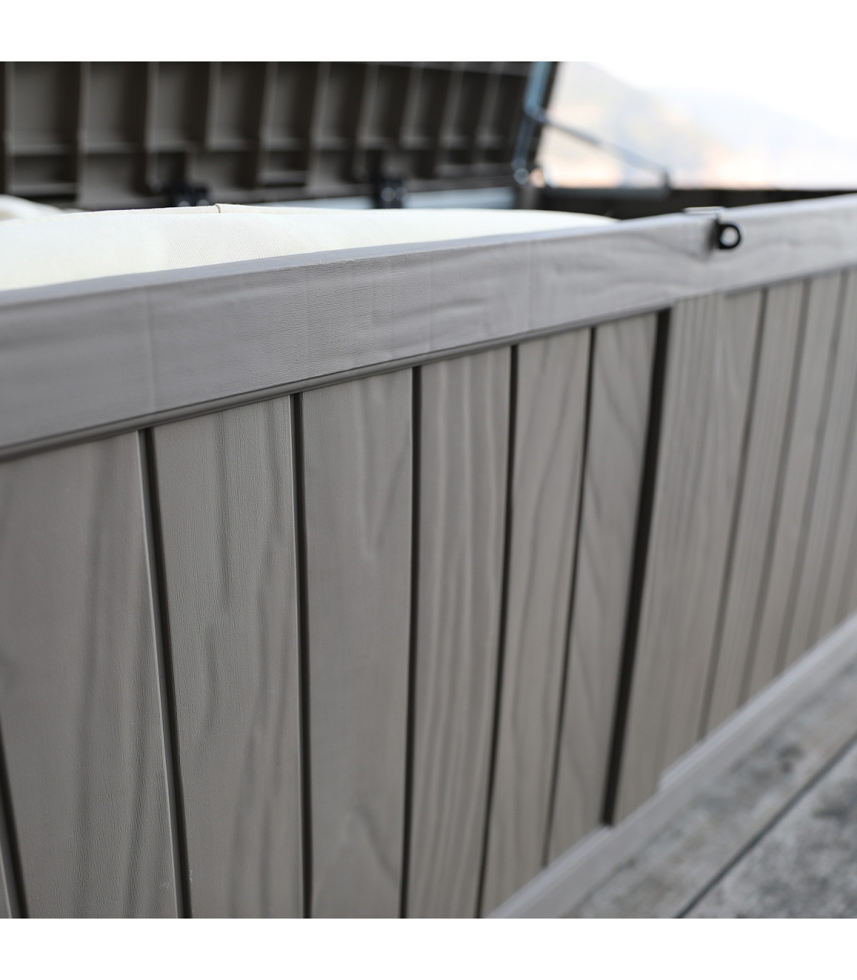 Tugev ja mahukas plastikkast on hea lahendus aiatarvete või suvemööbli patjade hoiustamiseks. Kasti konstruktsioon on tugevdatud terasvarrastega. Vajadusel saab kasti kasutada lisaistekohana kuni 3-le inimesele. Kast on ilmastikukindel ja vastupidav UV-kiirgusele. Säilituskast on lukustatav.