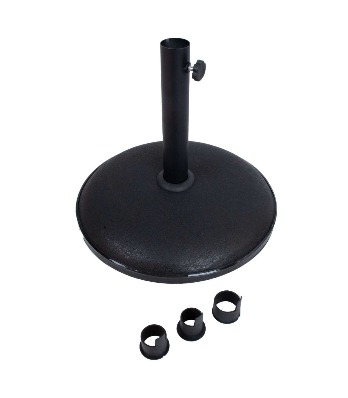 Päikesevarjualus D41,5x7cm/15kg. Päikesevarjualus on valatud betoonist ja värvitud mustaks. Terasest kinnitustoru pikkus on 28cm. Toru otsas on 3 plastikrõngast D30/35/38mm. Valige päikesevarjujala mõõduga sobiv rõngas. HOIUSTAMINE: suvehooaja lõppedes soovitame päikesevarjualuseid hoiustada siseruumides. Kasutage hoiustamiseks kuiva ning hea ventilatsiooniga ruumi.