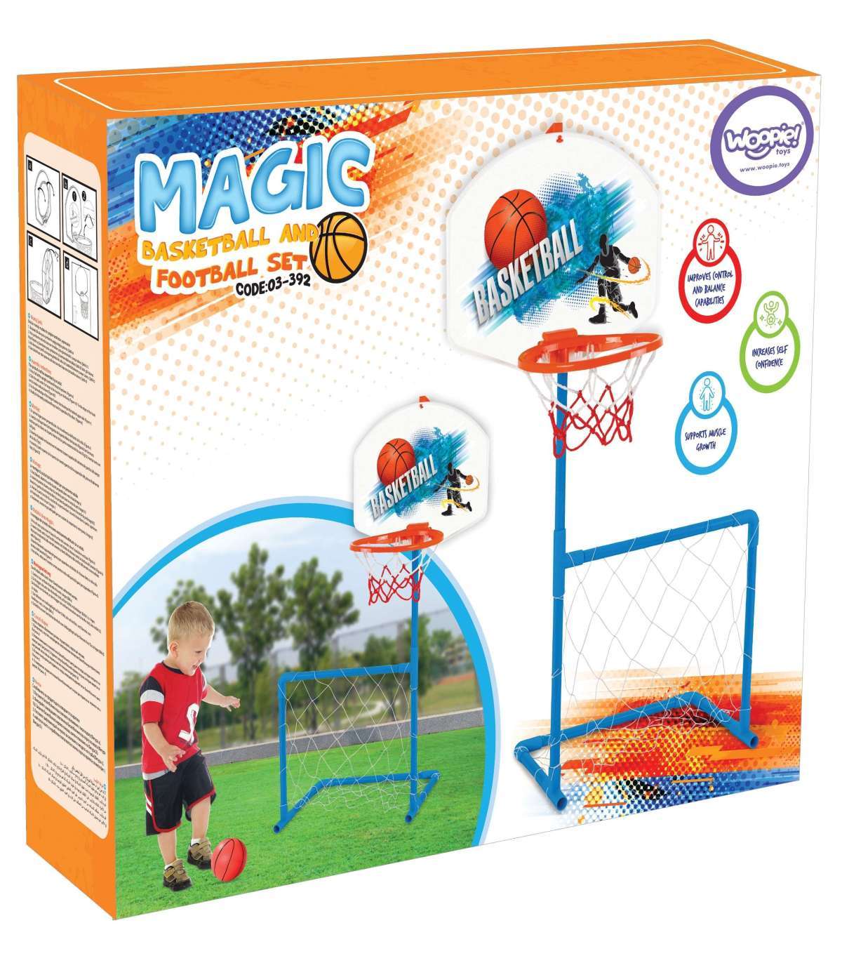 Siin on ideaalne spordikomplekt iga väikese liikumishuvilise jaoks! Woopie 2-in-1 korvpall + jalgpall komplekt on eriline mänguasi, mis tagab tunde loomingulist, turvalist ja rõõmsat mängimist kodus, aias või mänguväljakul. Komplekt ühendab korvirõnga ja jalgpalli värava, võimaldades lapsel proovida oma oskusi ise või sõpradega kahes erinevas spordialas. Valmistatud vastupidavast ja kerge plastikust, on komplekt lihtne kaasas kanda ja kokku panna ning samal ajal ohutu kasutada. Konstruktsioon on stabiilne ning kõik osad on loodud nooremaid kasutajaid silmas pidades. Komplektis on ka väike pall, nii et laps saab pärast lahtipakkimist kohe mängima hakata. See on suurepärane kingiidee, mis pakub palju rõõmu ning julgustab last olema aktiivne ja liikuma. Sport mänguna on parim viis lastesse tervisliku elustiili armastuse külvamiseks!
