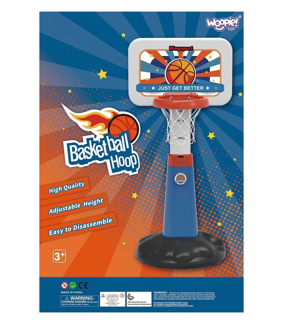 Suurepärane komplekt korvpall koos palliga ja pumpaga margilt Woopie on ideaalne spordikomplekt teie lapsele! Komplekt julgustab teie last tegelema spordiga. Korvpallimäng annab teie lapsele arengu niinimetatud suuri motoorseid oskusi, mis on ideaalne lapse õigele arengule. Korvpall kasvab koos lapsega ja sellel on reguleeritava kõrguse variant. Suur eelis on see, et toodet saab kasutada nii siseruumides kui ka vabas õhus - teie laps saab mängida sõltumata ilmast. Korvpall on piisavalt suur (kõrgus: 125 cm), et võimaldada teie lapsel mängida professionaalseid mänge oma sõpradega. Pärast mängu saate palli asetada spetsiaalselt selle jaoks ettenähtud kohta (aluse juures)