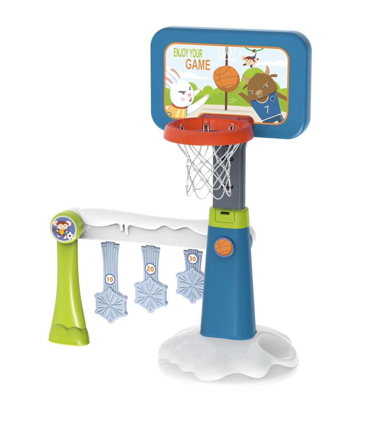 2-ühes spordikomplekt korvpall ja värav brändilt Woopie on suurepärane spordilahendus väikestele lastele! Laps saab valida, mida ta parasjagu mängida soovib. Laps saab mängida korvpalli üksinda või koos sõpradega jalgpalli - ta ei hakka kunagi igavlema! Väravas on punktitabel, kes saab enim punkte, see võidab. Komplekt kindlasti julgustab teie last tegelema spordiga. See tegevus aitab arendada teie lapse nii-öelda suurmotorikat, mis on ideaalne lapse õigele arengule. Suur eelis on see, et toodet saab kasutada nii siseruumides kui ka väljas - teie laps saab mängida igal pool olenemata ilmast. Korv on 125 cm kõrge - suurepärane kõige väiksematele mängijatele!