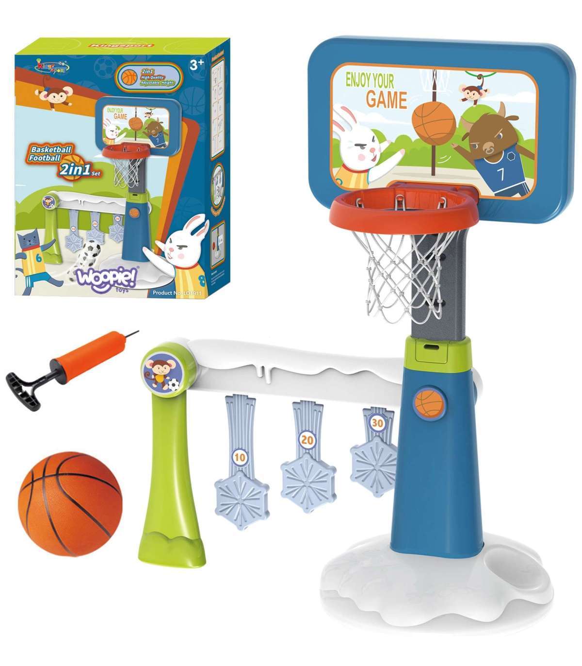 WOOPIE 2-ühes komplekt: korvpalli- ja jalgpallivärav + pall + pump