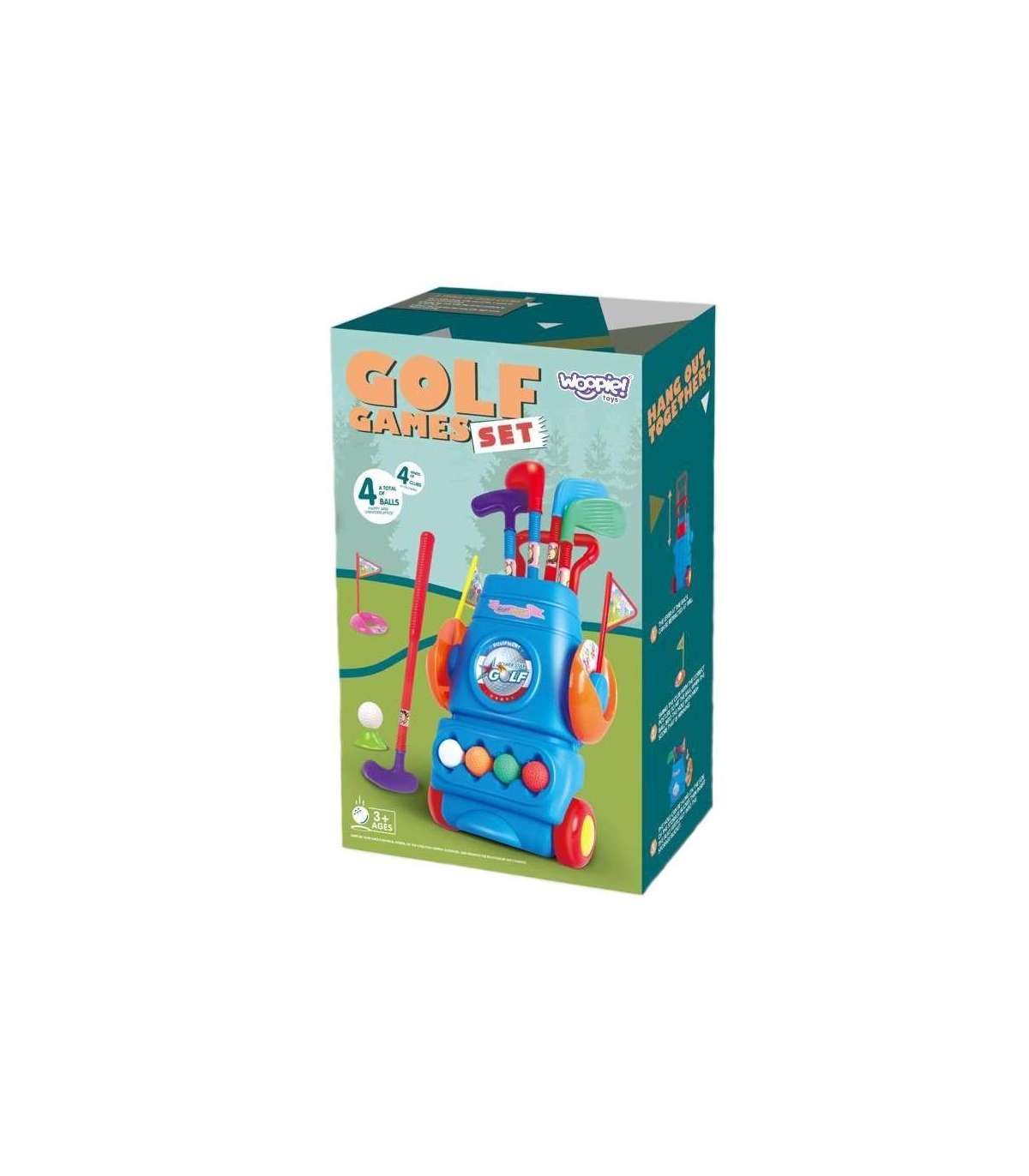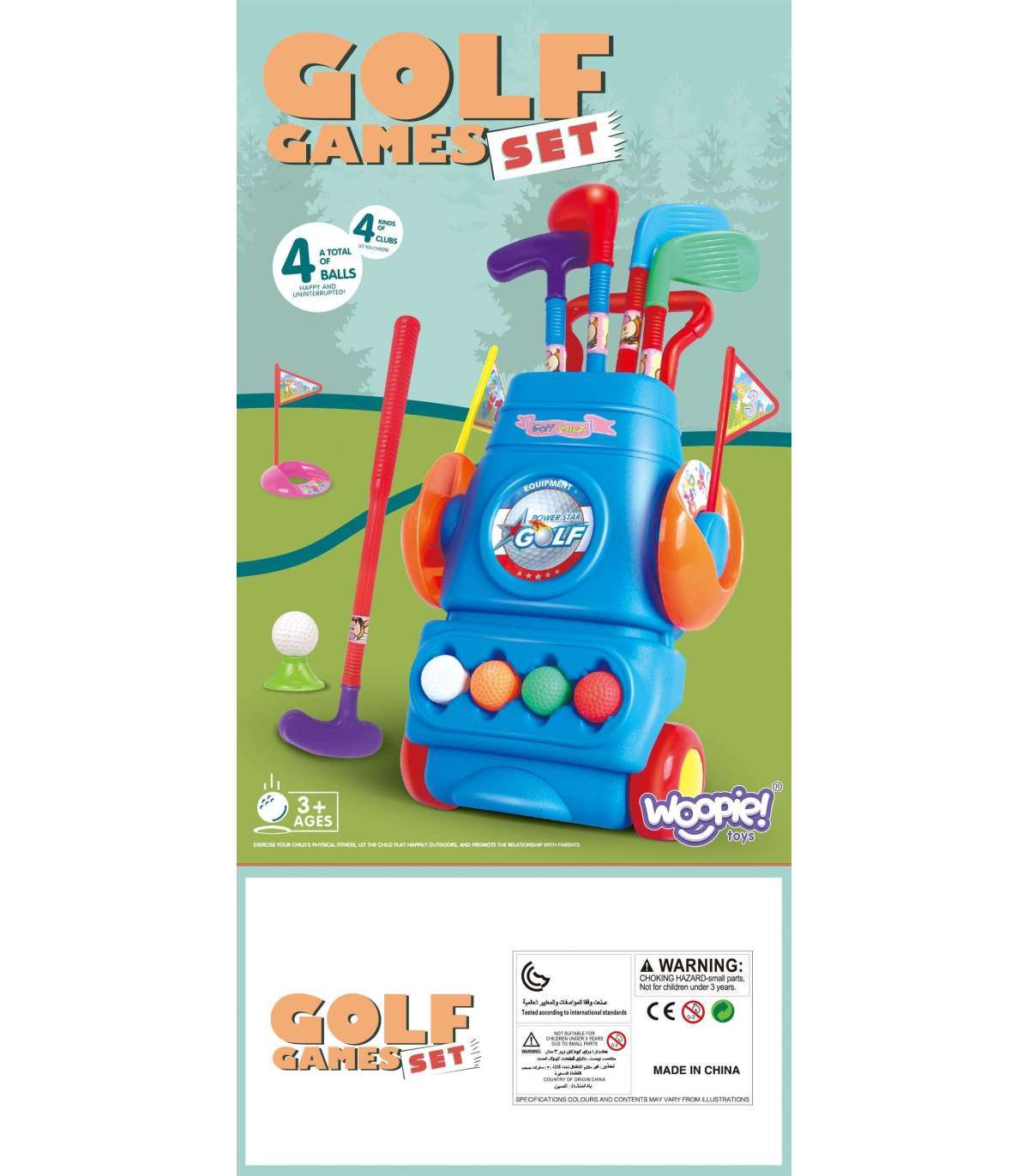 Golfikomplekt firmalt Woopie on ideaalne viis veeta vaba aega aktiivselt. Komplekt arendab kontsentratsiooni, reflekse, osavust ja täpsust. Mäng on 100% valmistatud kvaliteetsest, mittetoksilisest ja ilmastikukindlast plastist, mis pakub suurepärast lõbu kogu perele. Lihtsasti paigaldatav auk võimaldab mängida nii aias kui kodus. Toode on mõeldud lastele alates 3. eluaastast. Komplektis on 4 golfikeppi ning 4 palli erinevates värvides ning kaks "auku" lippudega. Kogu komplekti on lihtne transportida tänu kärule kinnitatud ratastele.