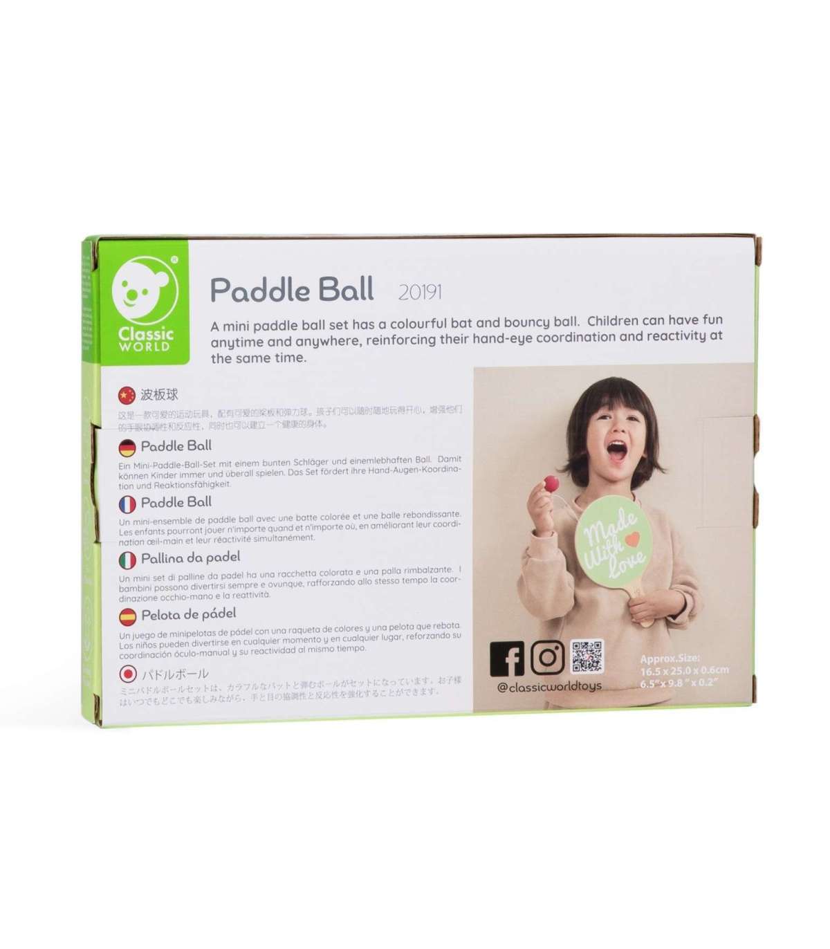 Paddle Ball brändilt CLASSIC WORLD on vahva spordimänguasi armsa reketi ja elastse palliga. Lapsed saavad mängida igal ajal ja igal pool, tugevdada käe-silma koordinatsiooni ja reaktsioonikiirust ning ka arendada tervislikku keha.