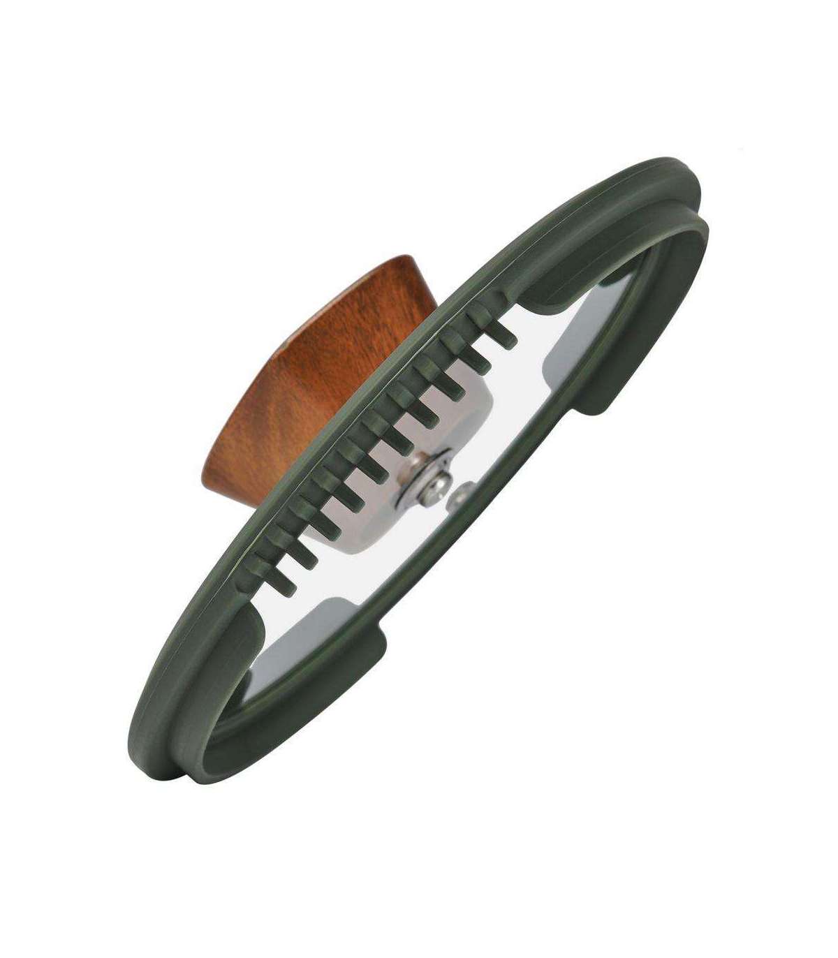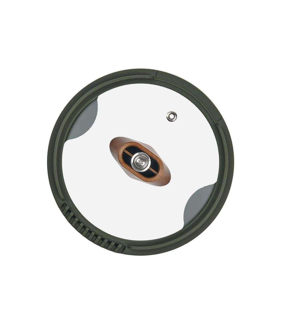Glass lid with silicone rim and double-sided drain features silicone inserts to protect fingers when draining water