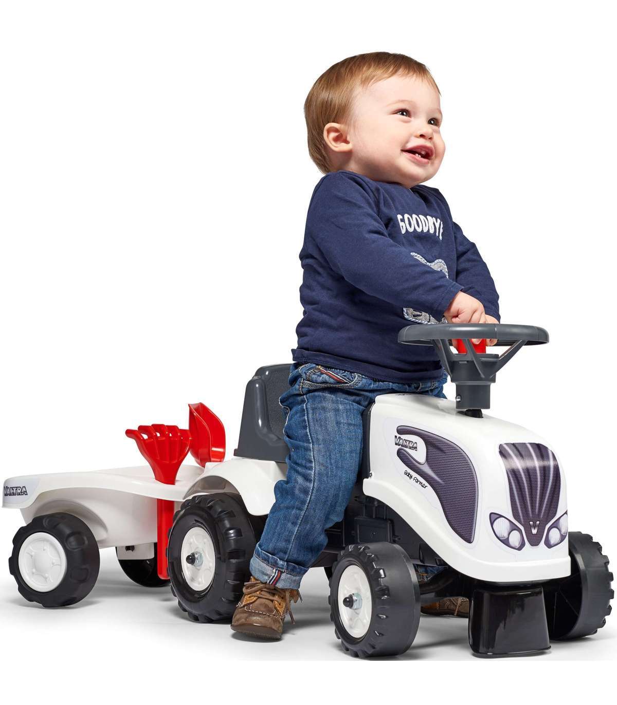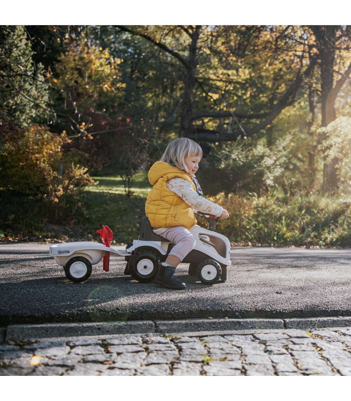 Traktorek Jeździk Baby Valtra z przyczepką marki Falk to spełnienie marzeń niejednego małego traktorzysty. Starannie wykonany, z dbałością o najmniejszy szczegół! Żaden prawdziwy Farmer by takim nie pogardził. Pojazd wykonany z najwyższej jakości tworzywa przeznaczony dla dzieci od 12 miesiąca życia. Pojazd jest wyposażony odpinaną przyczepę z panelami oraz kierownicę z klaksonem. Koła traktorka zostały wykonane z wysokiej jakości plastiku. Dodatkowo do traktorka mamy do zabawy dla naszej pociechy grabki oraz łopatkę. Dołączone do traktorka naklejki pozwolą dziecku wybrać swój unikatowy styl. Uśmiechnięta buźka czy standardowa naklejka? Zaskocz wszystkich i naklej na przód pojazdu.