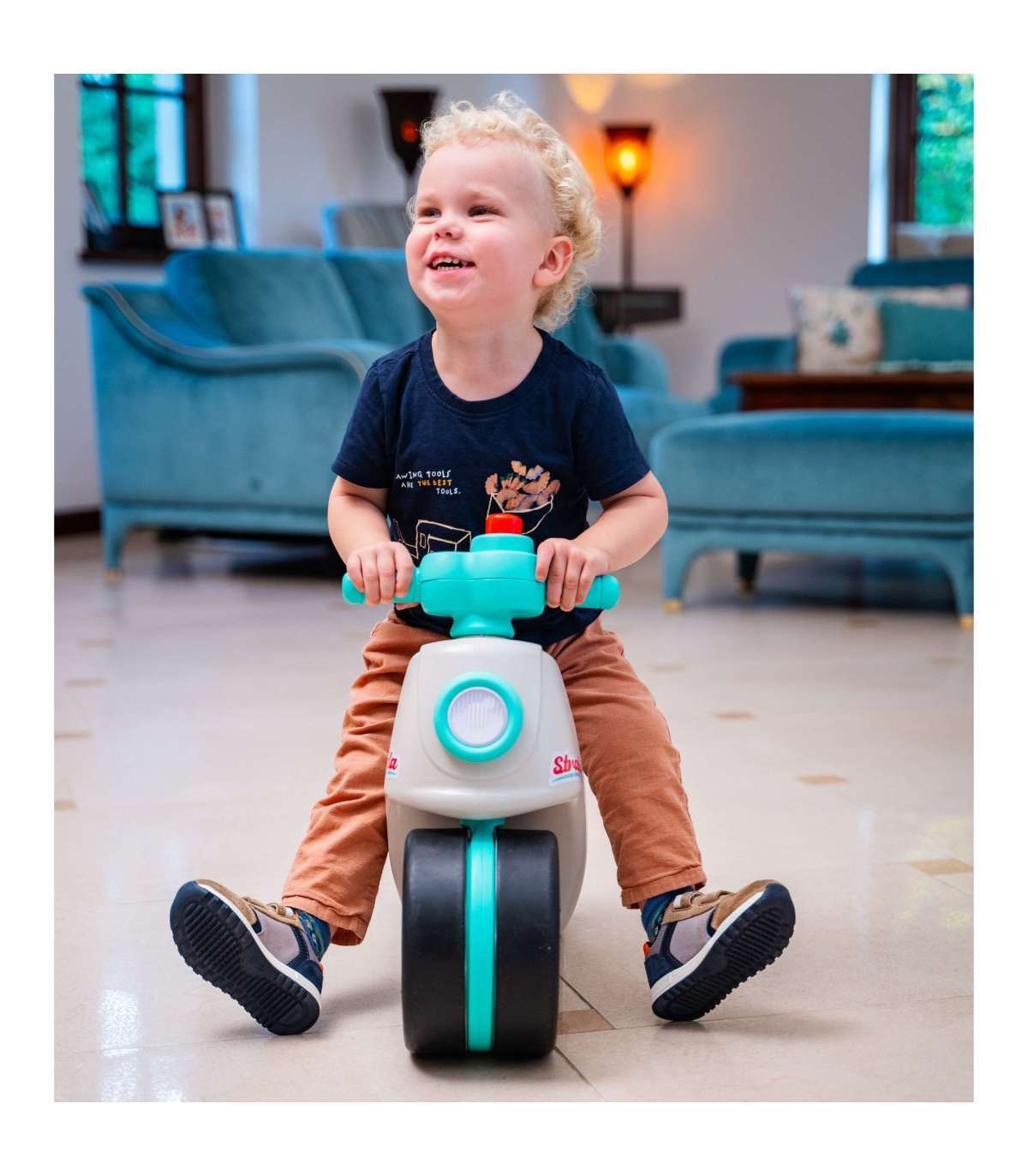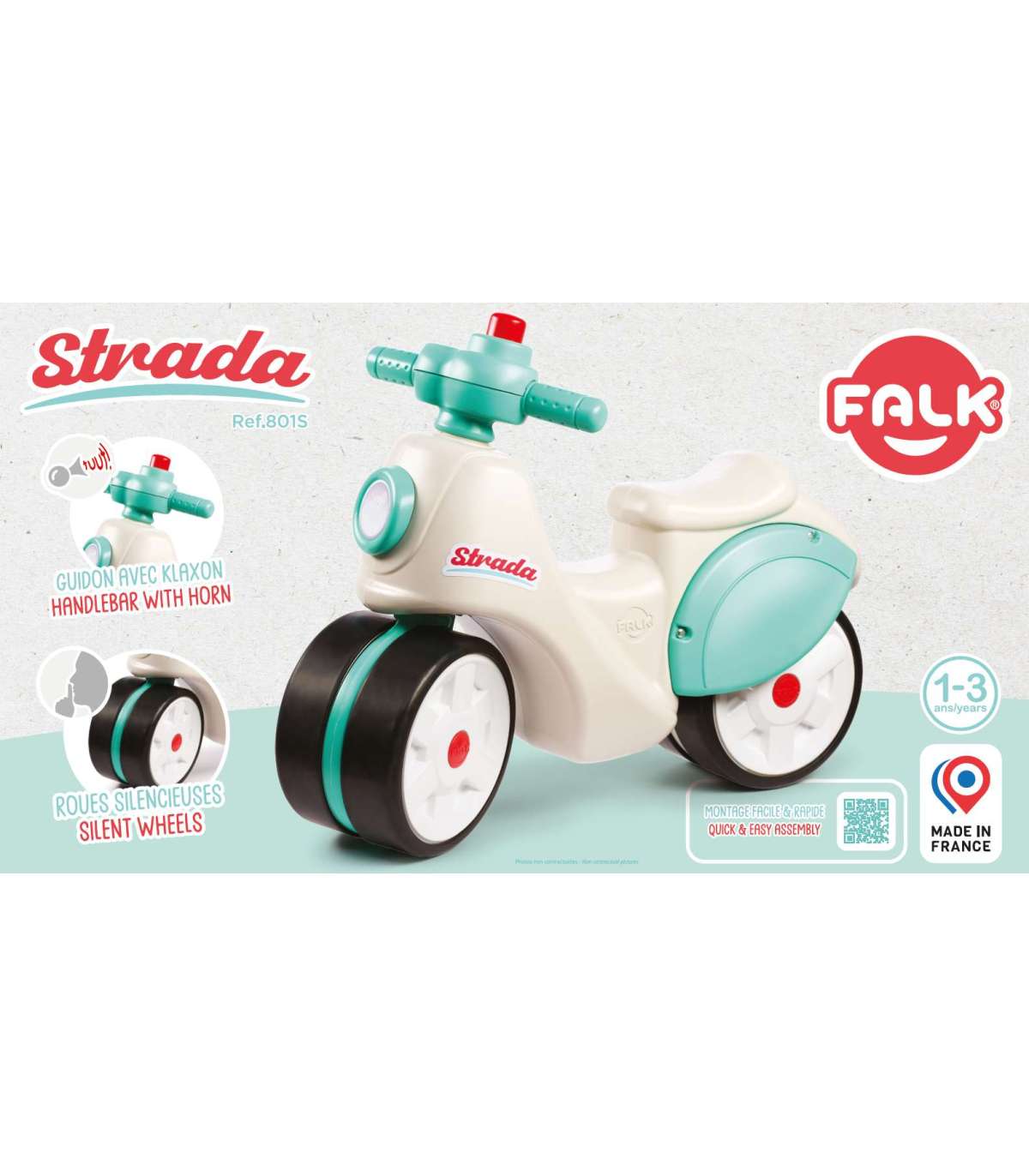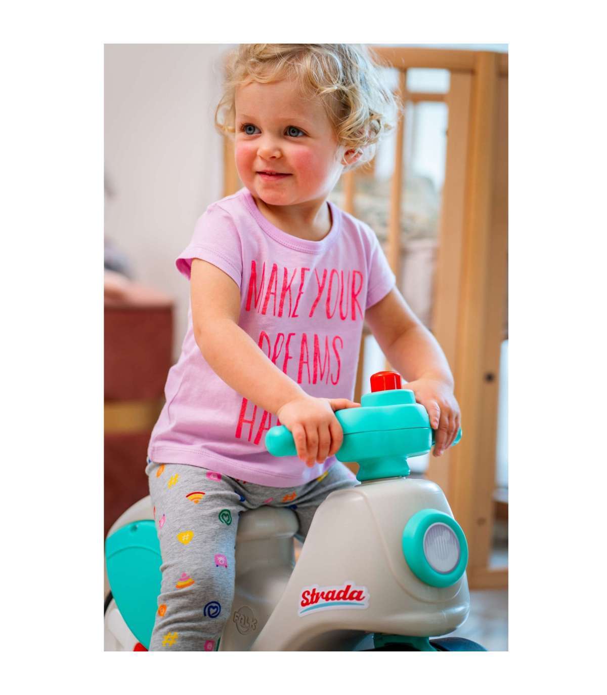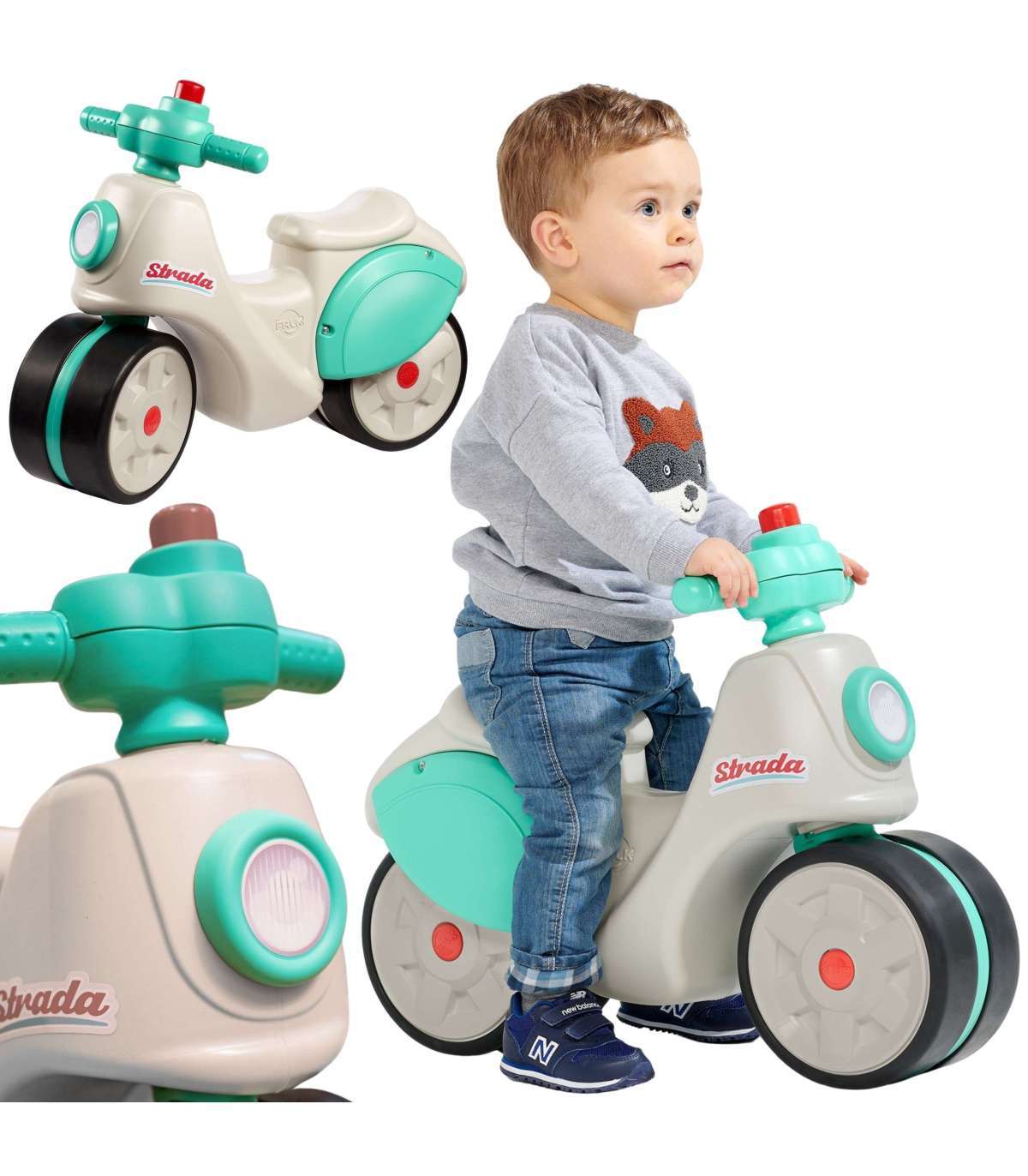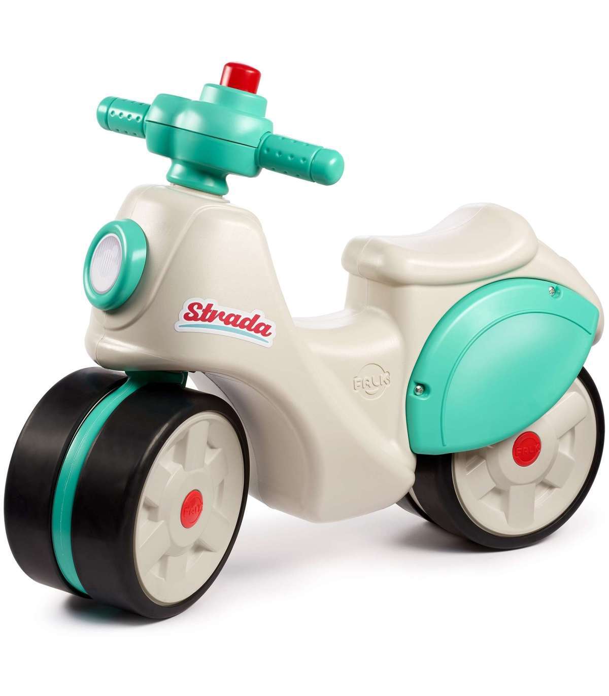 Odpychacz Strada to uroczy jeździk dla najmłodszych, będący ukłonem w stronę klasyki z lat 70., ale w nowoczesnym, okrągłym designie. Idealnie sprawdzi się jako "pierwsza" hulajnoga dla dziecka już od 1 roku życia, wspierając rozwój równowagi i motoryki w pełni bezpiecznych warunkach. Jest wyposażona w duże, ciche koła z powłoką elastomerową, dzięki czemu doskonale nadaje się zarówno do zabawy w domu, jak i na zewnątrz. Kierownica wyposażona w manualny klakson gwarantuje godziny radosnej zabawy!