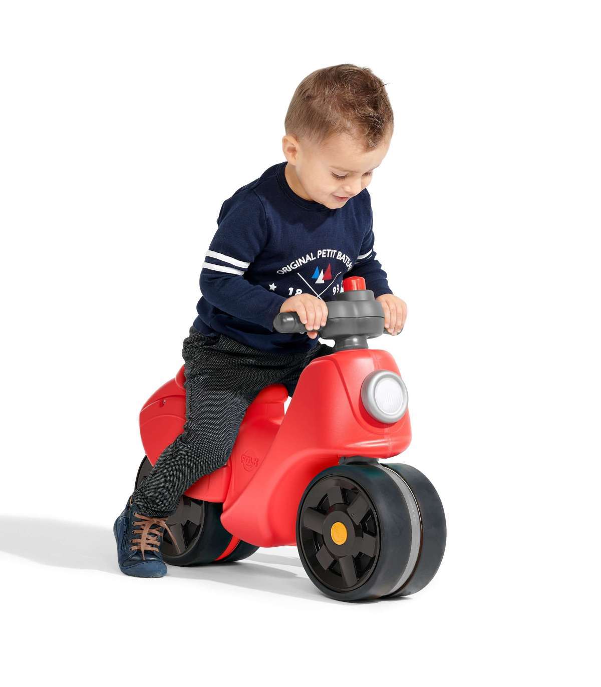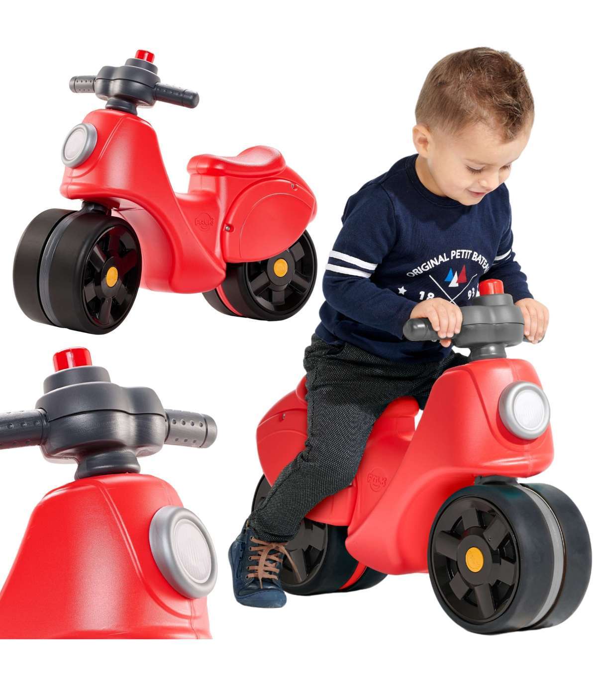 Jeździk od francuskiej firmy produkującej Falk to idealna propozycja na prezent dla dziecka od 1 roku życia. Wyposażony w duże kółka zapewniające dziecku niezbędną stabilność do rozwoju, dodatkowo maluch ćwiczy równowagę i zdolności motoryczne. Ich powłoka elastromerowa sprawia że sa bardziej odporne na zarysowania czy uszkodzenia. Jeździk prowadzi się jak prawdziwy skuter dzięki niewielkiej skrętnej kierownicy z klaksonem, który dodatkowo wzbogaca zabawę dziecka.
