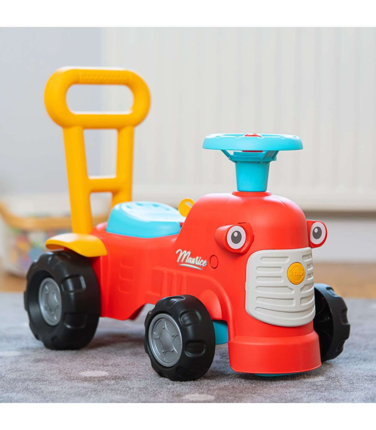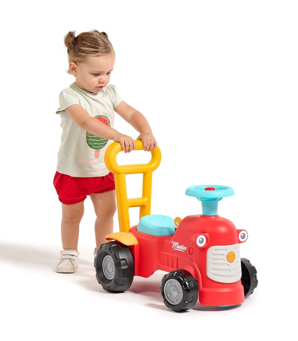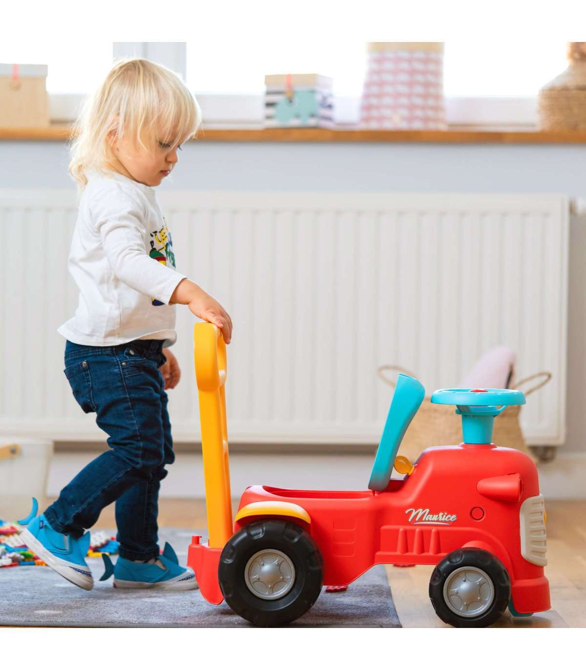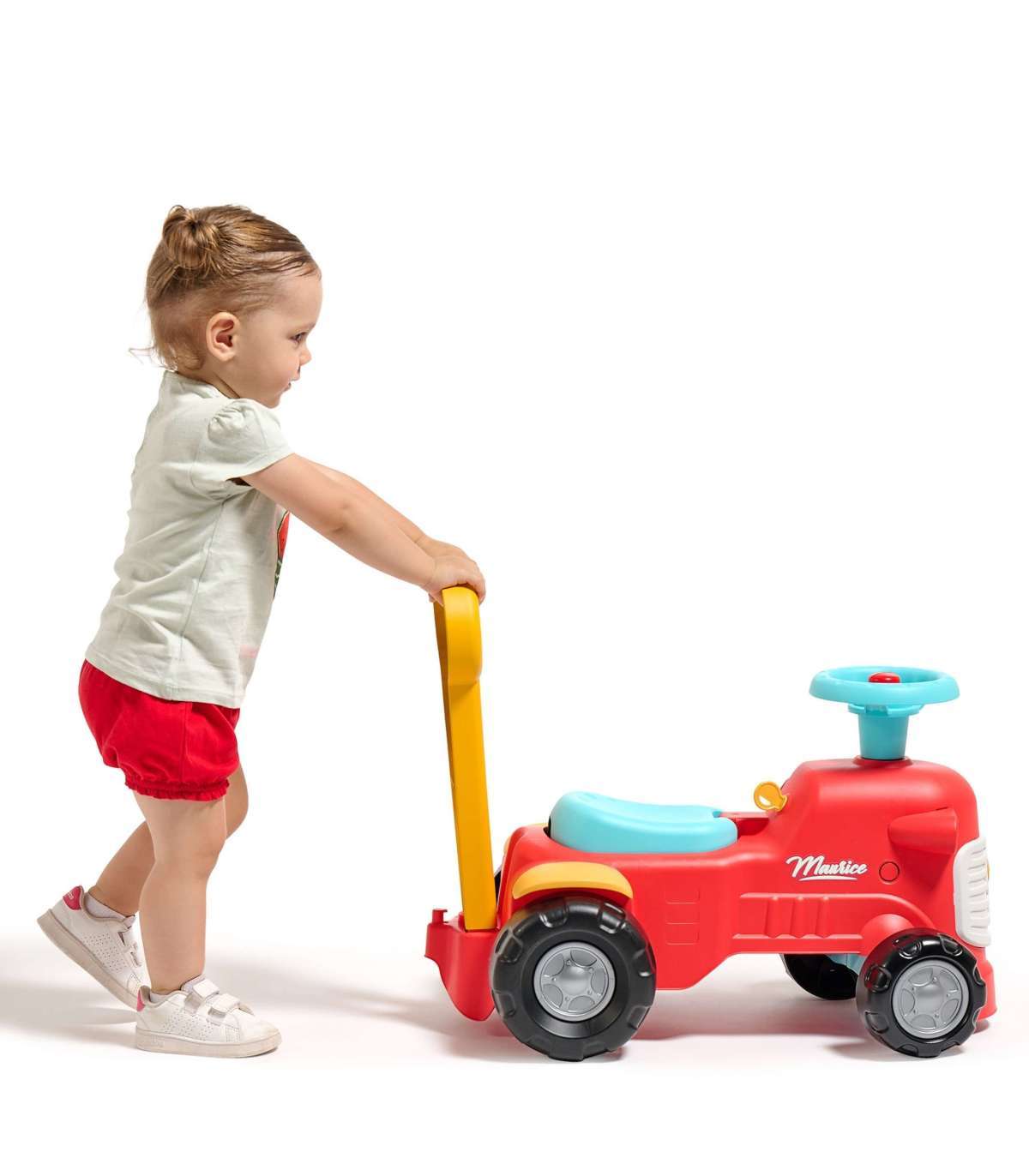 Maurice to uroczy traktorek francuskiej marki Falk, który będzie towarzyszem pierwszych kroków Twojego dziecka. Jasne kolory i zaokrąglone kształty zachwycą każdego malucha. Uruchamianie traktora za pomocą małego pokrętła dźwiękowego oraz dźwięk z klaksonu umieszczonego na kierownicy to wspaniała pierwsza nauka, która pobudzi umiejętności motoryczne i słuch Twojego dziecka. Jeżdżąc na jeździku, bawiąc się kierownicą z klaksonem i skrętnymi kołami dziecko będzie ćwiczyło koordynację i równowagę. Stojąc z tyłu, może korzystać z ergonomicznego oparcia, aby uczyć się chodzić przez zabawę, bez strachu i całkowicie bezpiecznie. Pod siedzeniem znajduje się niewielki schowek do przechowywania skarbów.