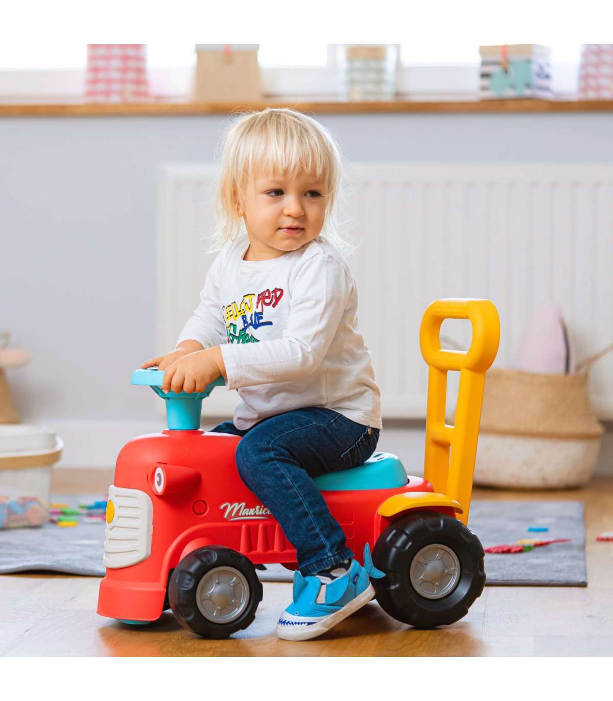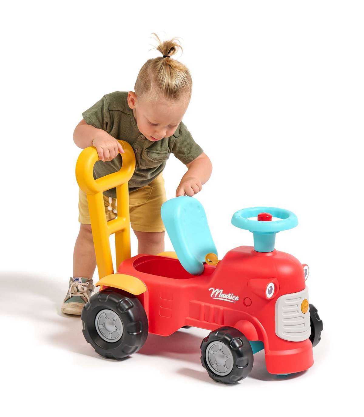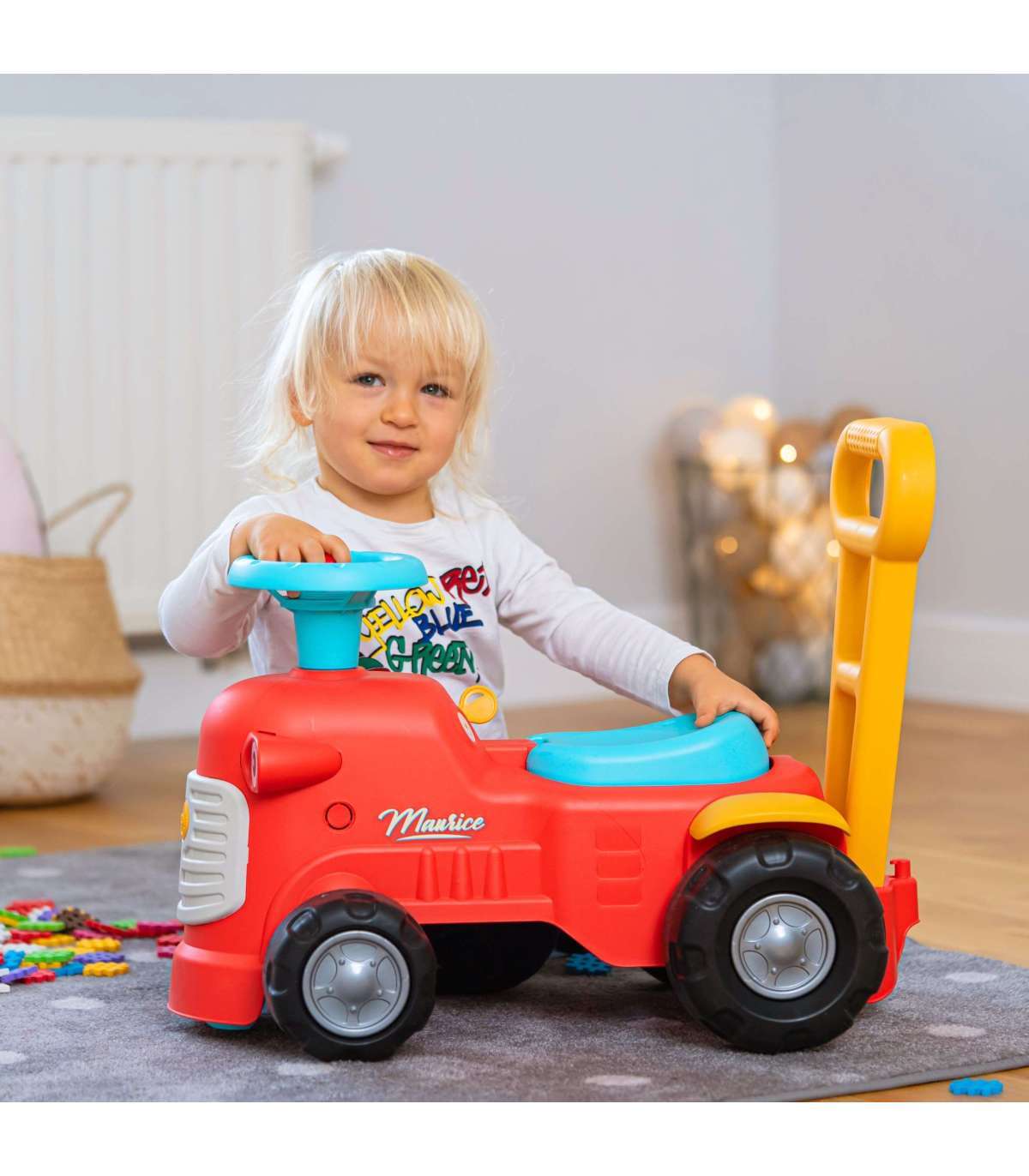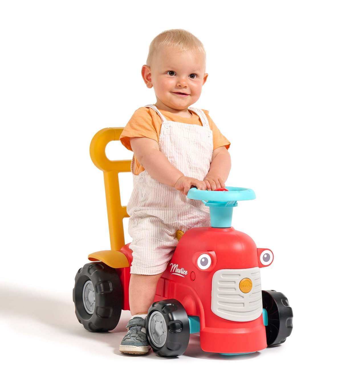 Maurice to uroczy traktorek francuskiej marki Falk, który będzie towarzyszem pierwszych kroków Twojego dziecka. Jasne kolory i zaokrąglone kształty zachwycą każdego malucha. Uruchamianie traktora za pomocą małego pokrętła dźwiękowego oraz dźwięk z klaksonu umieszczonego na kierownicy to wspaniała pierwsza nauka, która pobudzi umiejętności motoryczne i słuch Twojego dziecka. Jeżdżąc na jeździku, bawiąc się kierownicą z klaksonem i skrętnymi kołami dziecko będzie ćwiczyło koordynację i równowagę. Stojąc z tyłu, może korzystać z ergonomicznego oparcia, aby uczyć się chodzić przez zabawę, bez strachu i całkowicie bezpiecznie. Pod siedzeniem znajduje się niewielki schowek do przechowywania skarbów.