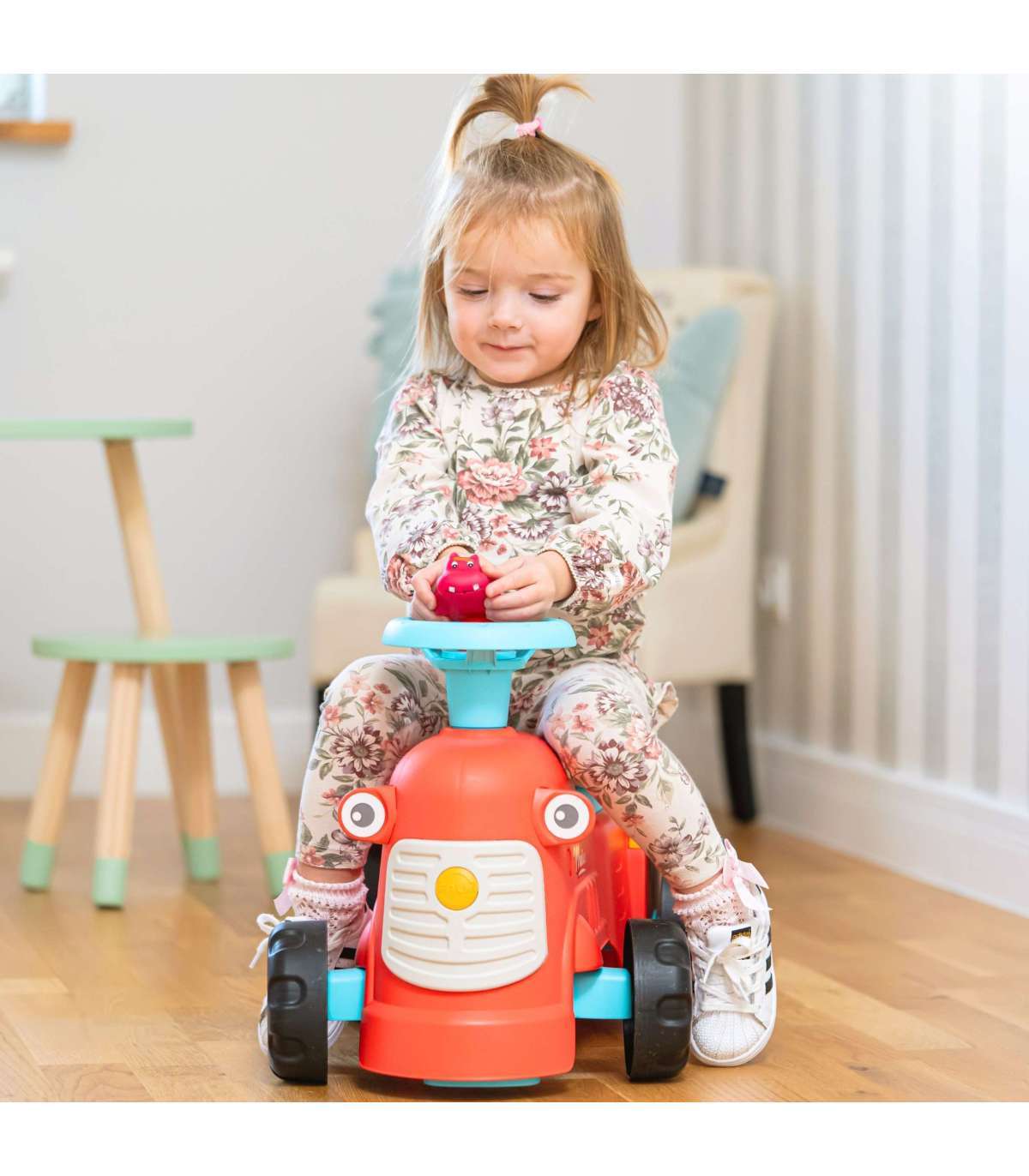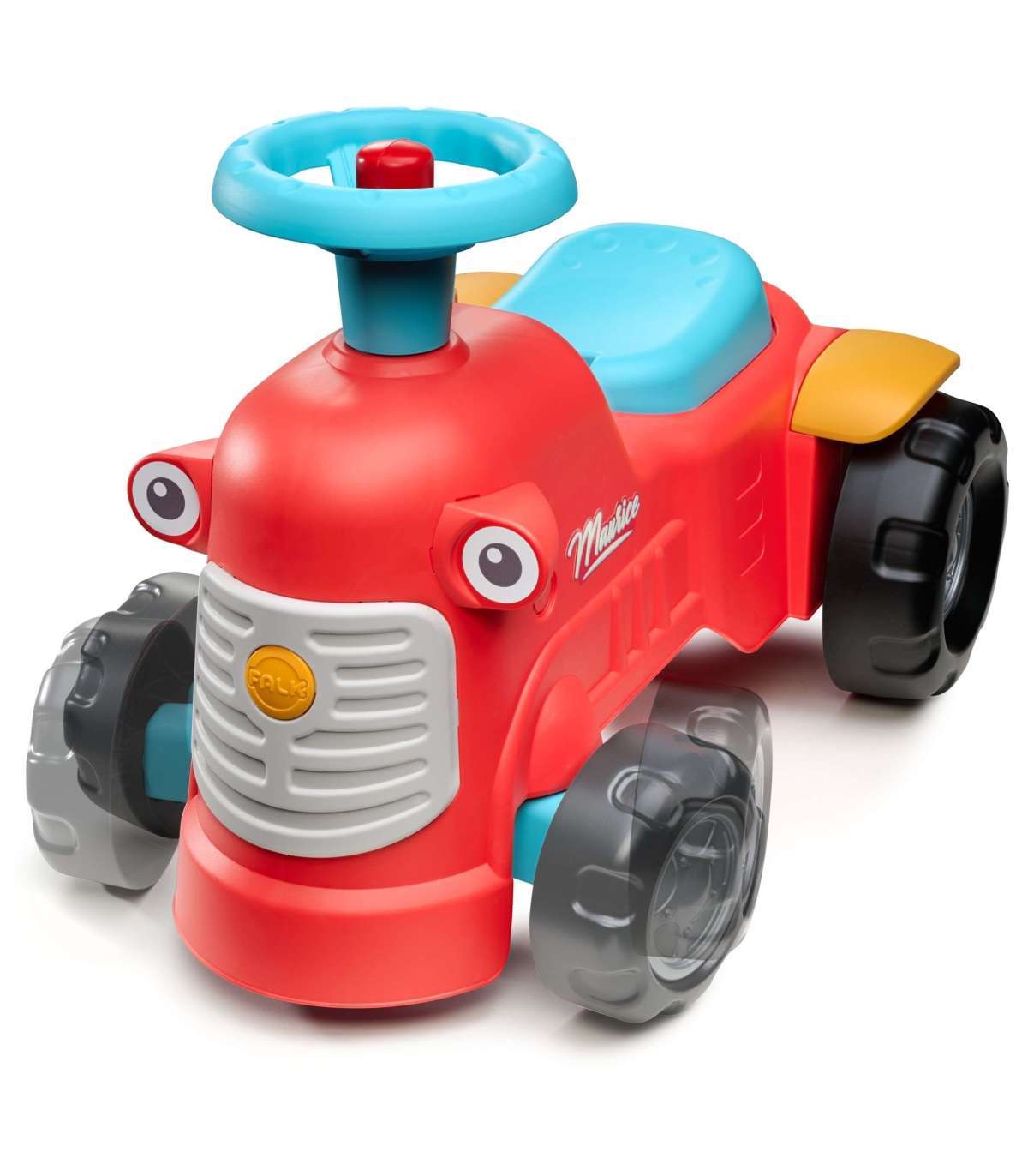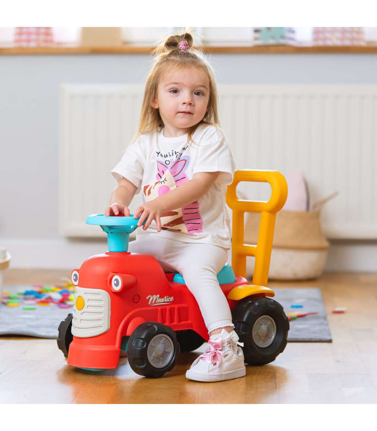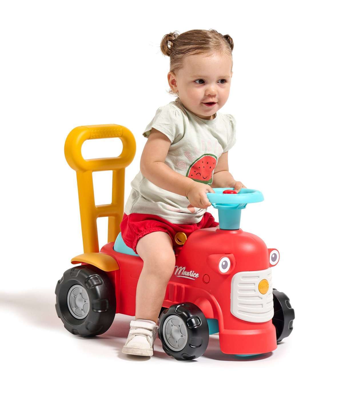 Maurice to uroczy traktorek francuskiej marki Falk, który będzie towarzyszem pierwszych kroków Twojego dziecka. Jasne kolory i zaokrąglone kształty zachwycą każdego malucha. Uruchamianie traktora za pomocą małego pokrętła dźwiękowego oraz dźwięk z klaksonu umieszczonego na kierownicy to wspaniała pierwsza nauka, która pobudzi umiejętności motoryczne i słuch Twojego dziecka. Jeżdżąc na jeździku, bawiąc się kierownicą z klaksonem i skrętnymi kołami dziecko będzie ćwiczyło koordynację i równowagę. Stojąc z tyłu, może korzystać z ergonomicznego oparcia, aby uczyć się chodzić przez zabawę, bez strachu i całkowicie bezpiecznie. Pod siedzeniem znajduje się niewielki schowek do przechowywania skarbów.