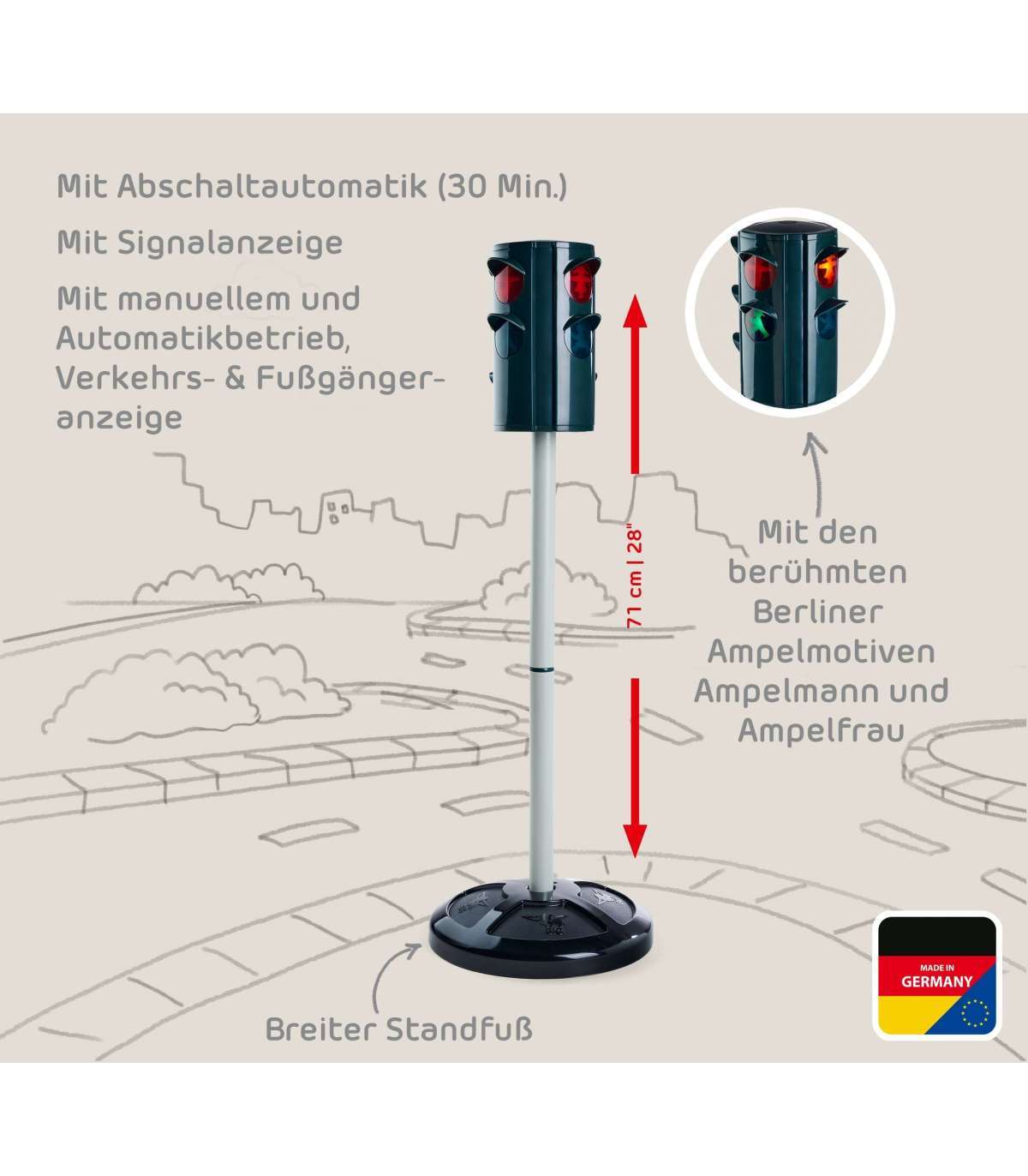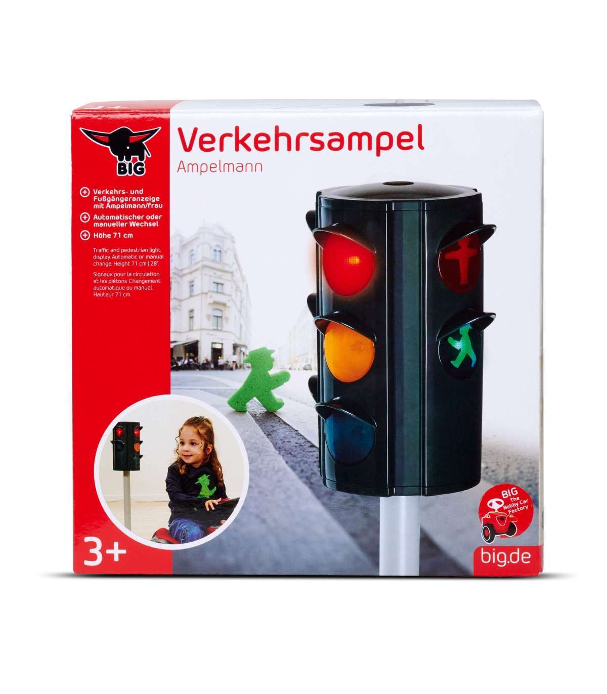 BIG Sygnalizacja świetlna to doskonały sposób na wprowadzenie najmłodszych w świat zasad ruchu drogowego. Dzięki realistycznej zmianie świateł i licencjonowanym postaciom Ampelmännchen & Ampelfrau z kultowej berlińskiej marki AMPELMANN, dzieci już od 3. roku życia mogą uczyć się bezpiecznego poruszania się po drodze w formie zabawy!