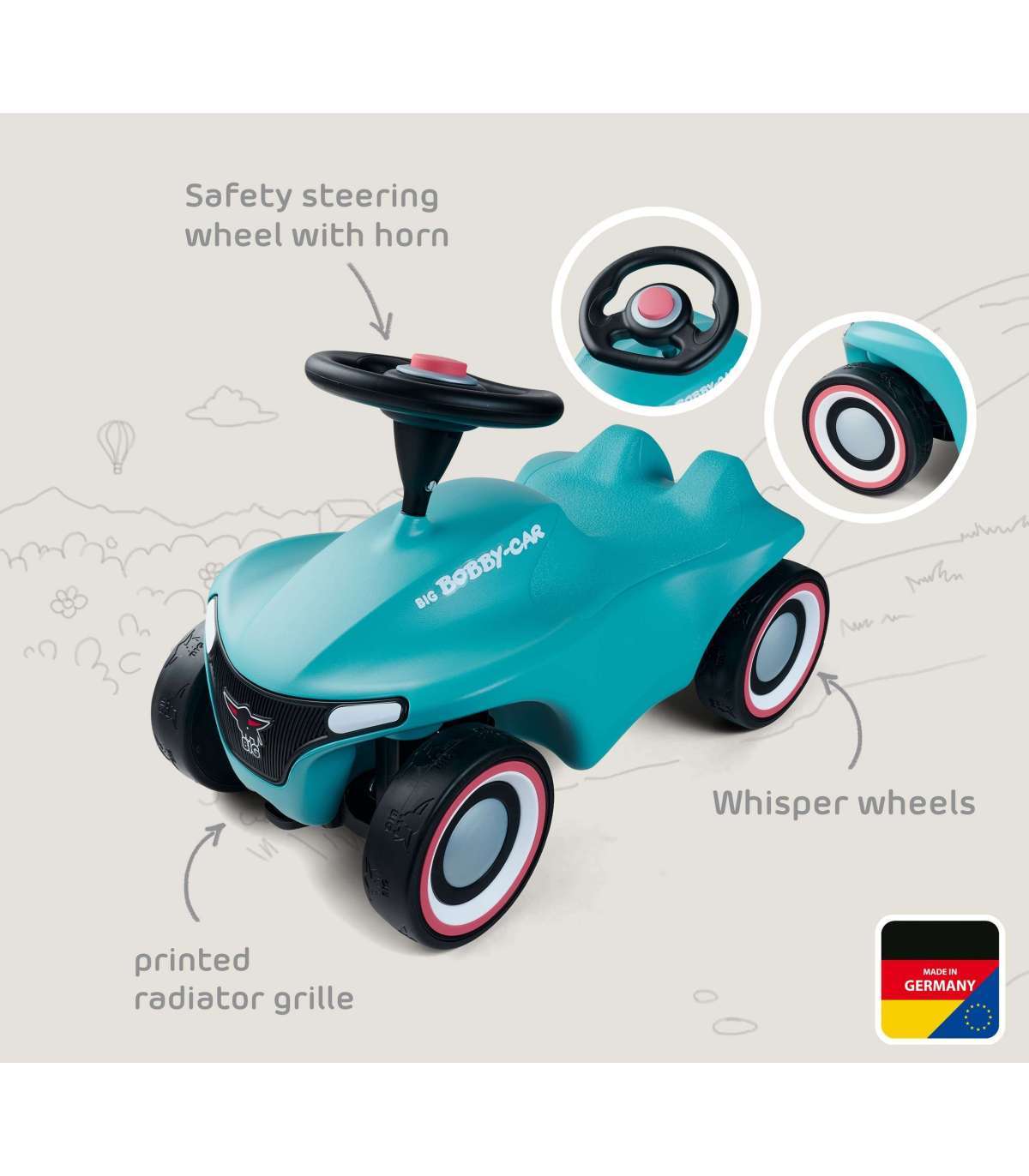 - - Bezpieczna jazda – antypoślizgowa kierownica zapewnia pewny chwyt, a mechaniczny klakson dodaje realizmu zabawie.