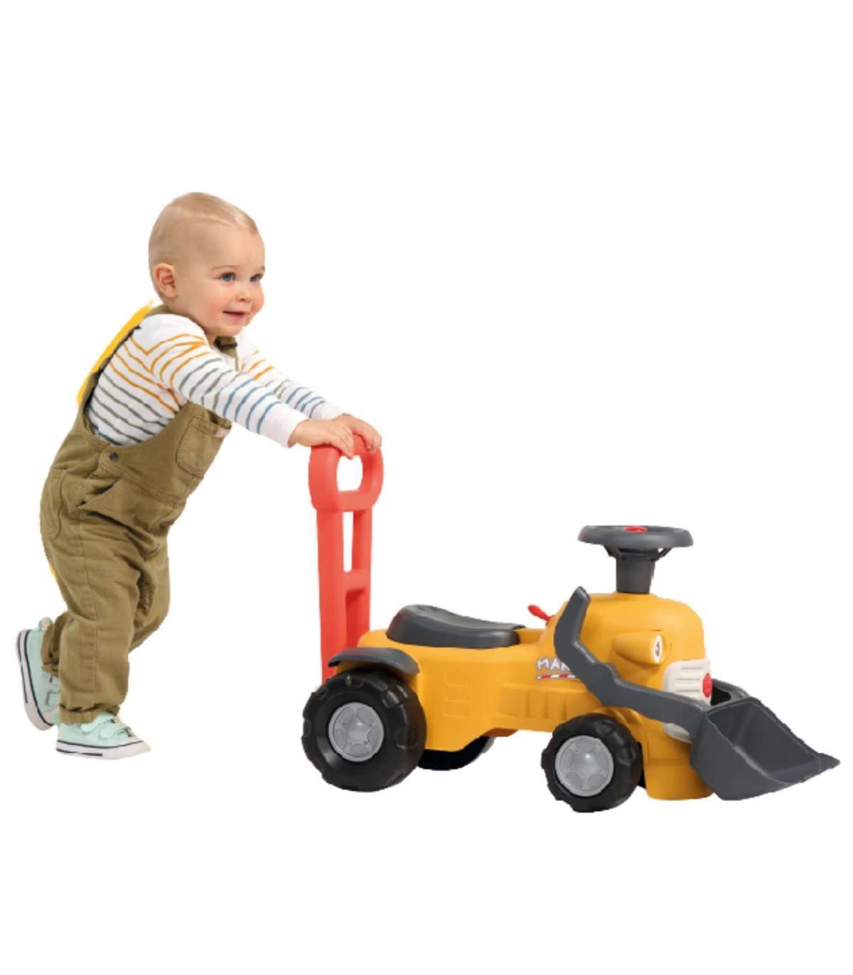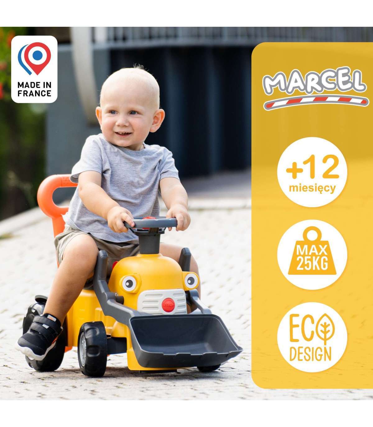Jeździk‑koparka Marcel marki FALK to pierwszy kompaktowy pojazd z działającą łyżką czołową, kierownicą z klaksonem i poręczną rączką do pchania, który zaprasza do zabawy w domu i na dworze już od 12 miesięcy. Stabilna konstrukcja i przemyślane detale – jak klikający kluczyk, skrętna kierownica i schowek pod siedziskiem sprawiają, że każda przejażdżka łączy ruch z odgrywaniem ról.