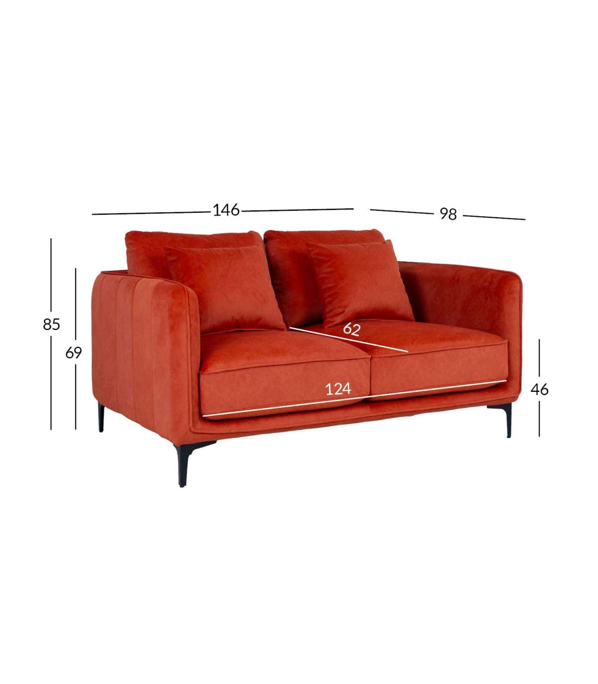 Diivani üldmõõdud on 146x98xH85cm. Istme laius 124cm, istme sügavus 62cm (ilma padjata 82cm), istme kõrgus 46cm. Käetoe kõrgus maast 69cm.