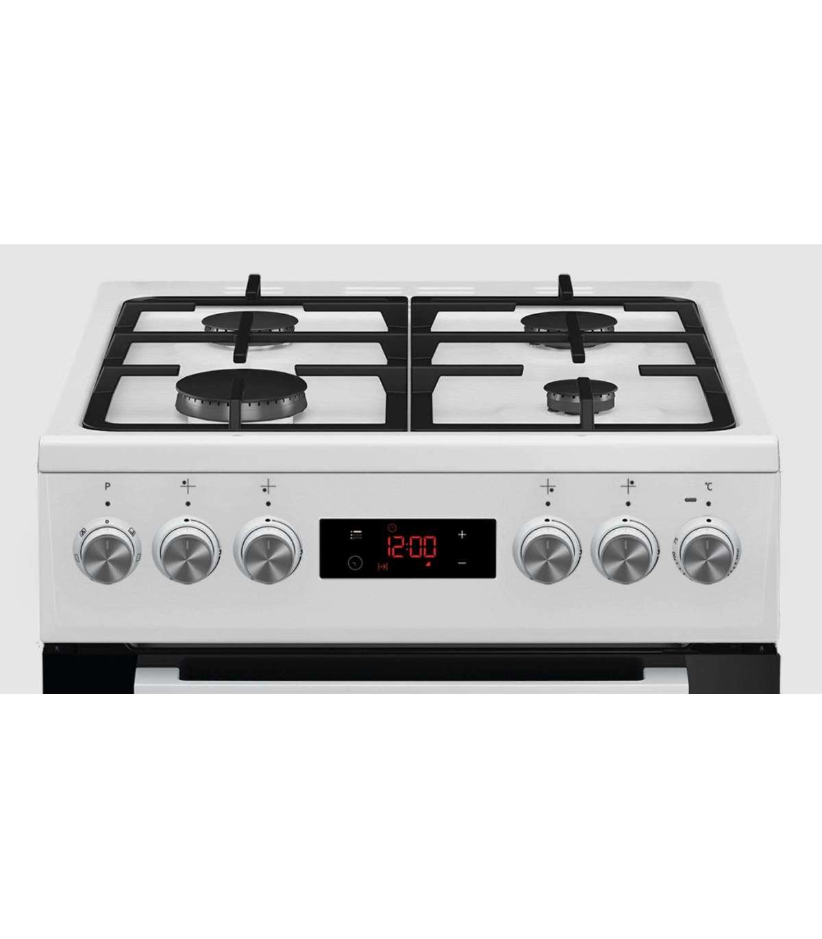 4 gaasipõletit, elektrisüüde integereeritud nupu alla, stopp-gaas süsteem, digitaalne programmi ekraan, elektriahi, lastelukk, enegiaklass A, ahjumaht 60 l, 8 funktsiooni (k.a sulatamine, 3D küpsetamine, grill), turbo küttekeha, seadmega kaasas 1 madalate äärtega pann ja võreriiul, sahtliga panipaik tarvikute hoidmiseks, värv: valge