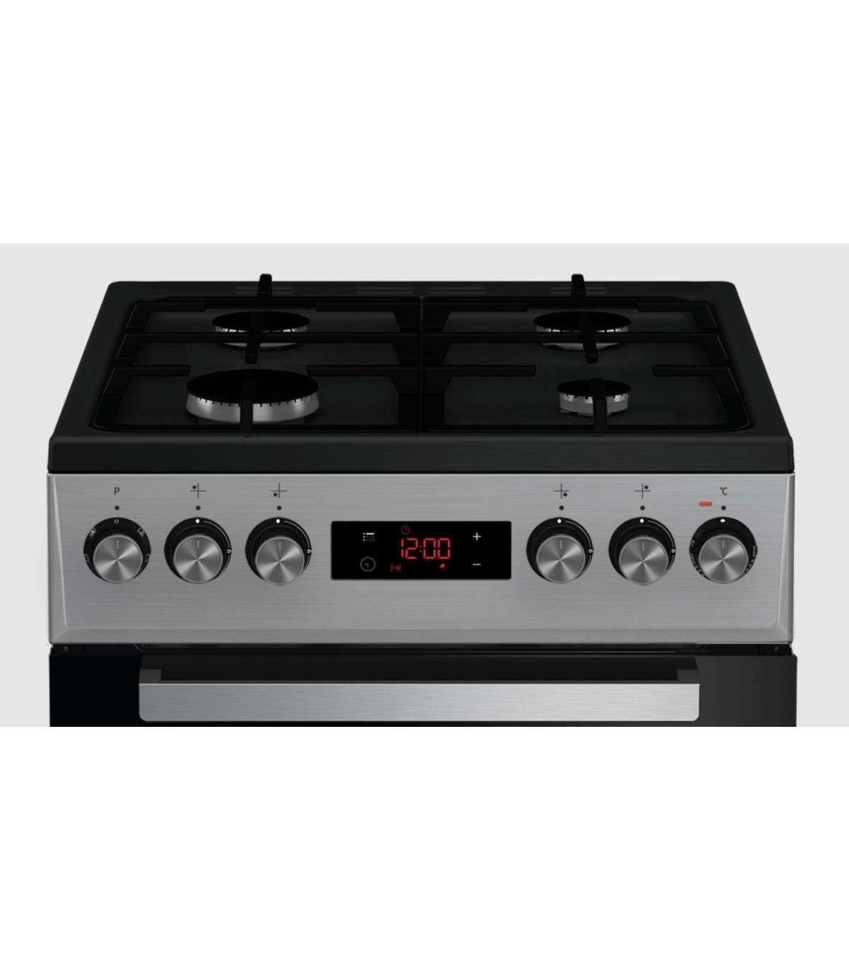 4 gaasipõletit, elektrisüüde integereeritud nupu alla, stopp-gaas süsteem, digitaalne programmi ekraan, elektriahi, enegiaklass A, ahjumaht 60 l, 8 funktsiooni (k.a sulatamine, 3D küpsetamine, grill), turbo küttekeha, teleskoopjuhik, seadmega kaasas 1 madalate äärtega pann ja võreriiul, värv: roostevaba teras