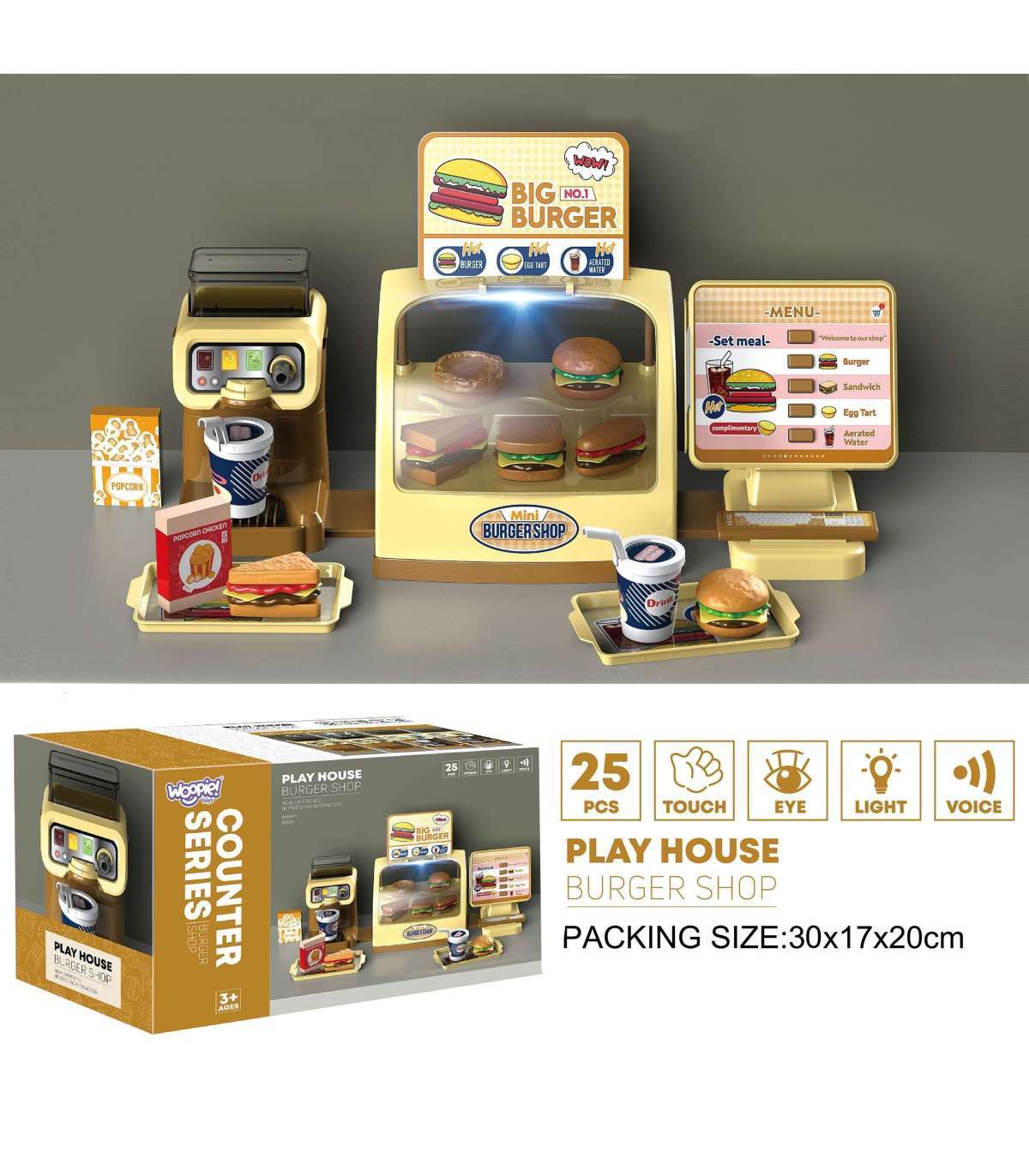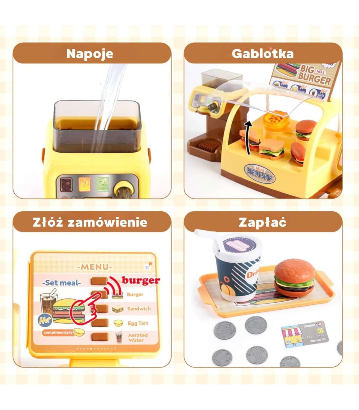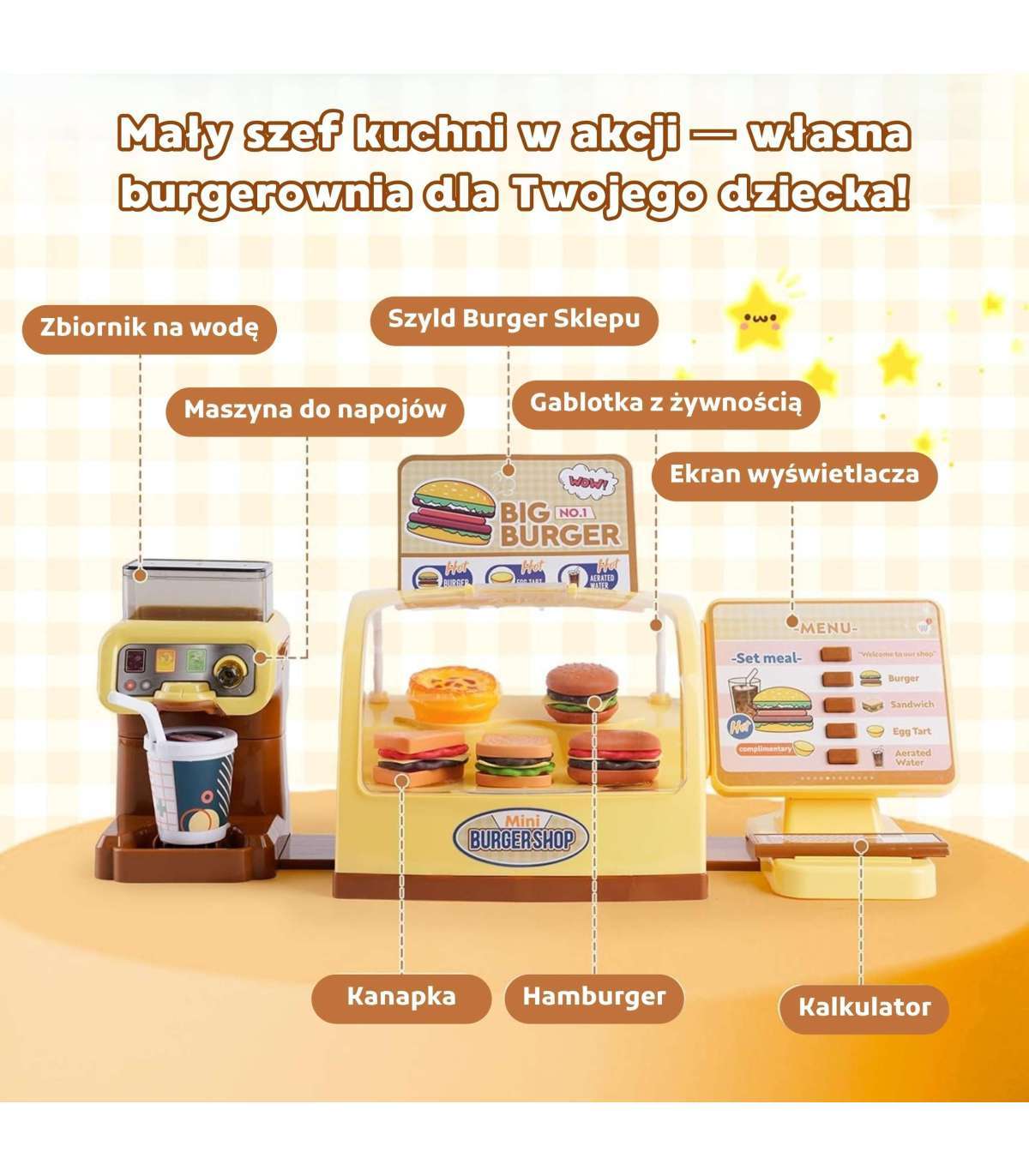 Mini Burger Shop "BIG BURGER" brändilt WOOPIE on suurepärane mängukomplekt. Saame teenindada kliente, kes valivad toite otse valgustatud leti pealt! Sellel on ekraan nuppudega, mille vajutamisel mängib pood heli-efekte! Saame vett valada jaoturisse ja kallata seda spetsiaalsetesse kruusidesse koos kõrrega. Komplekt arendab peenmotoorikat, kujutlusvõimet, loovust ja iseseisvat mõtlemist.