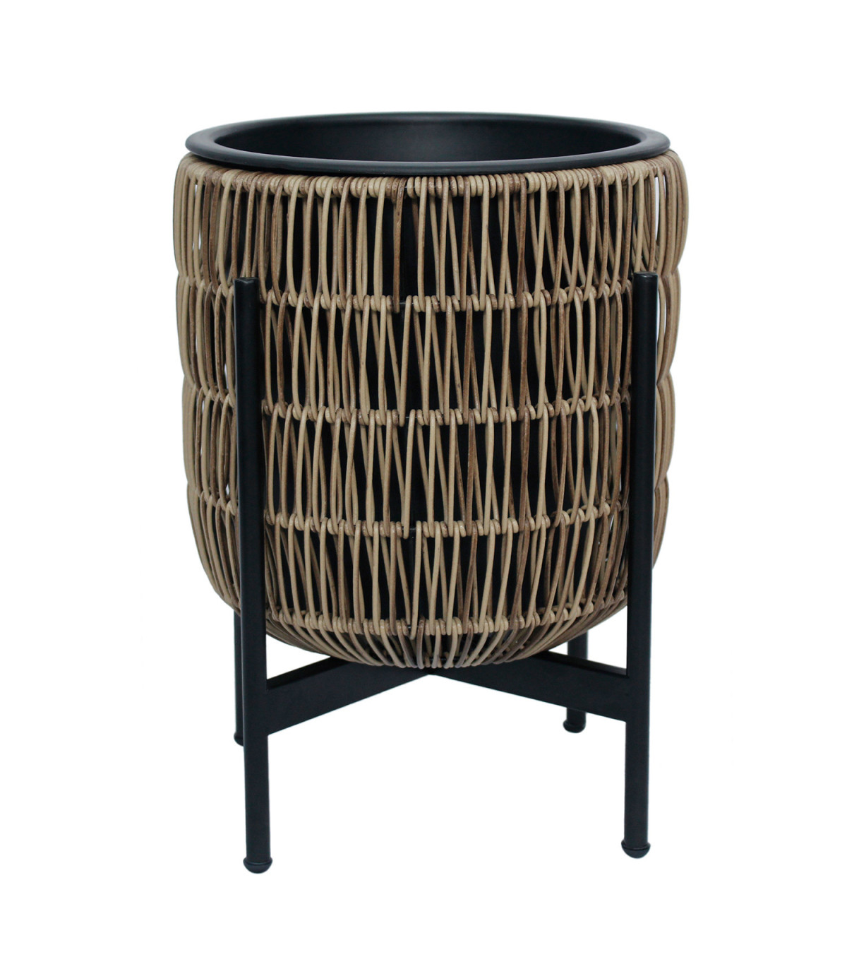 Lillepott WICKER alusega 30x30xH38cm, helepruun. Lillepoti metallraam on kaetud plastikpunutisega. Lillepoti mõõdud on D27xH28cm. Plastikust sisepoti mõõdud on D23xH23cm. Sisepott on ilma auguta. Komplekti kuulub must metallist alusraam.