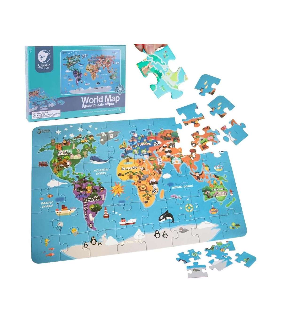 Zabierz swoje dziecko w fascynującą podróż dookoła świata. Drewniane puzzle Mapa Świata od CLASSIC WORLD to edukacyjna zabawka, która wciągnie każdego małego odkrywcę na długie godziny. Zestaw składa się z 48 elementów z żywymi, szczegółowymi ilustracjami, które układają się w kolorową mapę kontynentów. Podczas dopasowywania kolejnych fragmentów maluch rozwija swoją wyobraźnię, zdolności manualne oraz poznawcze. To świetny sposób na naukę przez zabawę a dzięki wysokiej jakości wykonania i bezpiecznym materiałom, rodzice mogą być spokojni o bezpieczeństwo dziecka.