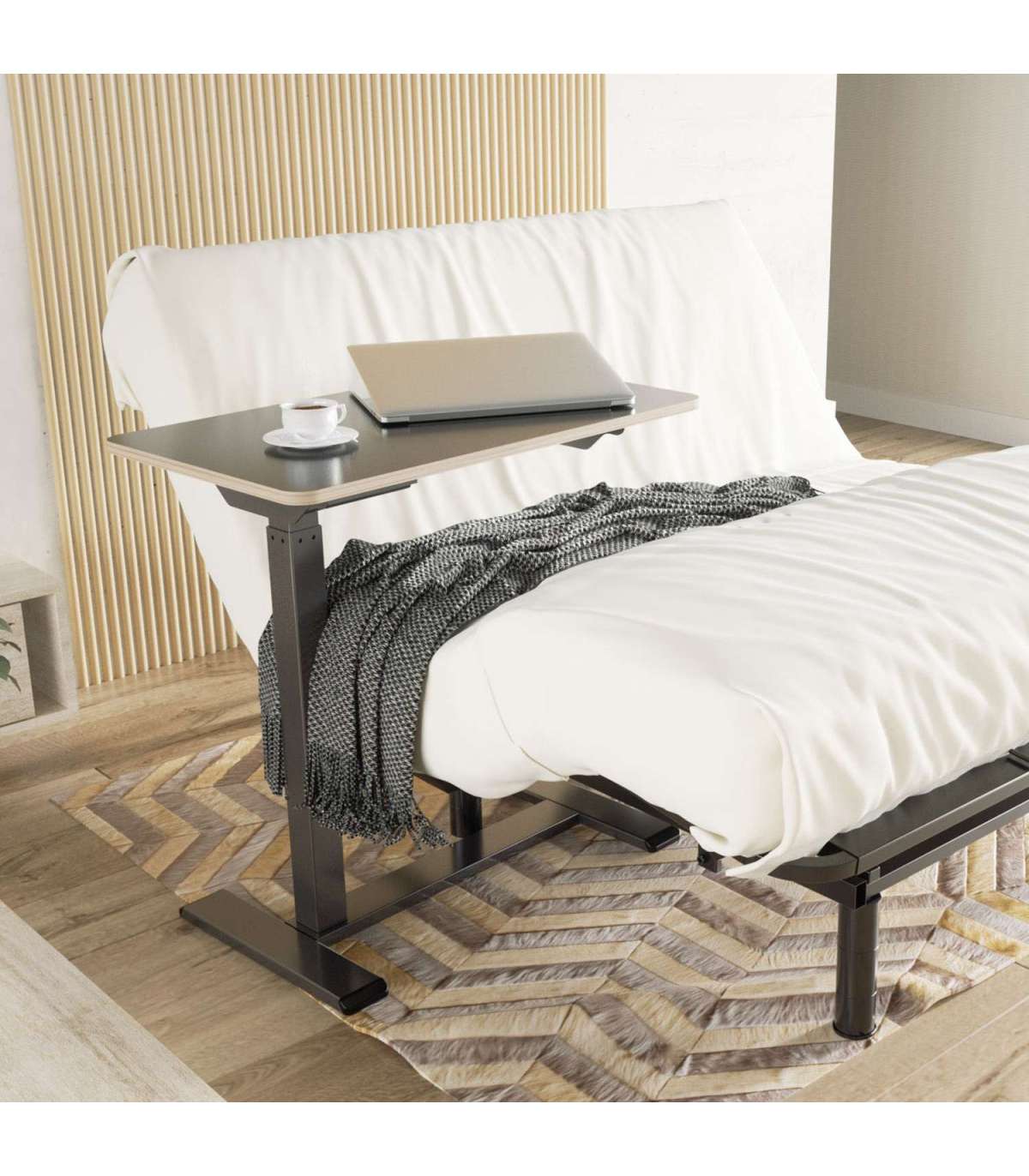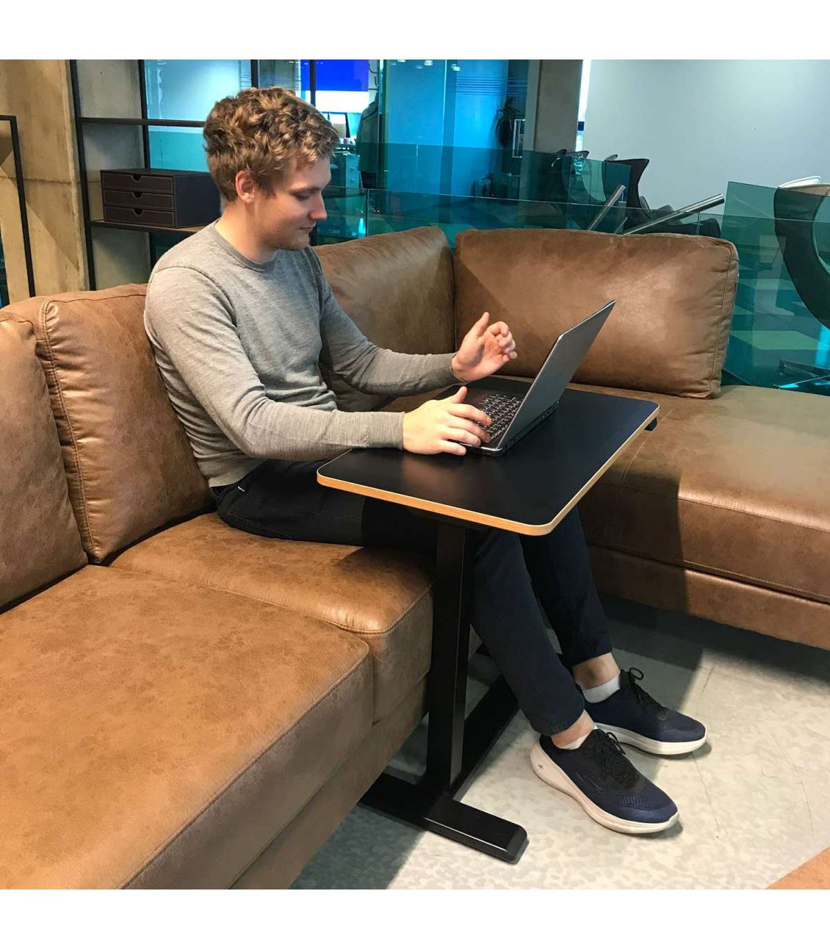 Tänu peidetud ratastele on töölaud lihtsalt teisaldatav ja C-jalg võimaldab paigutada laua nii, et tööd teha võib ka voodis või diivanil istudes.