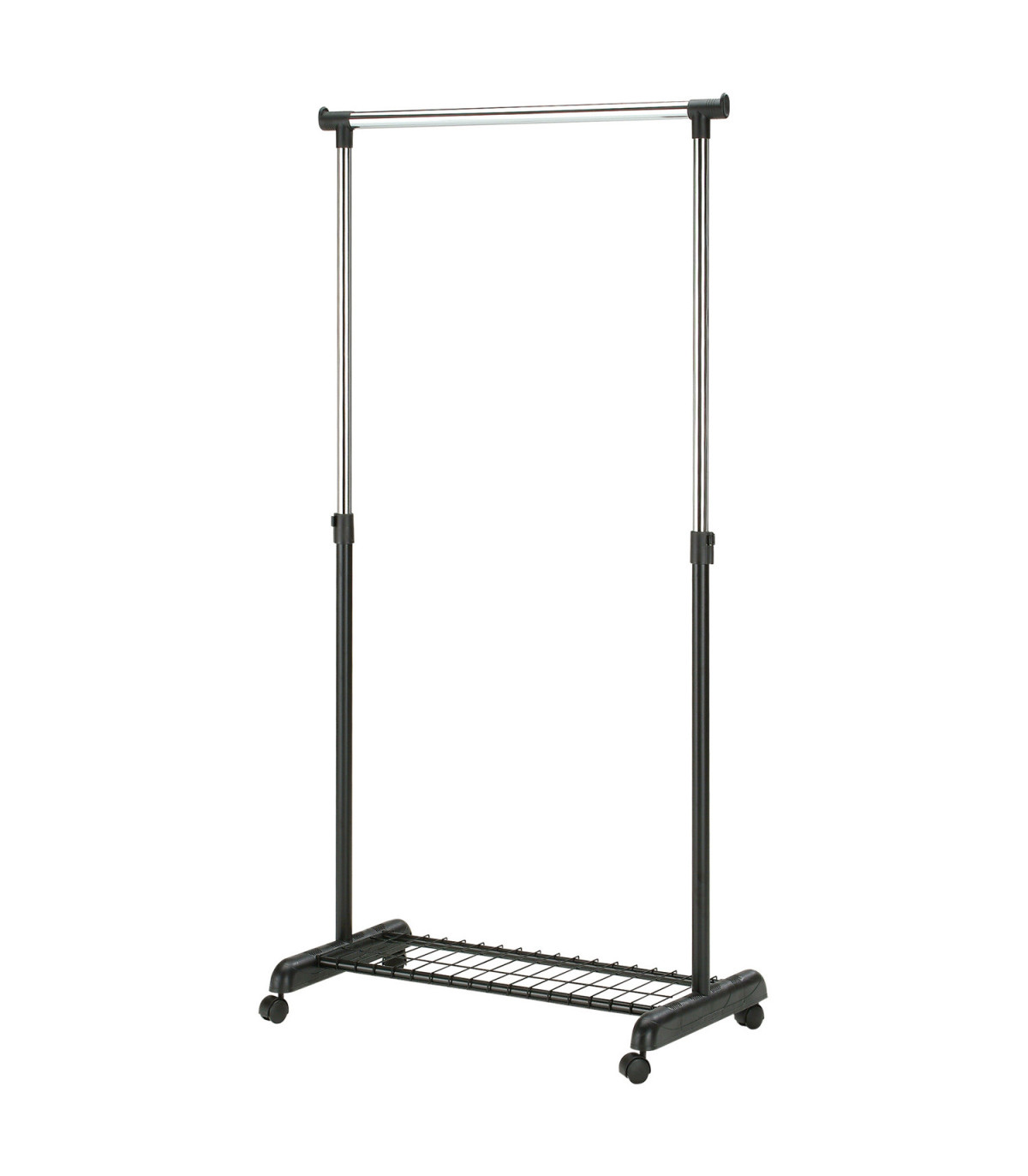 Stange FRANK 83x43xH93,5-168cm, must/kroom. Ratastel liikuv, reguleeritava kõrgusega stange on lihtne ja praktiline lahendus riiete ja jalanõude organiseerimiseks. Stange alusraam on valmistatud mustast plastikust, küljepostid ja riputustoru on valmistatud kroomitud terasest. Stange alumises osas on jalatsirest. Kandevõime 15kg.